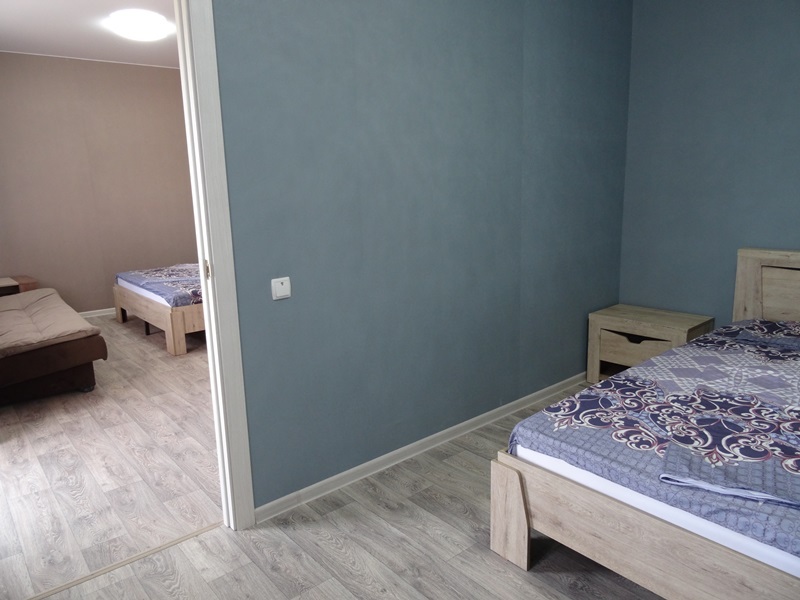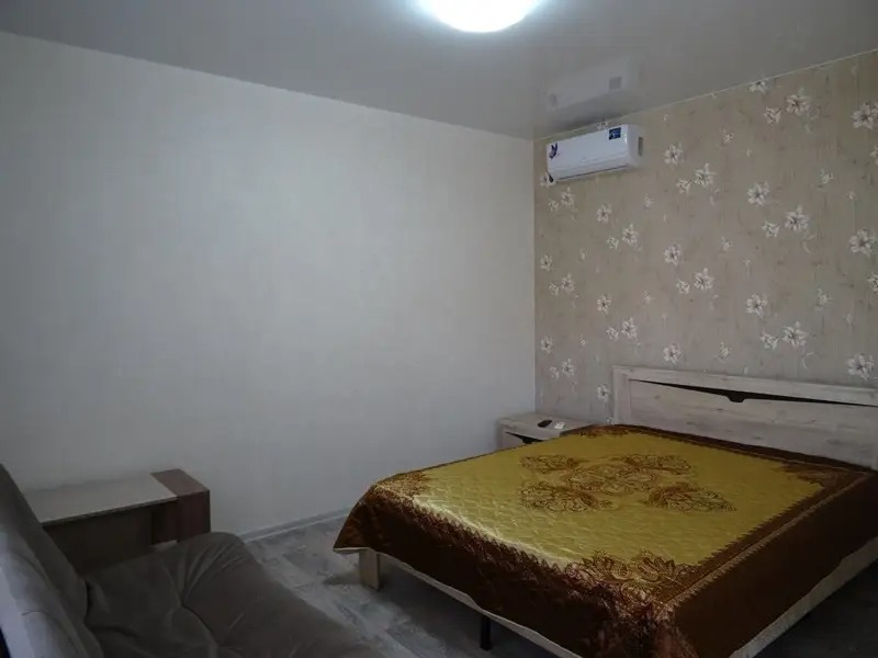 В комнате: односпальные и двуспальная кровати, кресло-кровать, шкаф, стулья, прикроватные тумбочки, журнальный столик, вешалка, зеркало, сплит-система, телевизор, спутниковое ТВ, интернет, холодильник, электрочайник, посуда.
