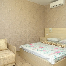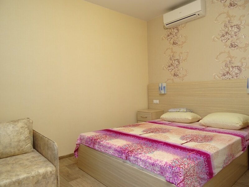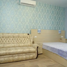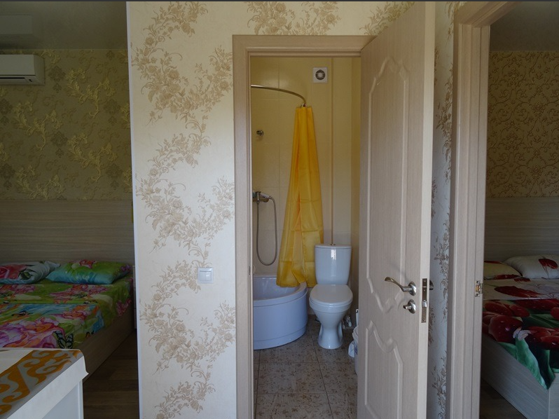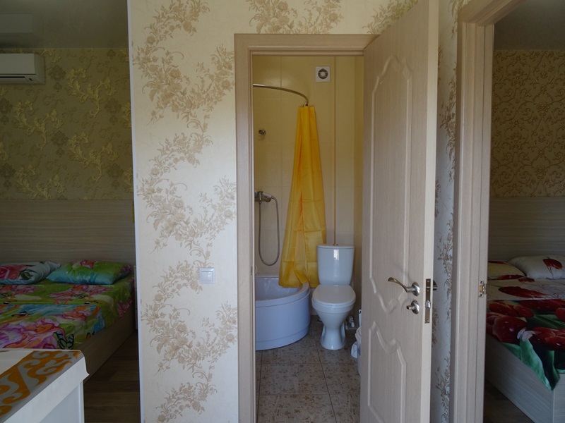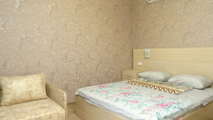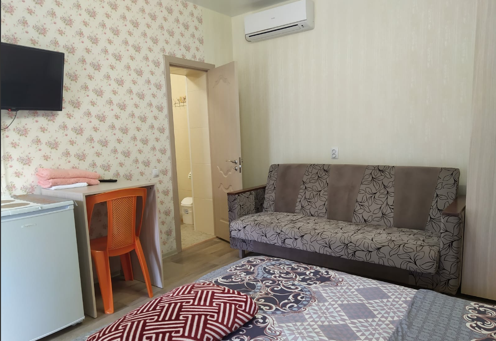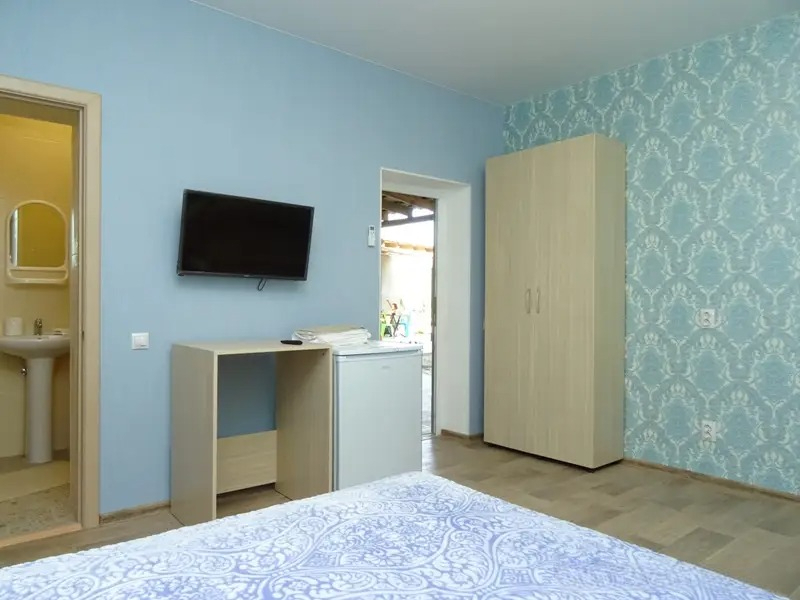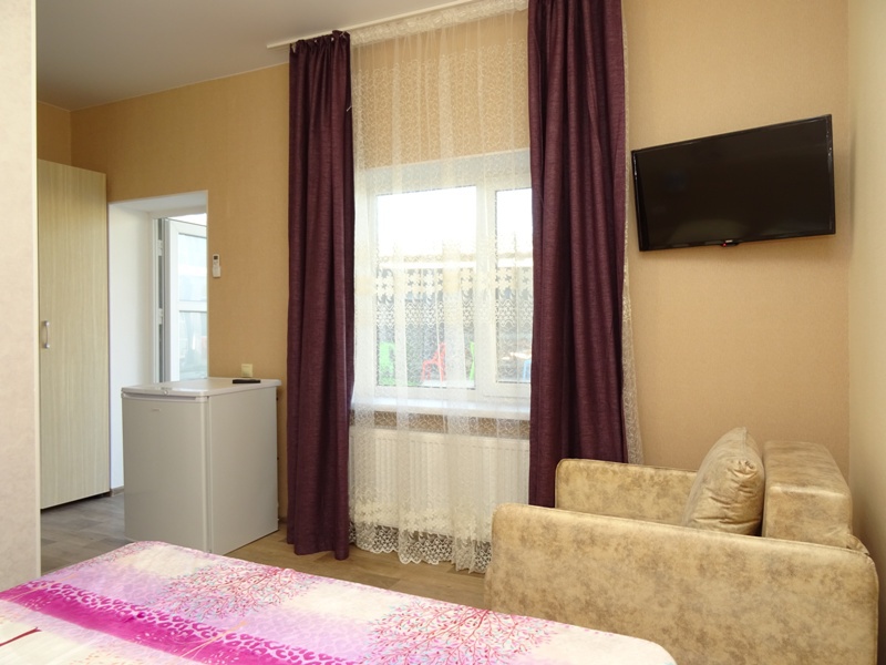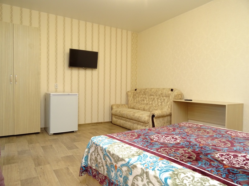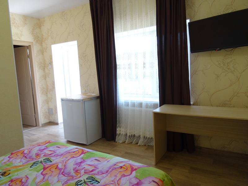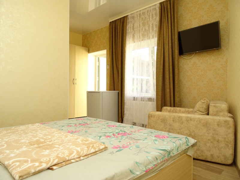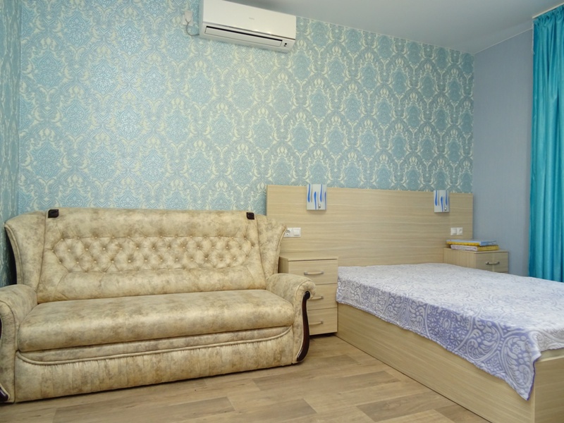 В номере: односпальные или двуспальная кровати, диван-кровать, шкаф, стулья, прикроватные тумбочки, журнальный столик, вешалка, зеркало, сплит-система, телевизор, спутниковое ТВ, интернет, холодильник, электрочайник, посуда, балкон. Санузел в номере.