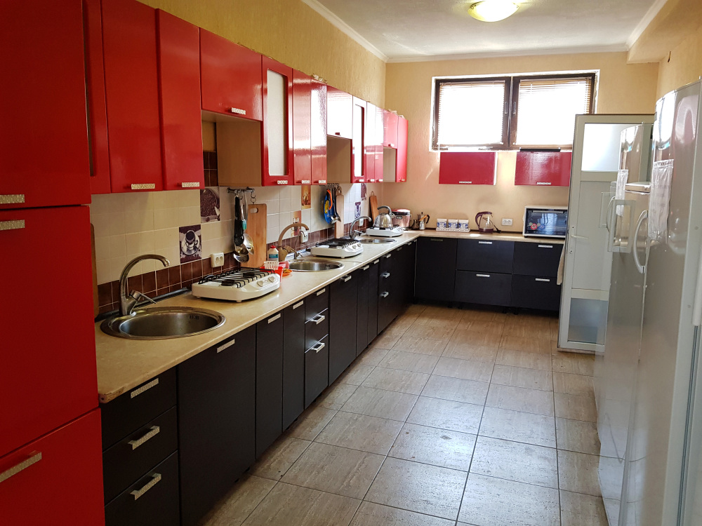 Двуспальная кровать (2х1,4м), раскладной диван, двухэтажная кровать (или односпальная кровать), прикроватные тумбочки, шкаф для вещей, комод, кондиционер,телевизор, микроволновая печь, холодильник, Wi-Fi, санузел с круглосуточной горячей и холодной водой, оборудована летняя терраса с мебелью