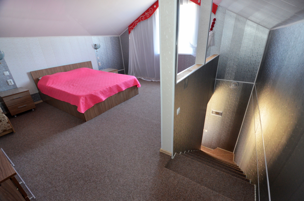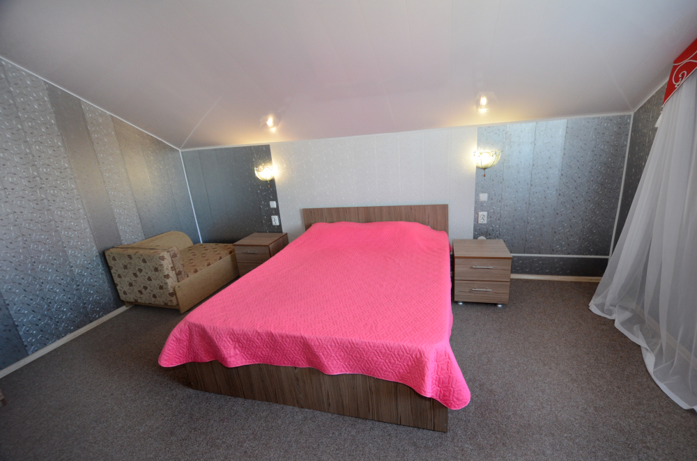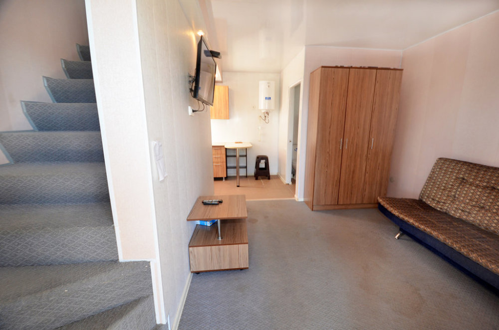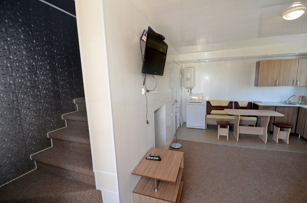 В коттедже на первом этаже находится гостиная, кухня и санузел, а на втором этаже просторная спальня. В коттедже есть кухонный гарнитур, микроволновка, электроплитка, чайник, холодильник, посуда, телевизор, Wi-Fi, кондиционер. Коттедж вмещает до 5 человек. На территории есть просторная беседка с мангалом, летней кухней, диваном и русская баня. Двухэтажные коттеджи полностью оборудованы под ключ для проживания одной семьи.