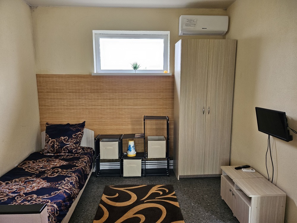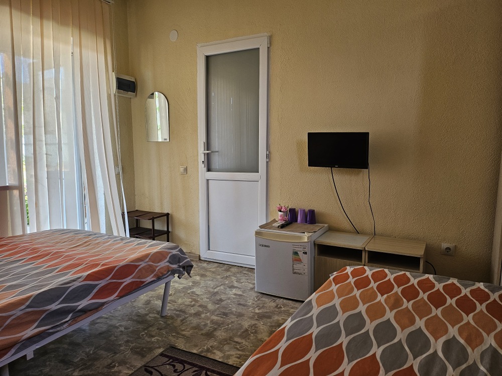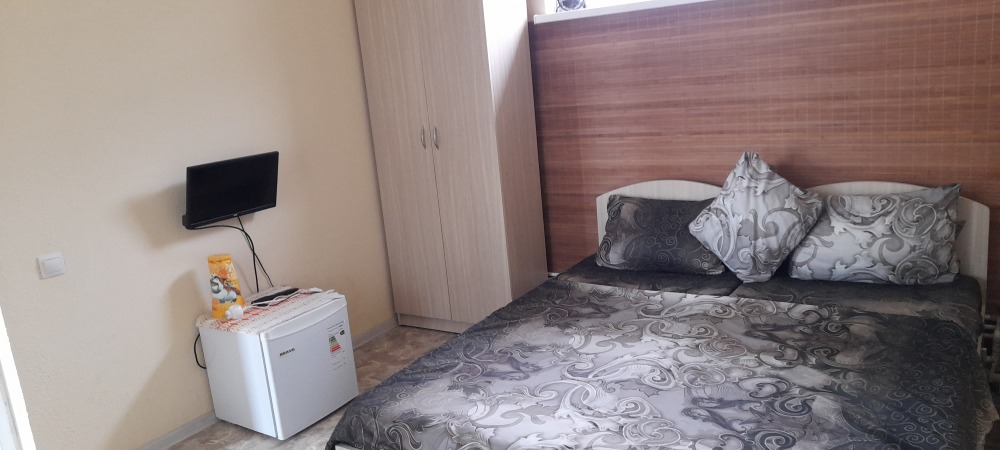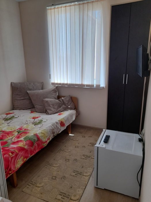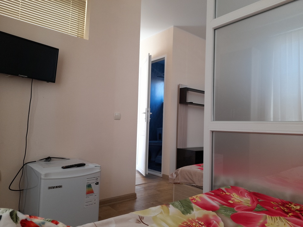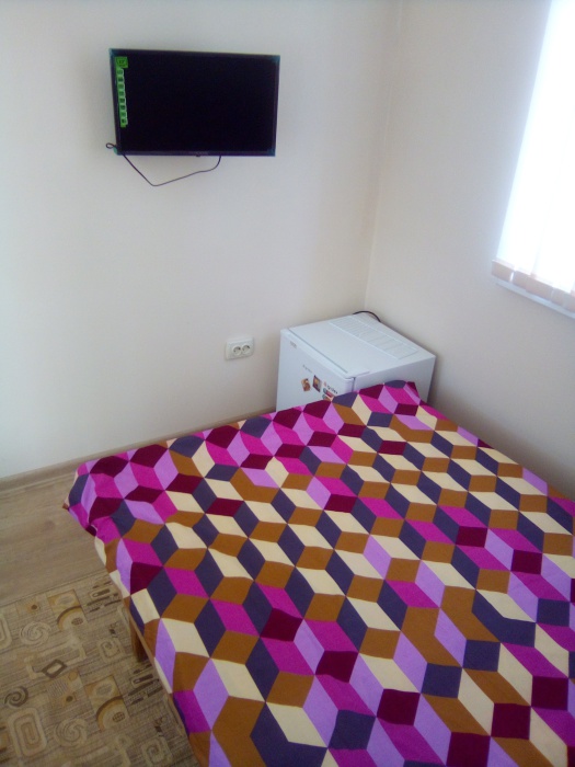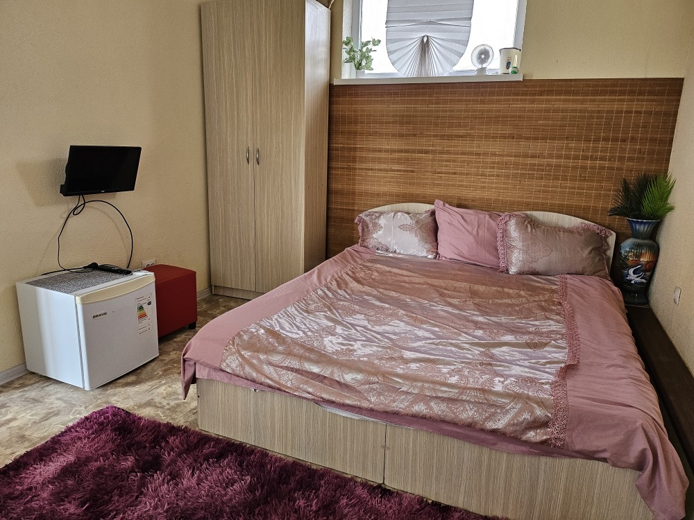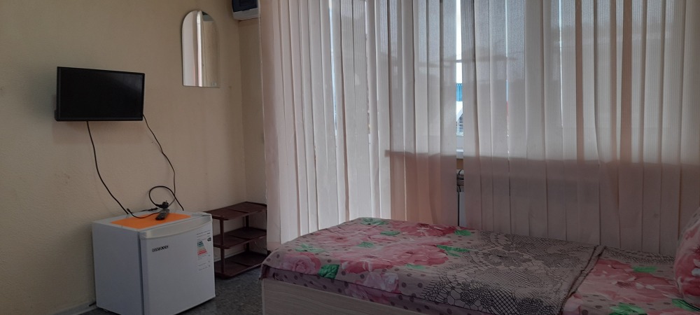 В номере телевизор, холодильник, интернет, кондиционер, электрочайник, шкаф для хранения вещей. В номере все удобства, постельное белье, полотенца, посуда-предоставляем. Свой санузел в номере-горячая, холодная вода-круглосуточно.