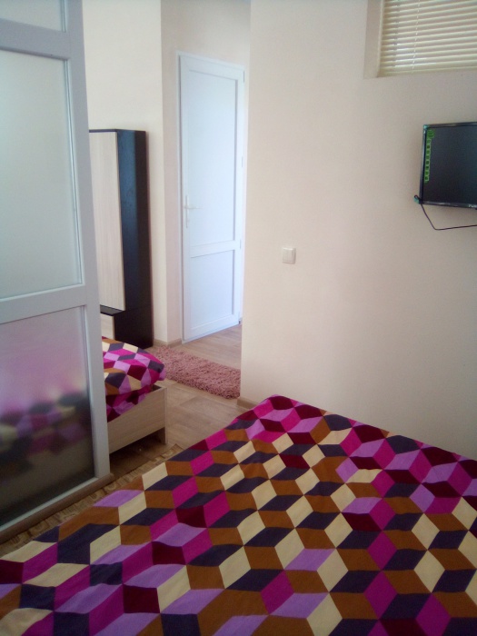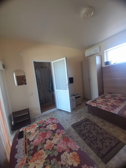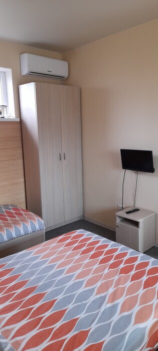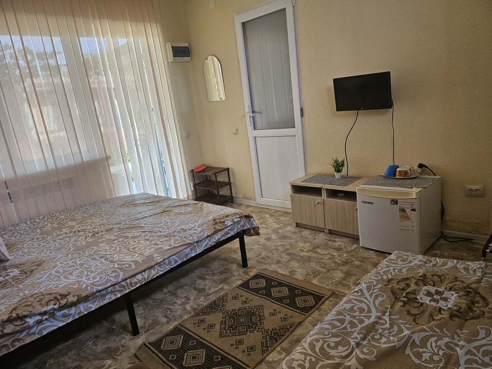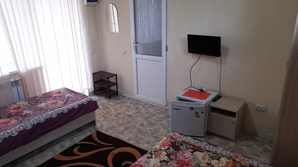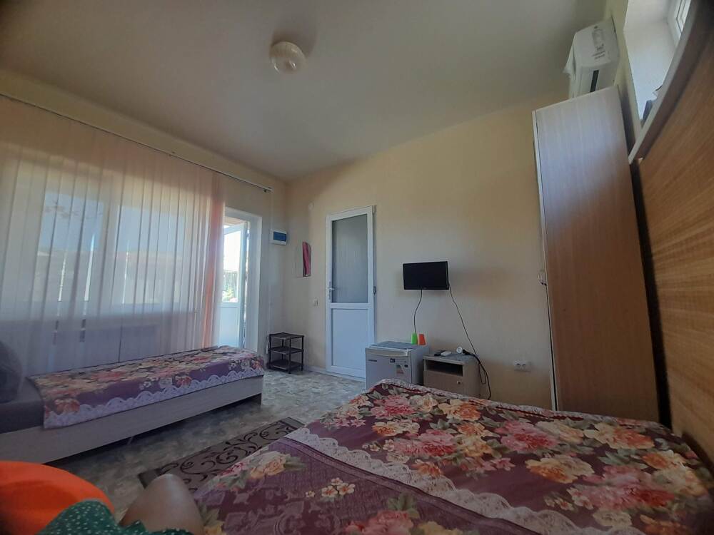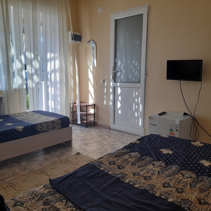 Номер оснащен всем необходимым для комфортного проживания во время отдыха в Крыму. В номере 2 телевизора, кондиционер, чайник, утюг, фен. Каждая комната имеет удобные кровати с ортопедическим матрасом, холодильник. Горячая и холодная вода круглосуточно. Рядом с номером терраса, для приятного отдыха на воздухе, с удобным гамаком, летним столиком+стулья.