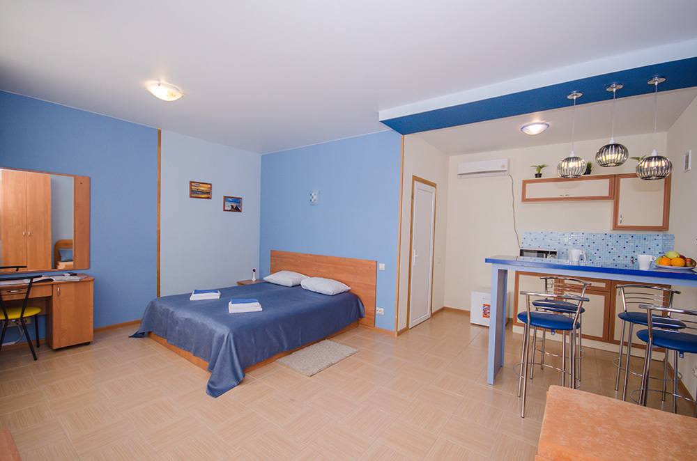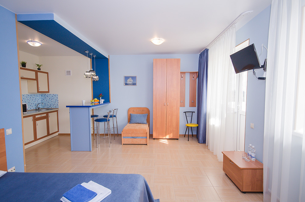 Рядом с номерами категории «Студия» расположена просторная открытая площадка-солярий с лежаками и летней мебелью. В номерах установлена мини-кухня и барная стойка.