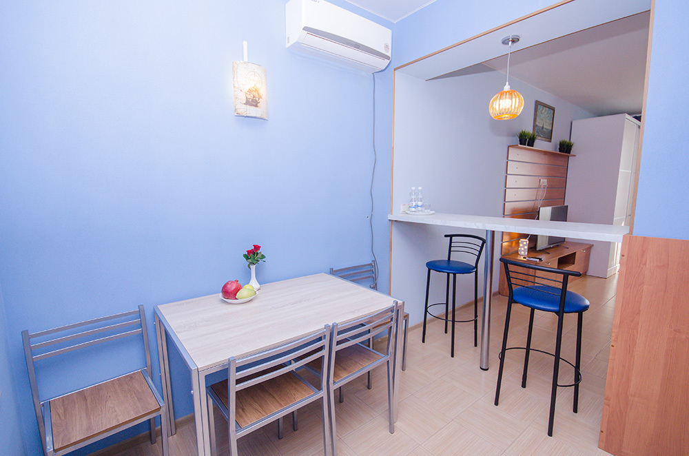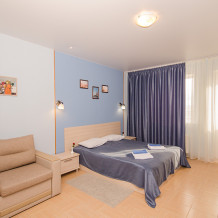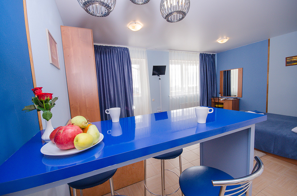 «Апартамент с мини-кухней» – 2-х местный номер. Возможность размещения трёх дополнительных мест. Номер 2-х комнатный и расположен на 3 этаже.