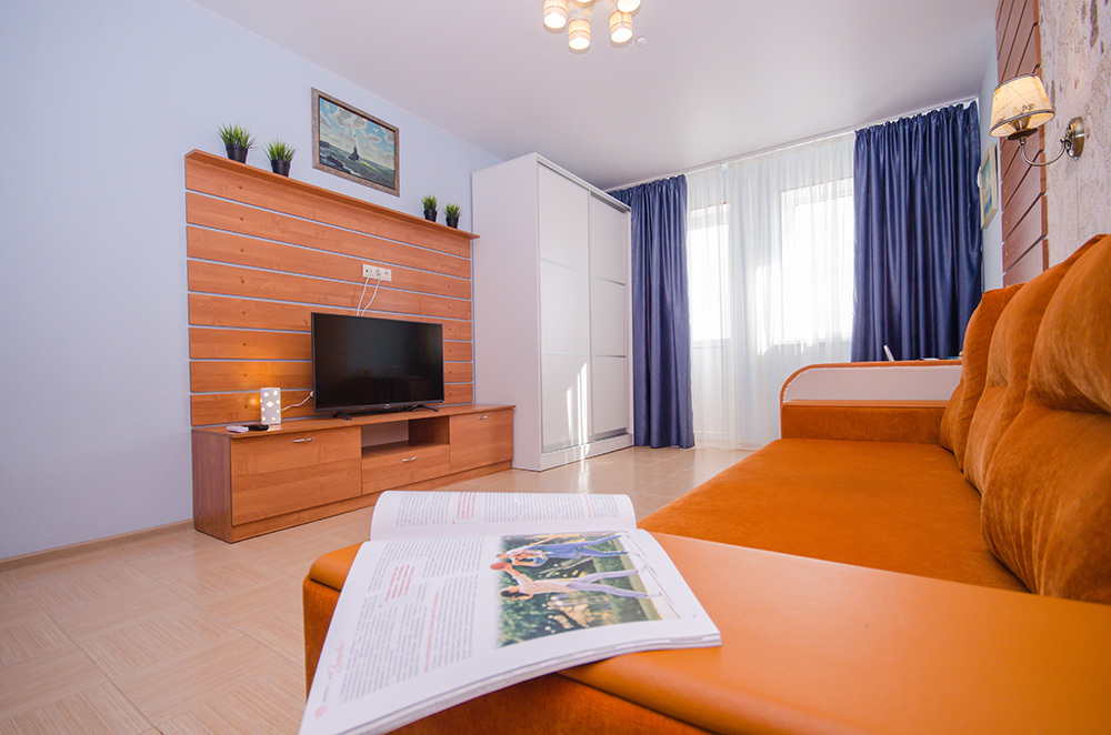 - гостиная: прихожая, трюмо, зеркало, мини-кухня, обеденный стол с 4-мя стульями, барная стойка, барные стулья, раскладной двуспальный диван, шкаф-купе, тахта, стол, стул, тумба под телевизор с полками, балкончик, кондиционер, телевизор, холодильник