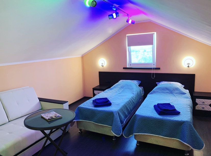 На втором этаже: диван двухспальный,столик,две кровати односпальные,пастельное белье,прикроватные тумбы,светильники,WI-FI
