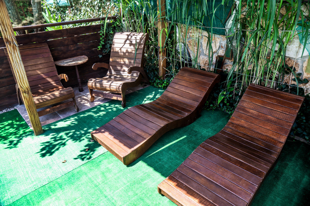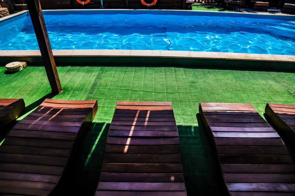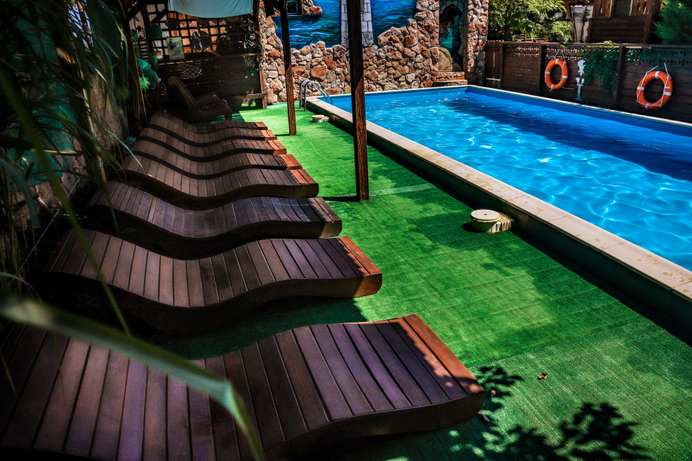 - Бассейн с террасой для загара и шезлонгами