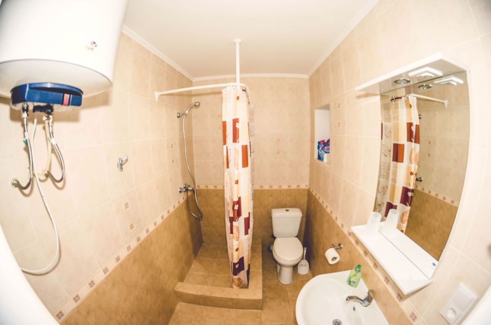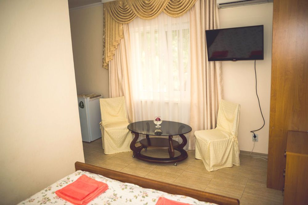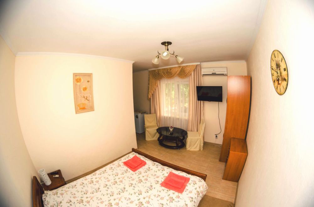 В каждой комнате: туалетная комната (душ с холодной и горячей водой, раковина, унитаз), 2-спальная кровать, платяной шкаф, телевизор, холодильник, кондиционер, обогреватель.