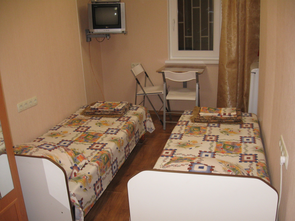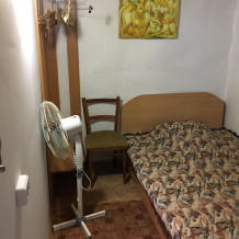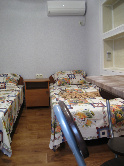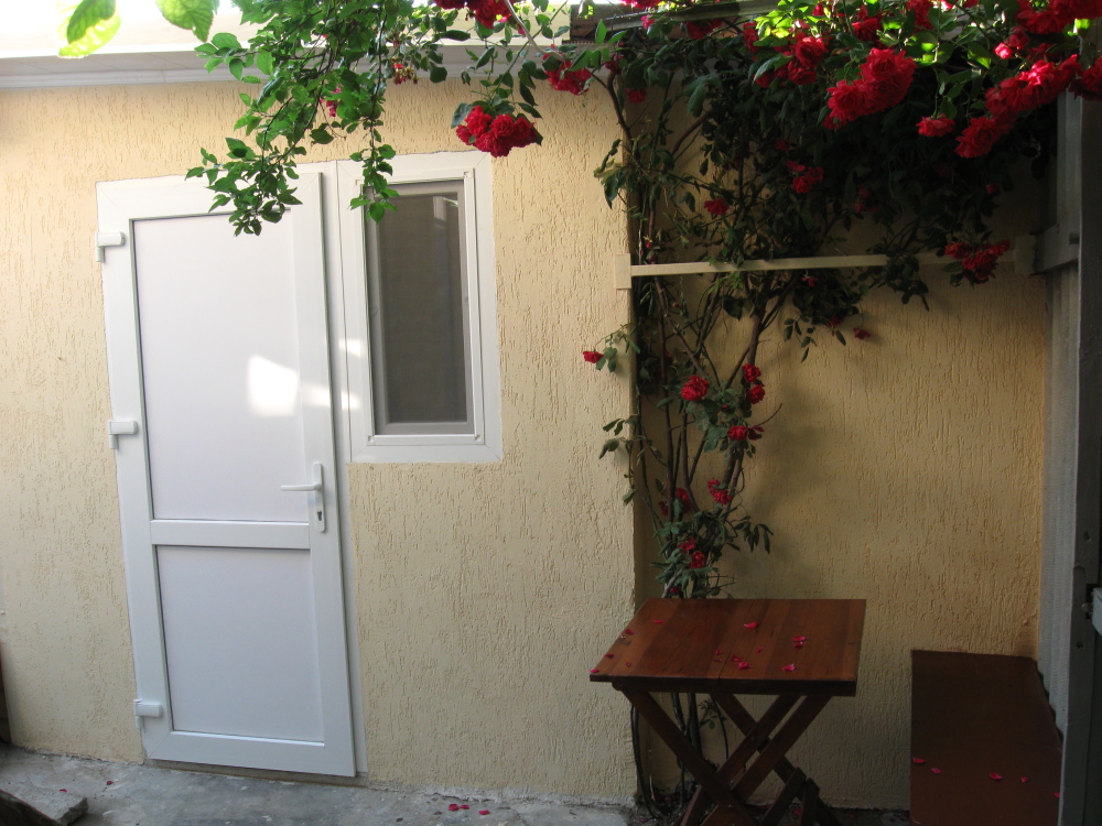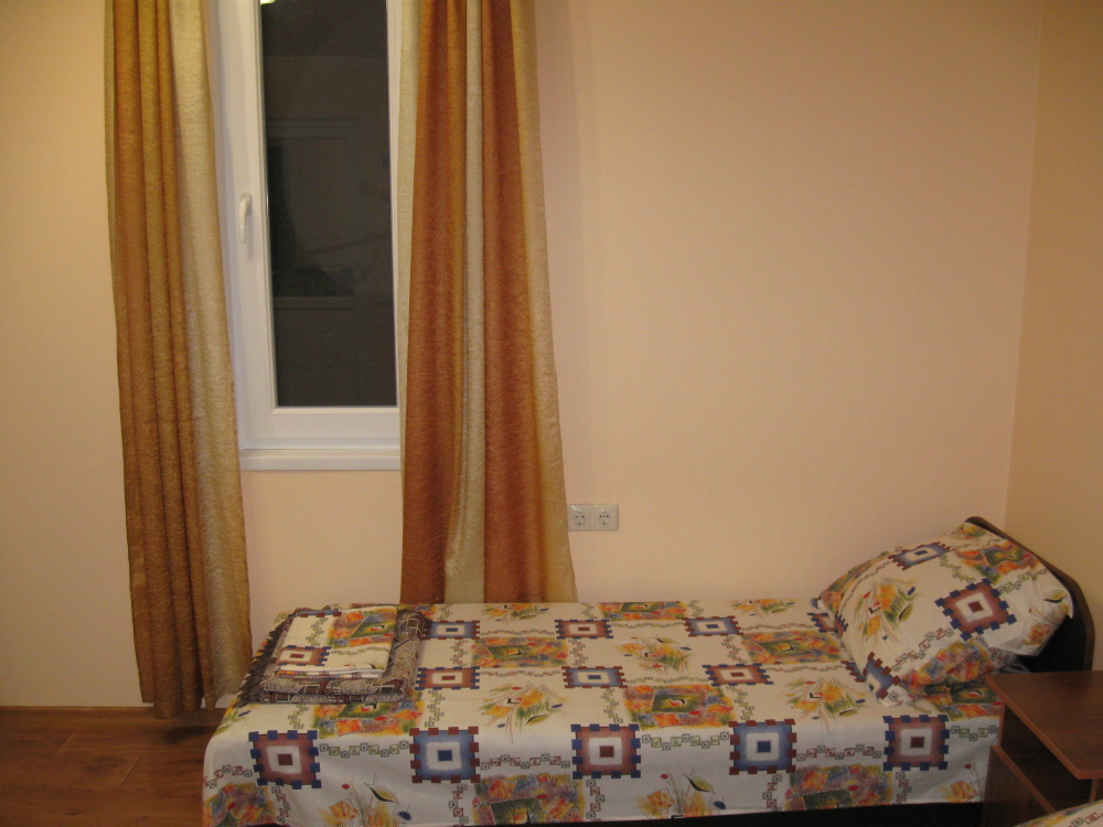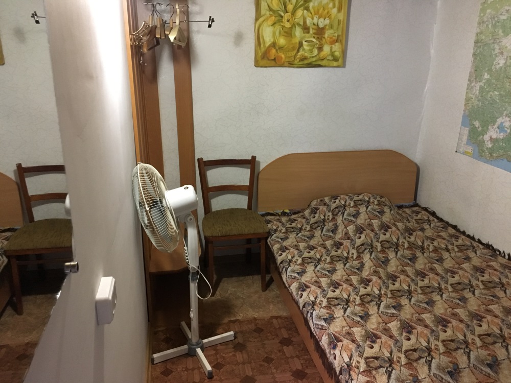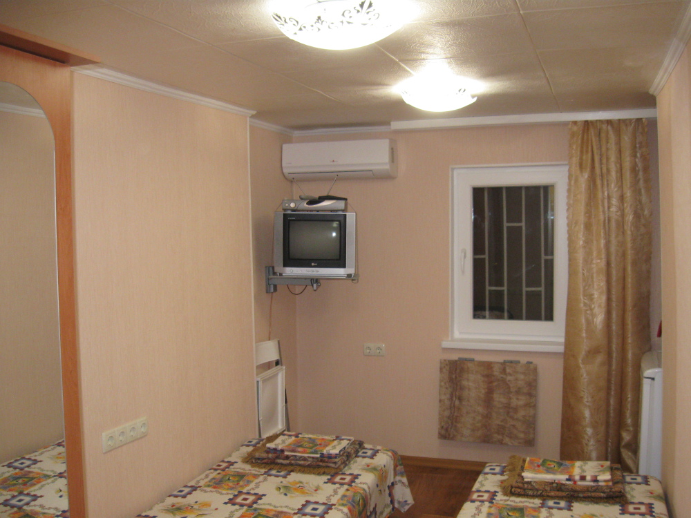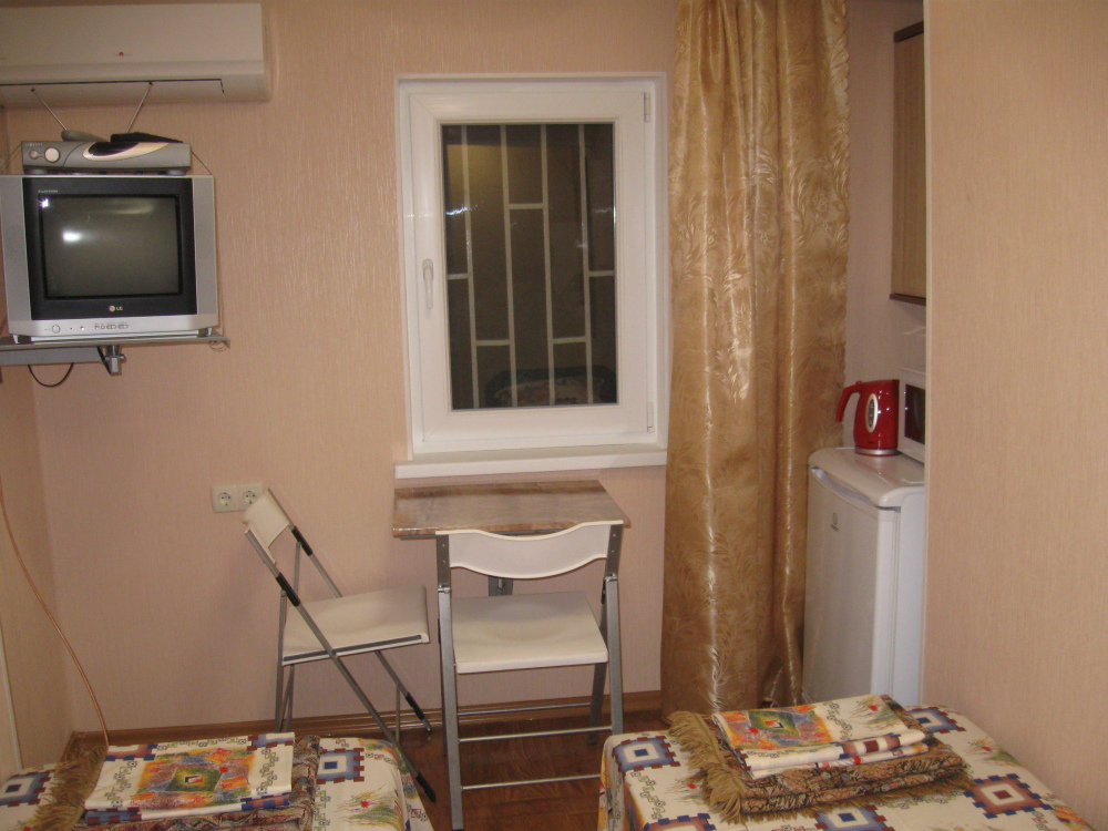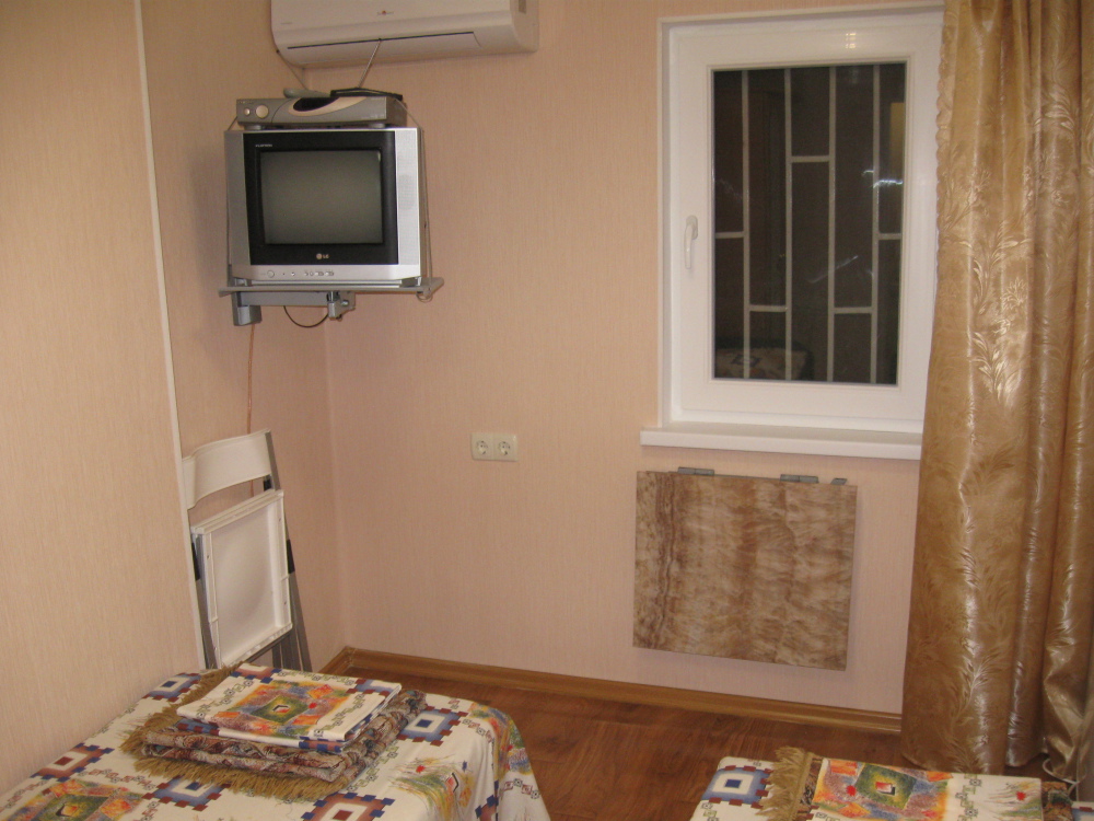 В комнате: одна кровать шириной 120 см, вторая кровать шириной 75 см, телевизор (кабельное телевидение 72 канала), бесплатный интернет Wi-Fi, вентилятор, два открывающихся окна, зеркало, три розетки, вешалка для одежды, 2 стула, 2 тумбочки. На полу линолеум. Комната узкая, шириной 1,5 метра, но длинная - 5 метров, как лоджия. Удобства во дворе (душ, 2 туалета), горячая и холодная вода круглосуточно. Душем, туалетами и холодильником кроме Вас будет пользоваться еще только один человек. Во дворе - общая летняя кухня с газовой плитой на 4 конфорки, с большим холодильником и всей посудой.