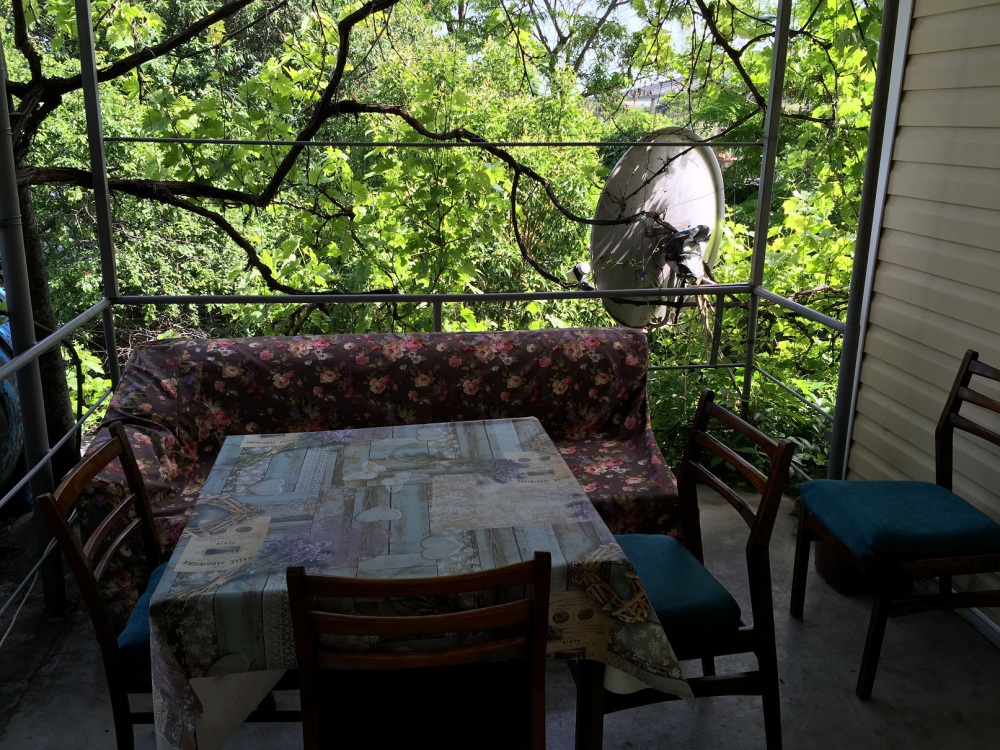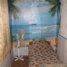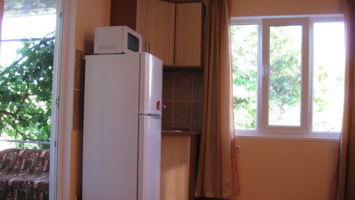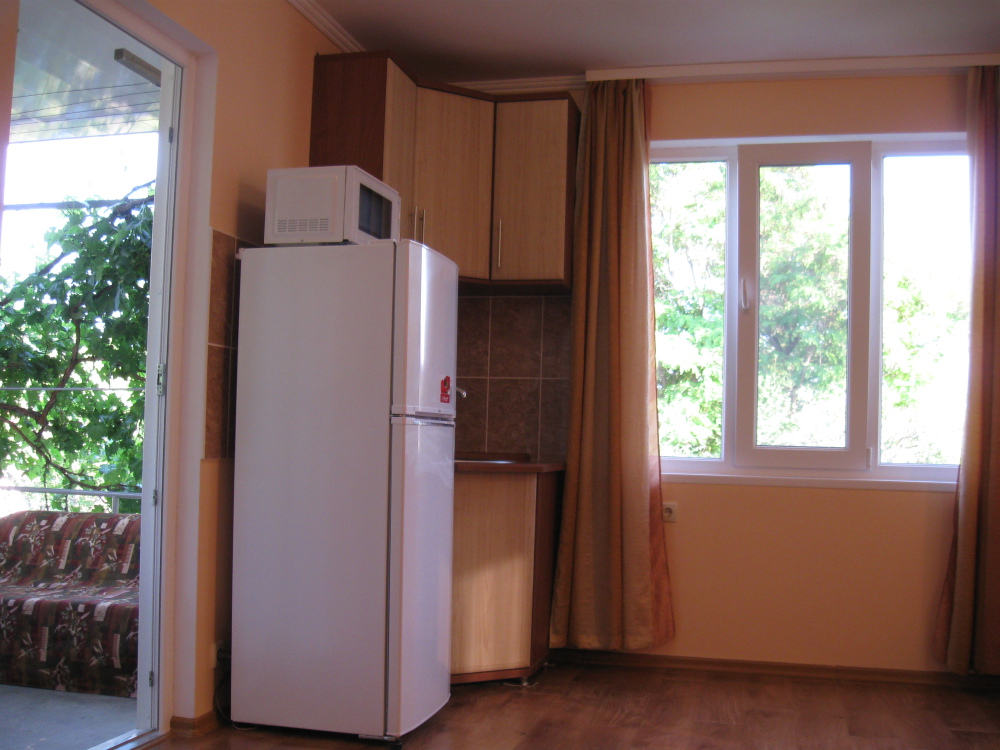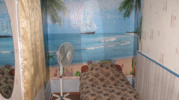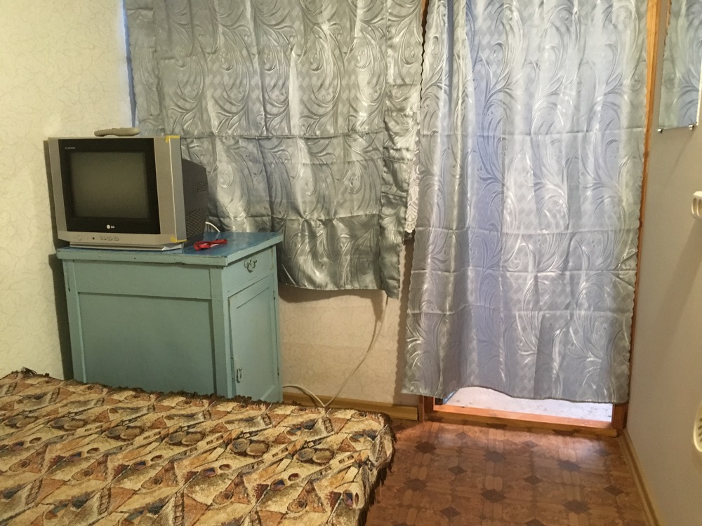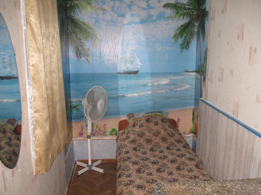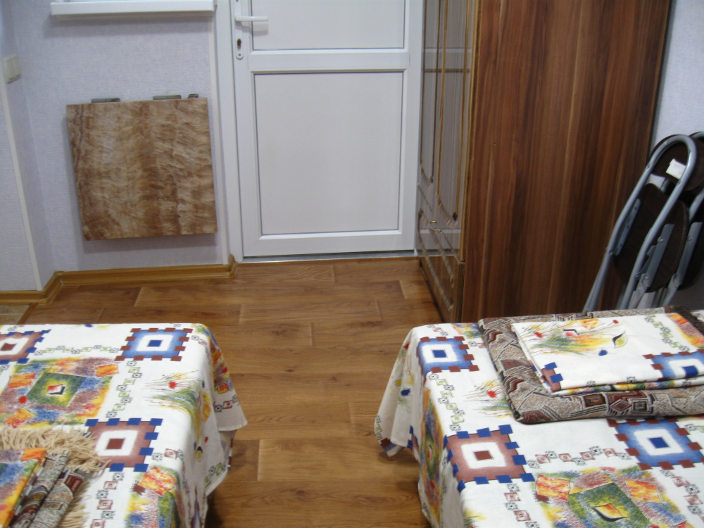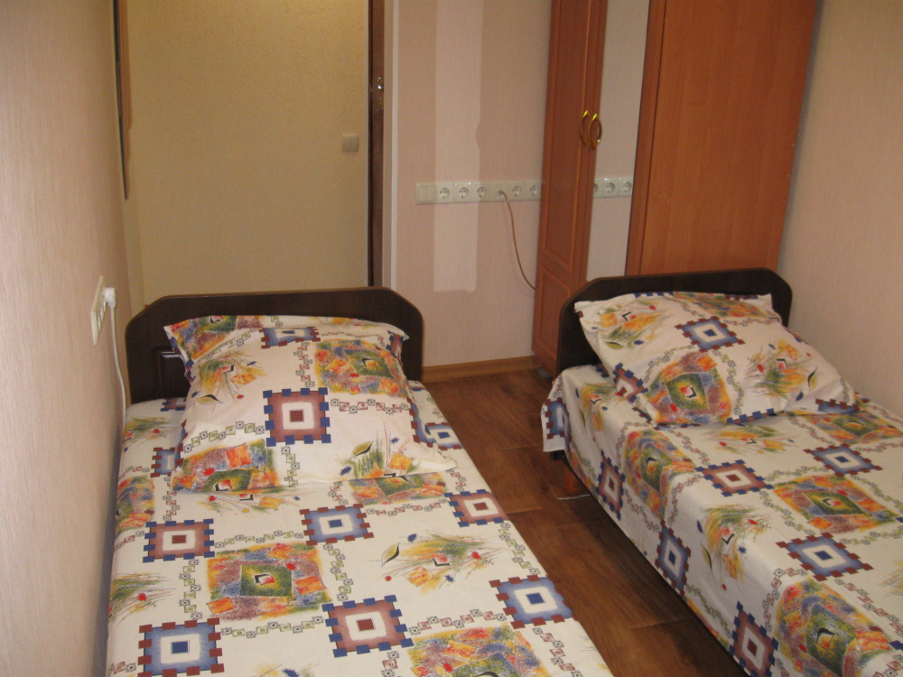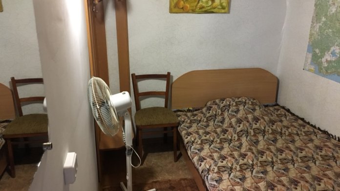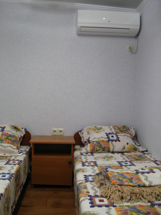 В комнате: одна кровать шириной 120 см, вторая кровать шириной 75 см, телевизор (кабельное телевидение 72 канала), бесплатный интернет Wi-Fi, вентилятор, два открывающихся окна, зеркало, три розетки, вешалка для одежды, 2 стула, 2 тумбочки. На полу линолеум. Комната узкая, шириной 1,5 метра, но длинная - 5 метров, как лоджия. Удобства во дворе (душ, 2 туалета), горячая и холодная вода круглосуточно. Душем, туалетами и холодильником кроме Вас будет пользоваться еще только один человек. Во дворе - общая летняя кухня с газовой плитой на 4 конфорки, с большим холодильником и всей посудой.