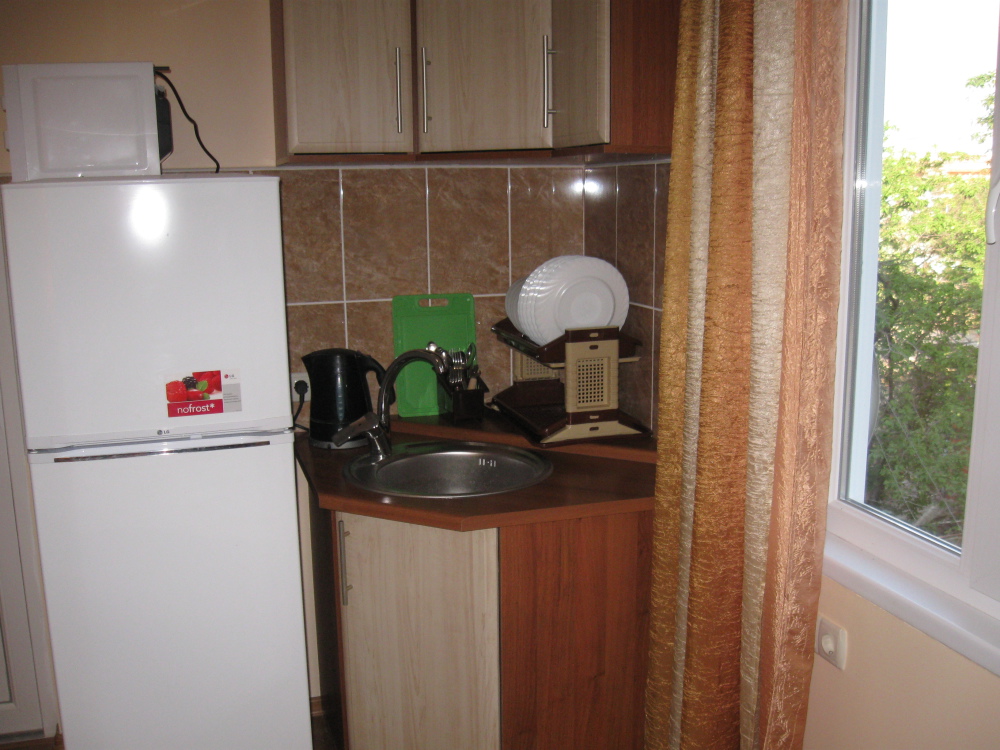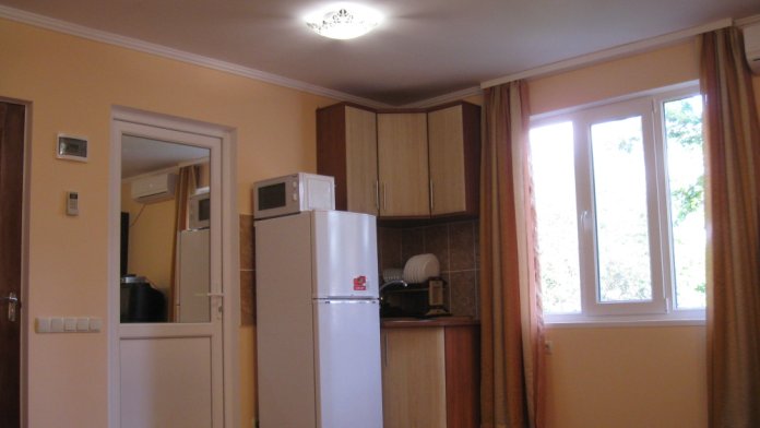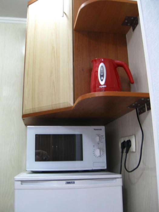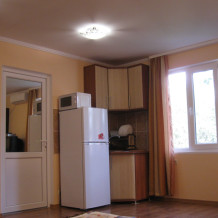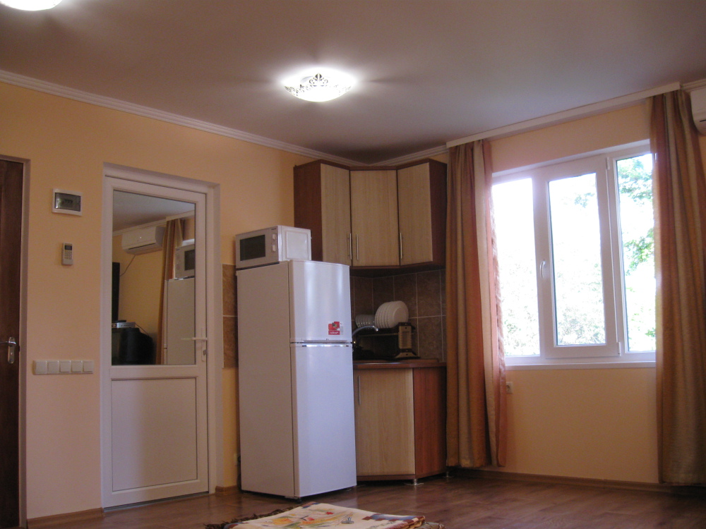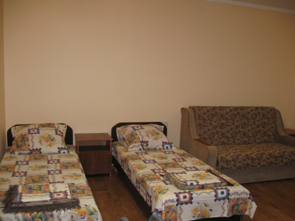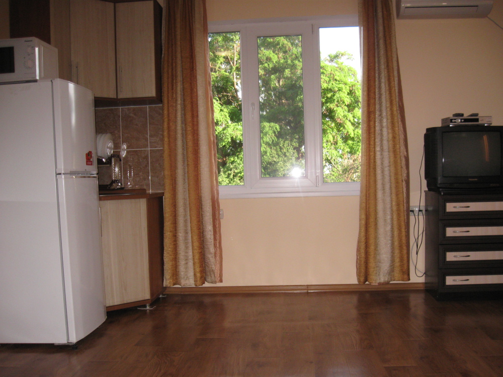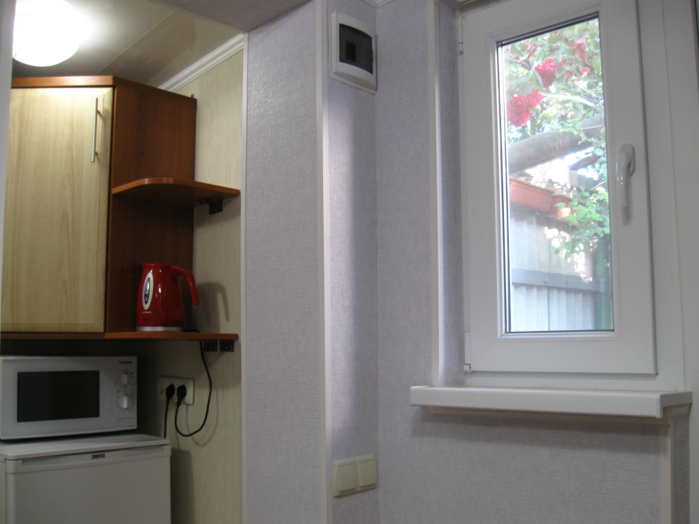 В номере: две кровати (кровати сдвигаются), шкаф для одежды, раскладной стол с двумя раскладными стульями, микроволновая печь, холодильник, эл.чайник, фен, набор посуды, кондиционер,телевизор с кабельными 72 каналами , бесплатный Wi-Fi Интернет. Свой санузел и душ (горячая и холодная вода круглосуточно). Во дворе находится кухня с газовой плитой и посудой для самостоятельного приготовления пищи. Мангал.