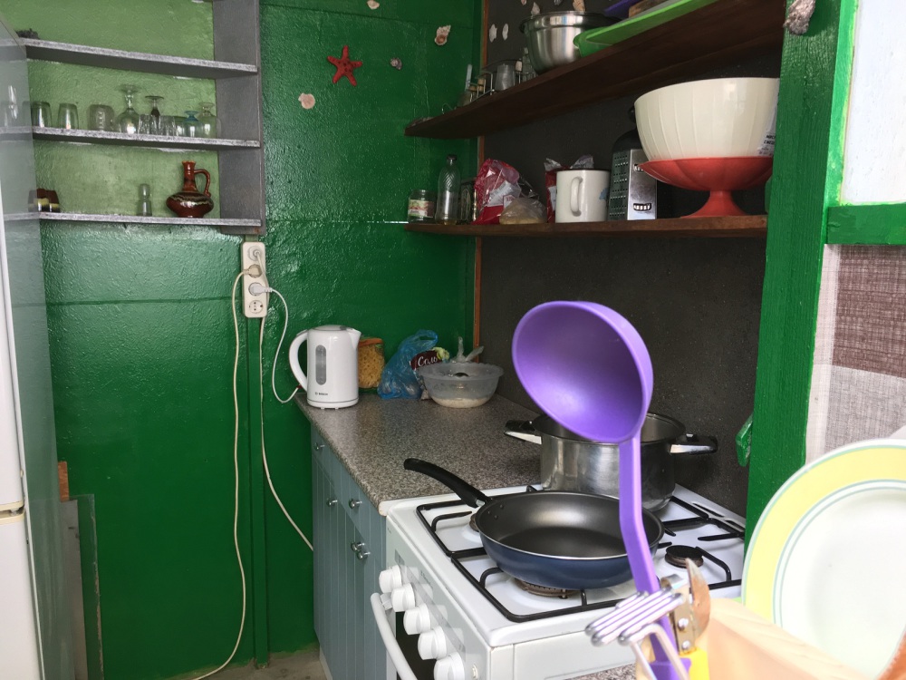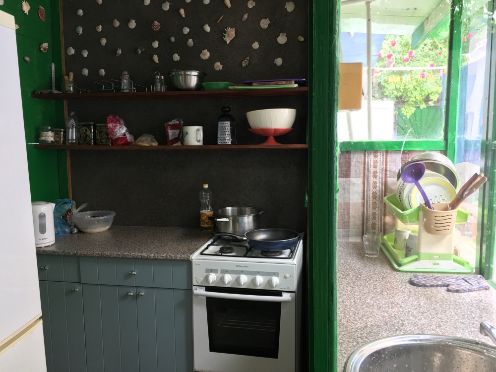 Во дворе на первом этаже находится общая летняя кухня с газовой плитой на 4 конфорки, с большим холодильником и всей посудой для самостоятельного приготовления пищи. Мангал.