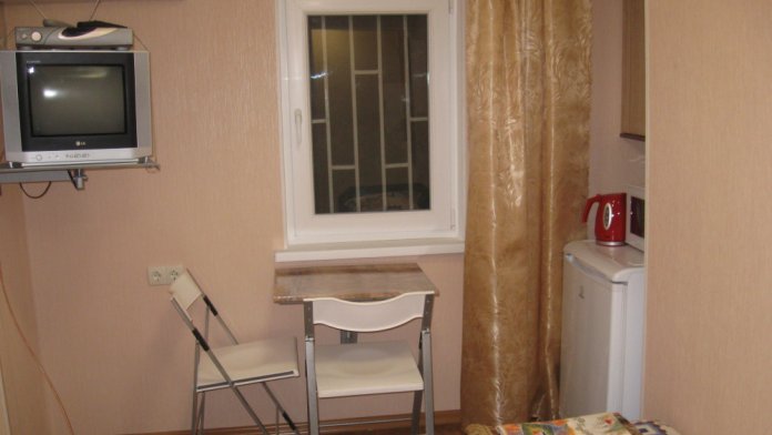 В комнате: кровать шириной 120 см, телевизор (кабельное телевидение 72 канала), бесплатный интернет Wi-Fi, вентилятор, окно, зеркало, три розетки, вешалка для одежды, стул, тумбочка. На полу линолеум.