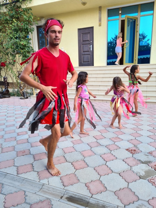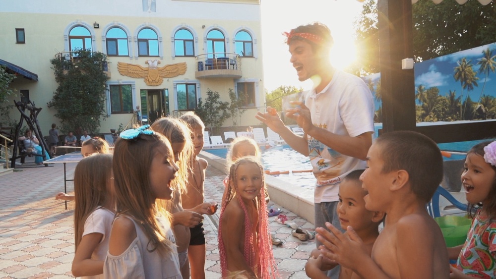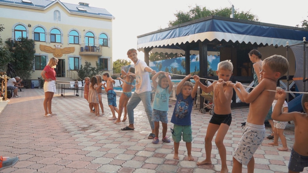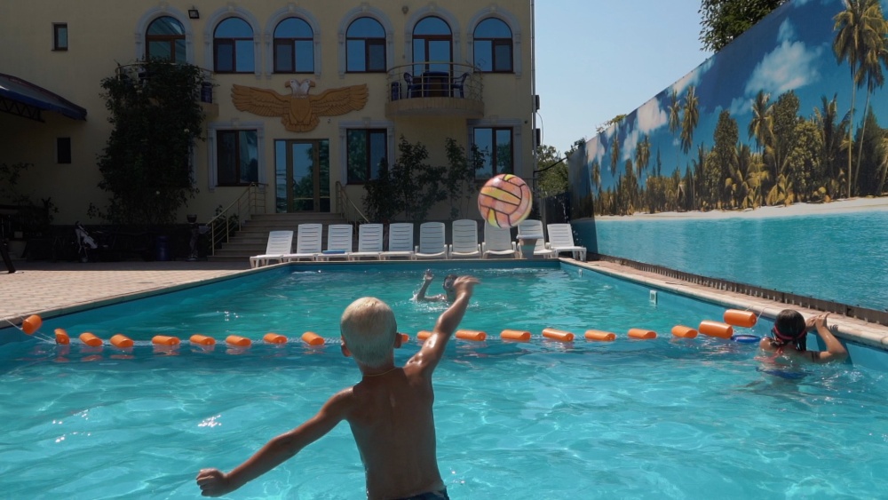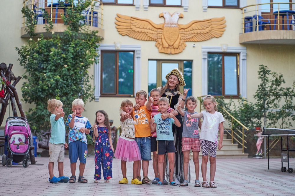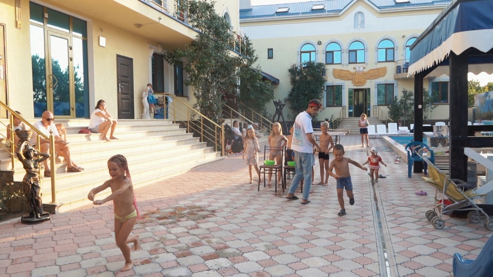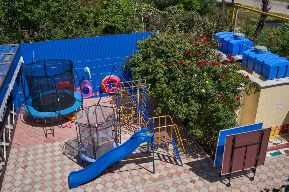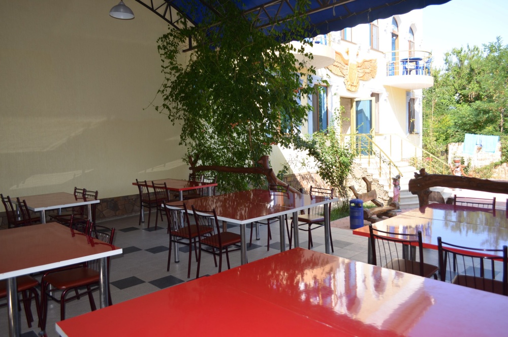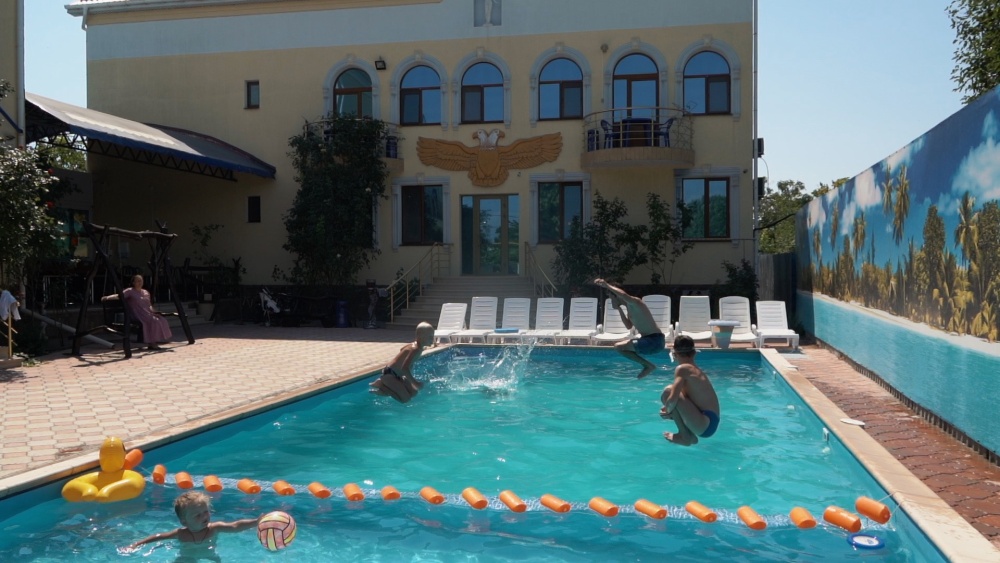 На территории гостевого дома расположены 2 корпуса, 2 летних крытых беседки (чайная зона + кафе и беседка для занятий аниматора с детьми), открытый бассейн с подогревом, гидромассажем и раздельными взрослой и детской чашами, столовая, детская площадка, вечерний кинозал, батут, настольный теннис, открытая парковка под видеонаблюдением перед территорией гостевого дома.