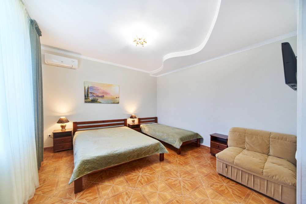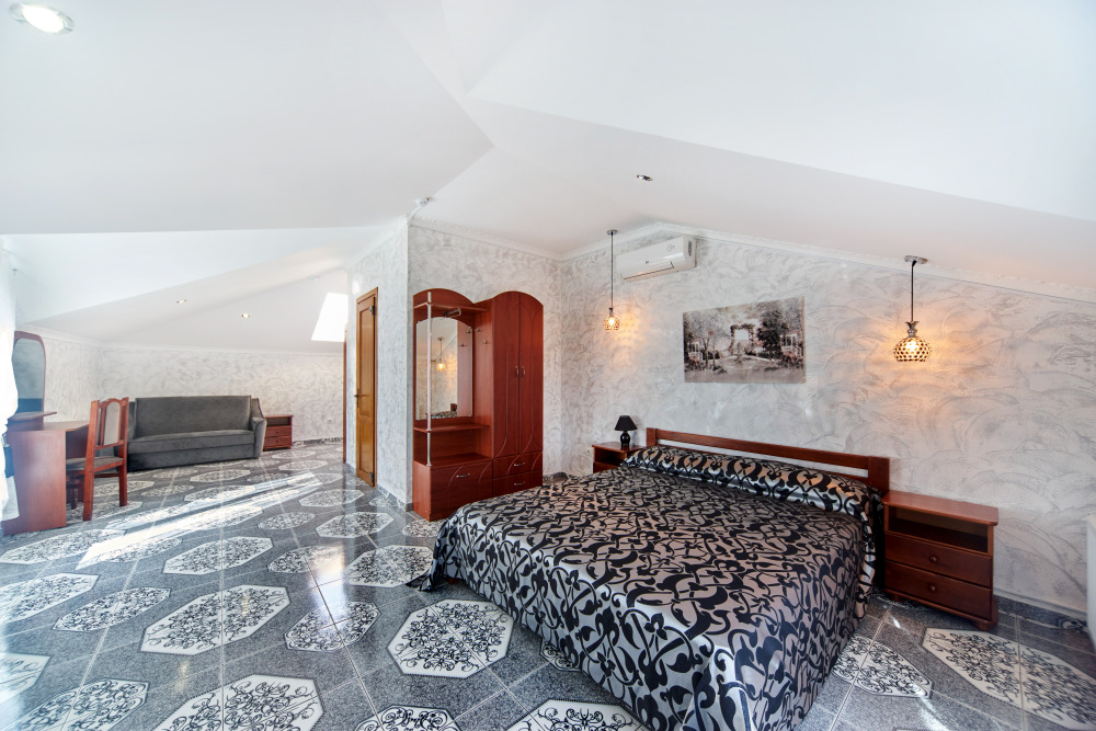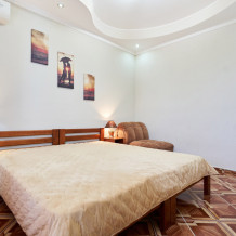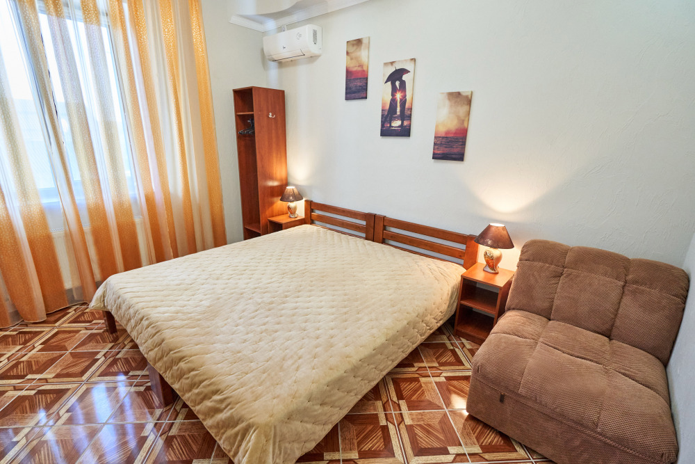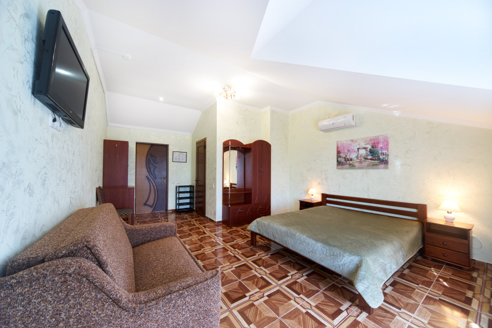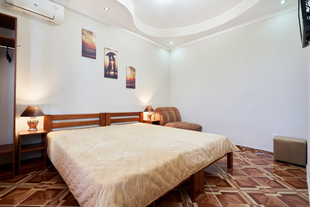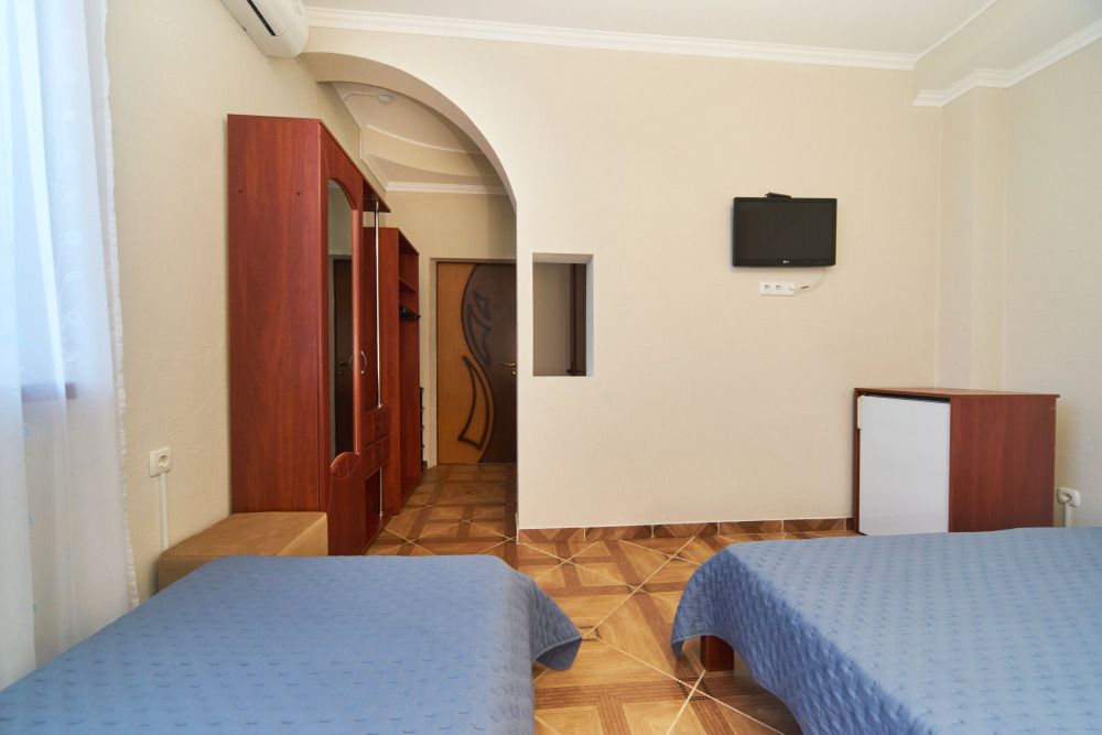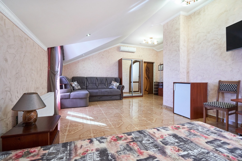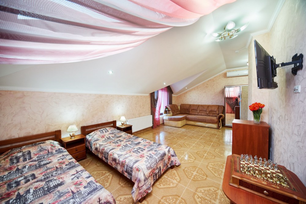 В гостевом доме есть номера, которые подойдут как небольшой семье или компании, так и большие двухкомнатные номера, которые вмещают в себя до 6 человек.
