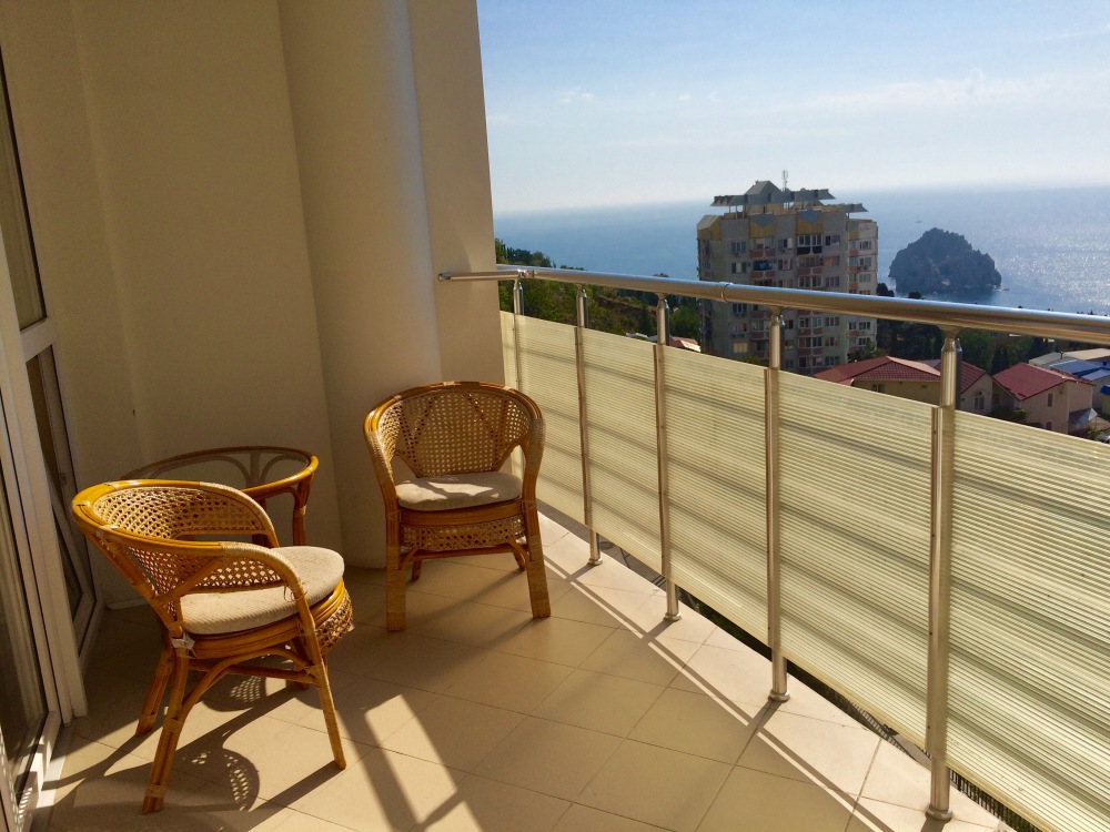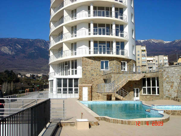 Благодаря интересному архитектурному решению (эллипсообразная форма дома) с лоджии (14м^2) можно одновременно обозревать и море, и горы. На входе круглосуточно дежурит консъерж.
