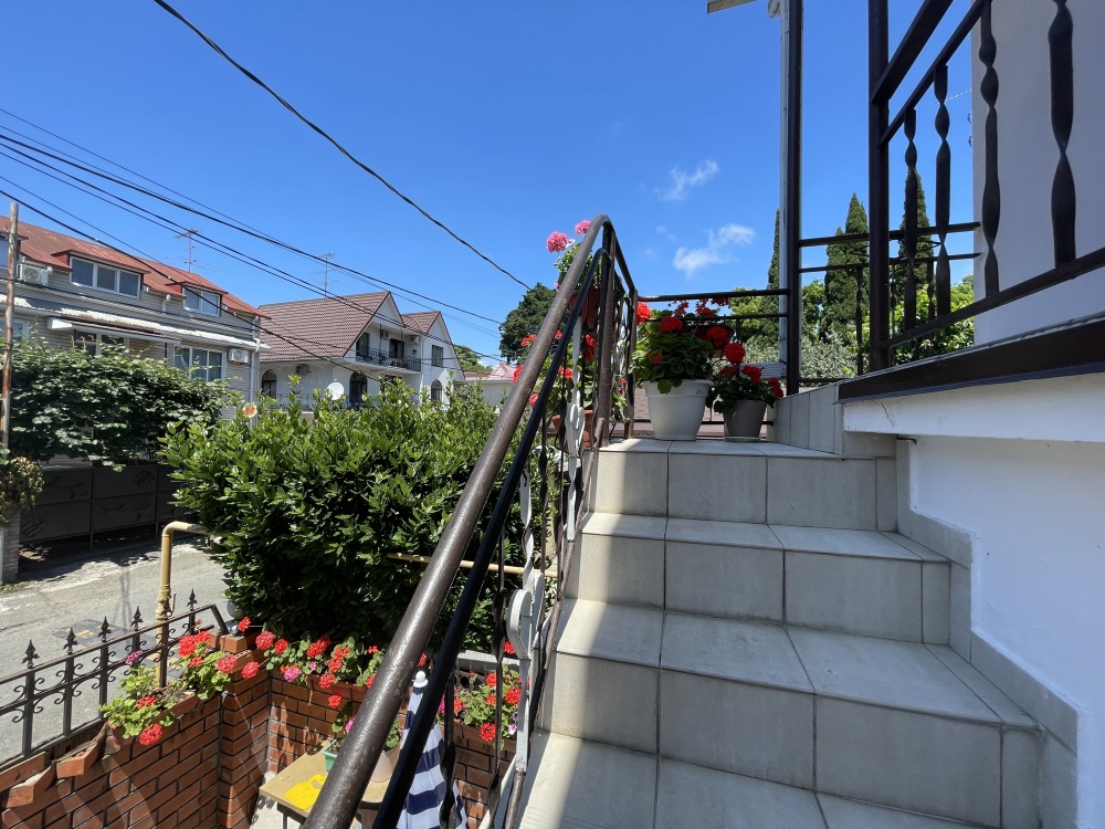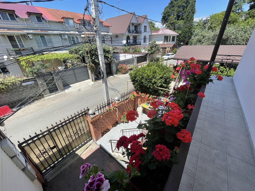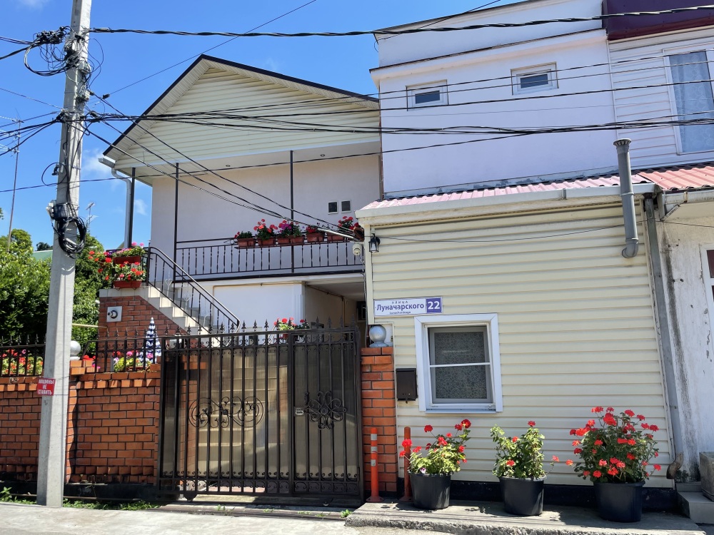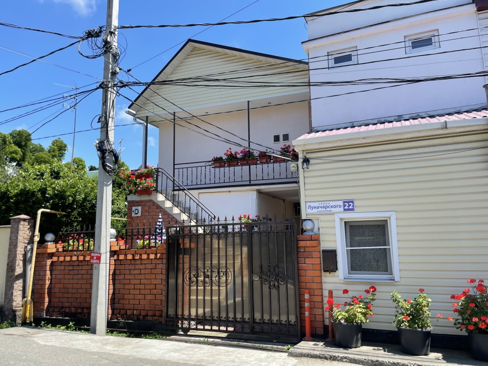 Гостевой дом располагается на улице Луначарского в центральной части Адлера. Фасад и территория дома украшены зелеными насаждениями и цветами. Для маленьких туристов предоставляются игрушки. Листья винограда создают естественную тень, которая защищает двор дома от летнего солнца.