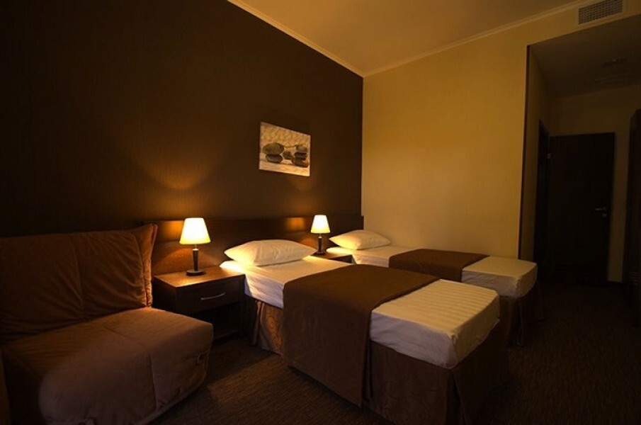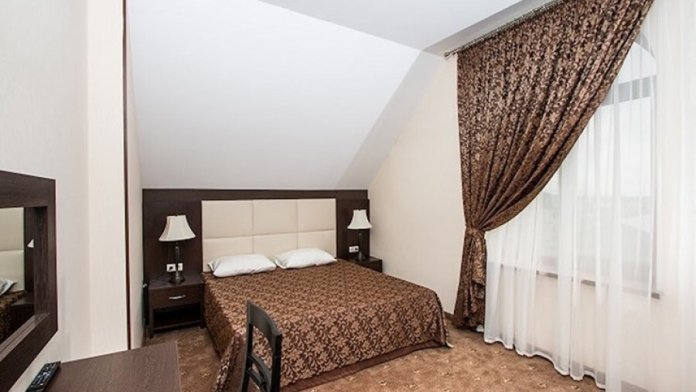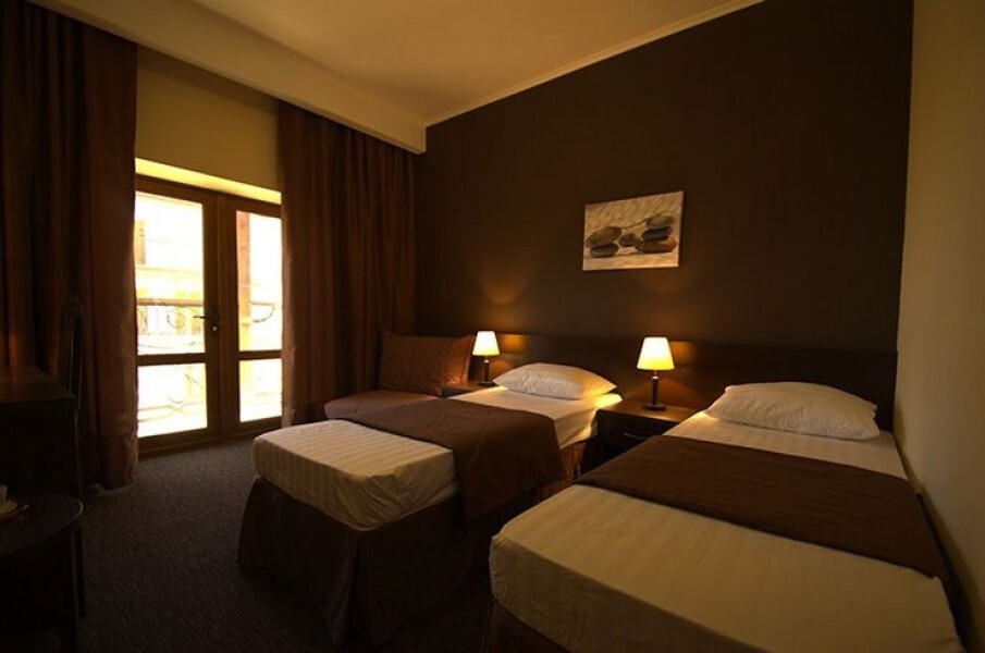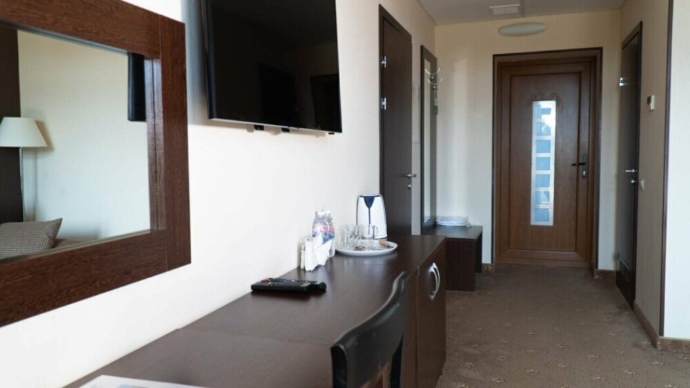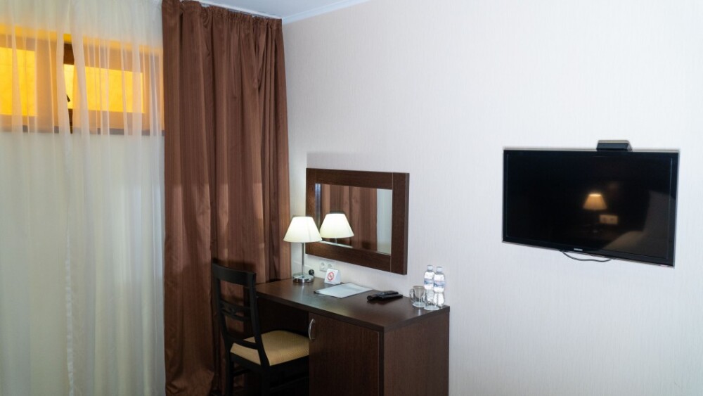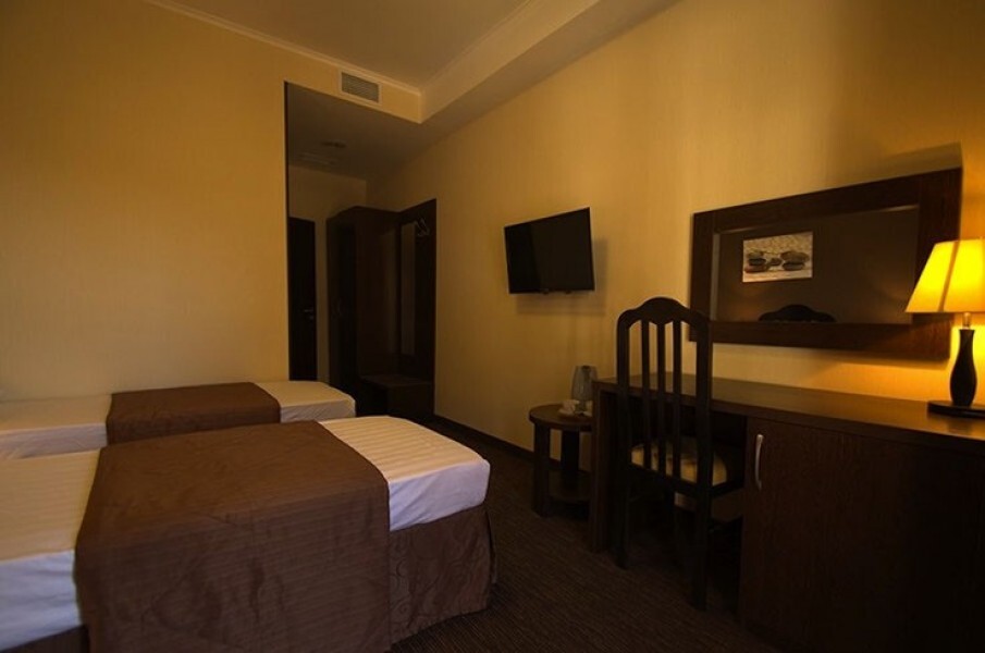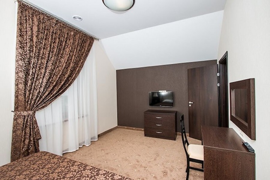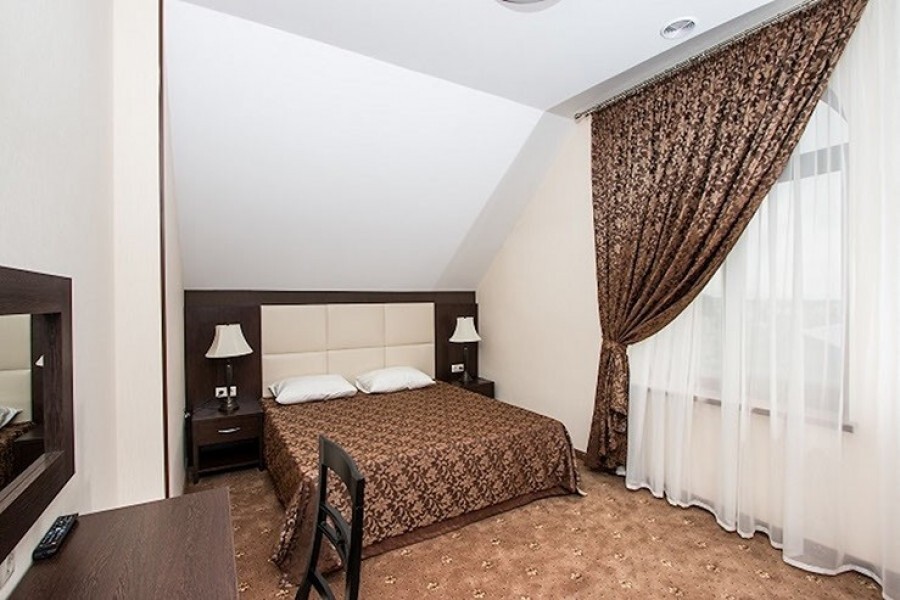 в цокольном этаже с небольшим окном. На полу плитка. В номере двуспальная кровать, либо 2 односпальные кровати, 2 прикроватные тумбы, ЖК ТВ., письменный/туалетный стол с зеркалом и тумбой под холодильник, мини-холодильник, небольшой прикроватный столик, шкаф для одежды, багажная тумба, прихожая с зеркалом.