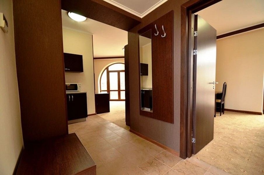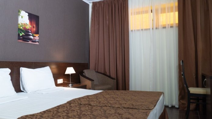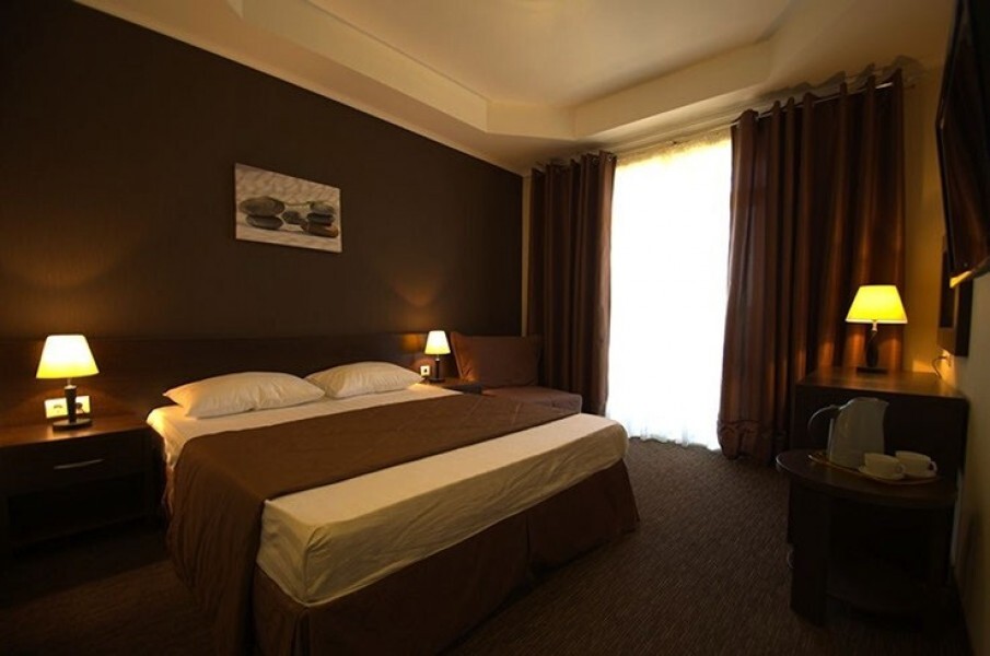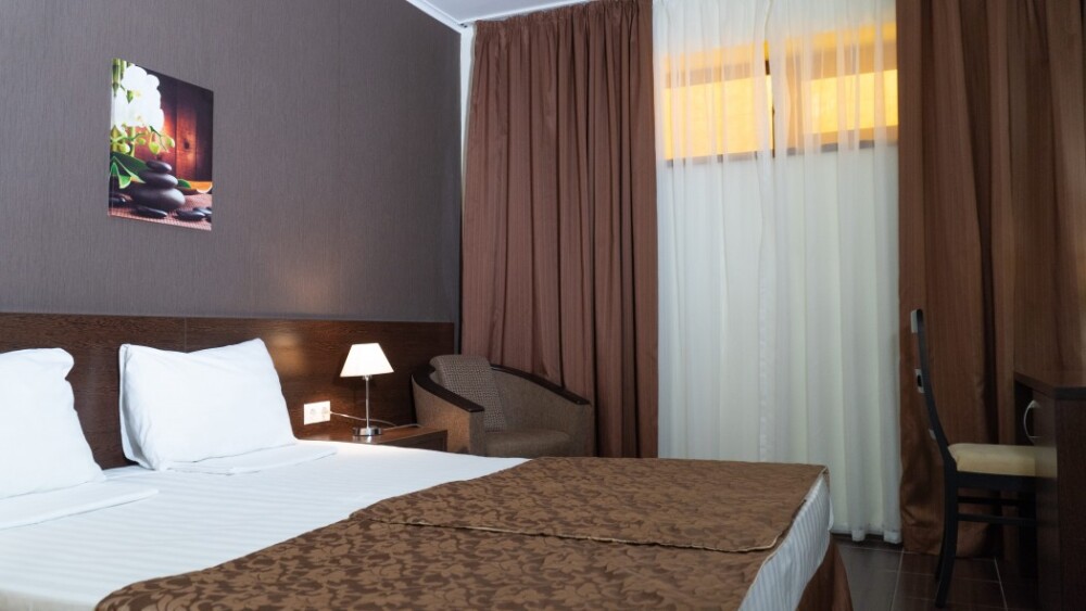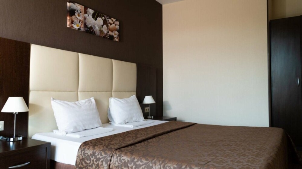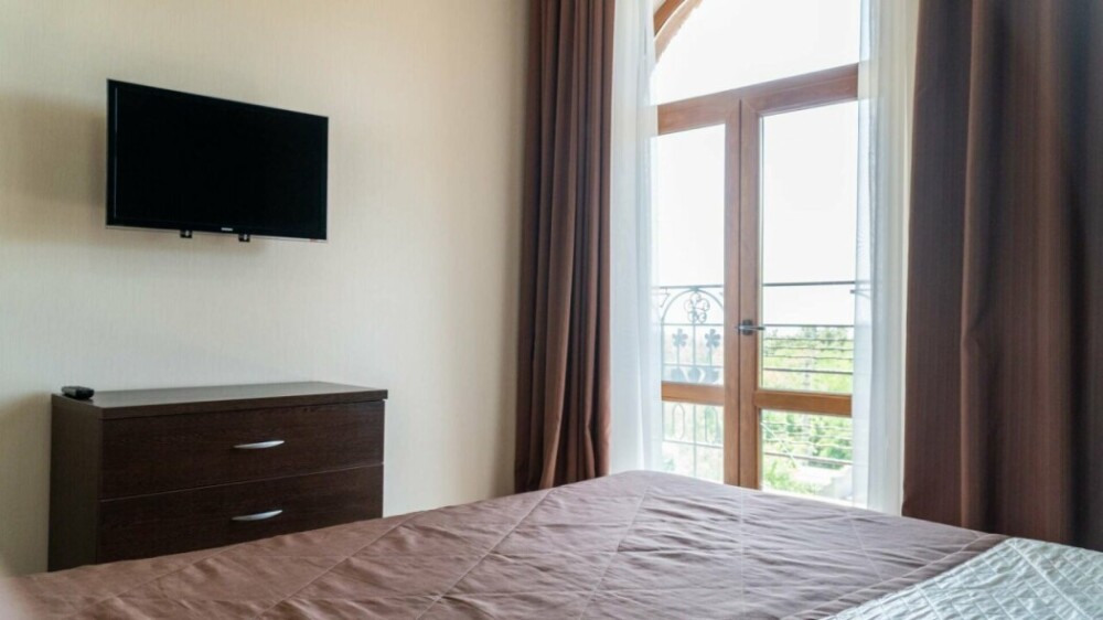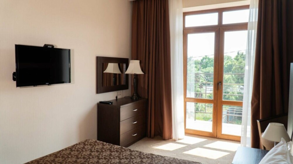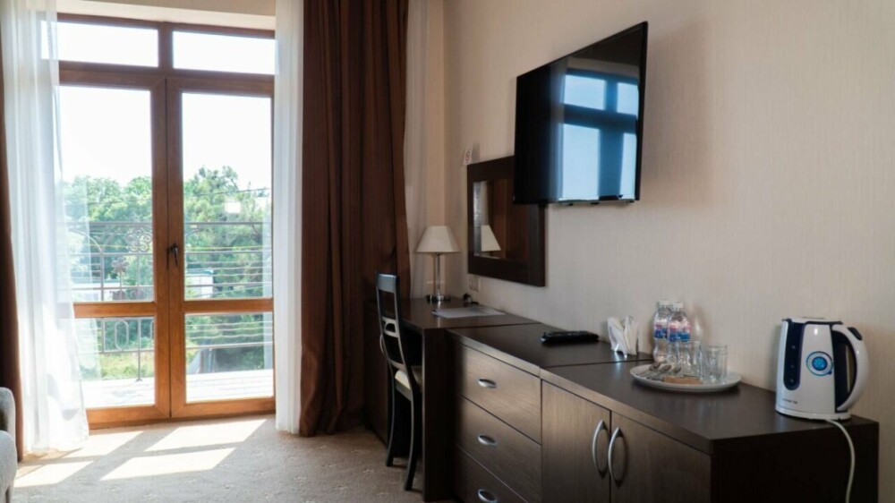 В номере двуспальная кровать, 2 прикроватные тумбы, ЖК ТВ, комод, стол письменный с зеркалом, тумба под холодильник со встроенным мини-холодильником, микроволновая печь, чайник и чайный набор, диван-кровать, журнальный стол, шкаф для одежды, багажная тумба, прихожая с зеркалом. В номере есть кондиционер, большой балкон с видом на море.
