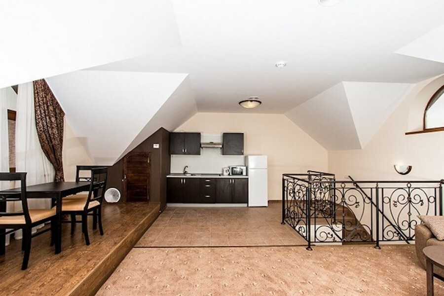 Это двухуровневый номер площадью 74 кв.м. На первом уровне расположена прихожая с гардеробом и большой санузел с ванной и стиральной машиной. На втором уровне расположены 2 комнаты: гостиная и спальня. В гостиной полноценная кухонная зона (варочная плита, холодильник, вытяжка, мойка, микроволновая печь, чайник), обеденный стол, кресло, диван-кровать, ЖК ТВ. Из окна открывается прекрасный вид на море! Спальня с большой двуспальной кроватью и отдельный ЖК ТВ.