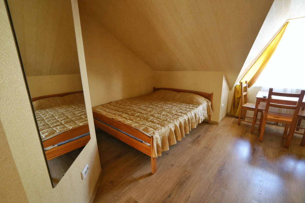 Уютный номер с двуспальной и односпальной кроватями. Для полного единения с природой выходите на общую просторную веранду с бассейном, который уже с июня прогревается до комфортных +25°C.