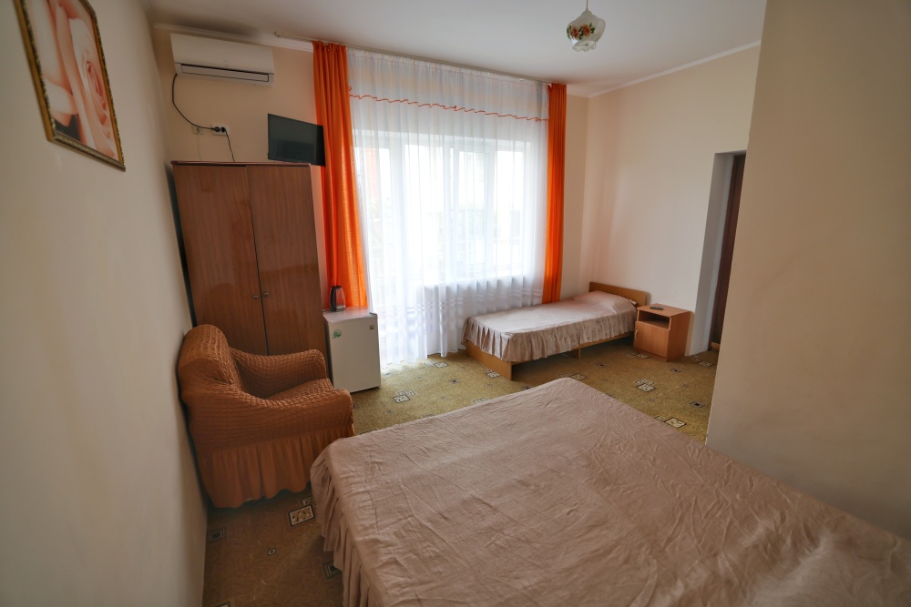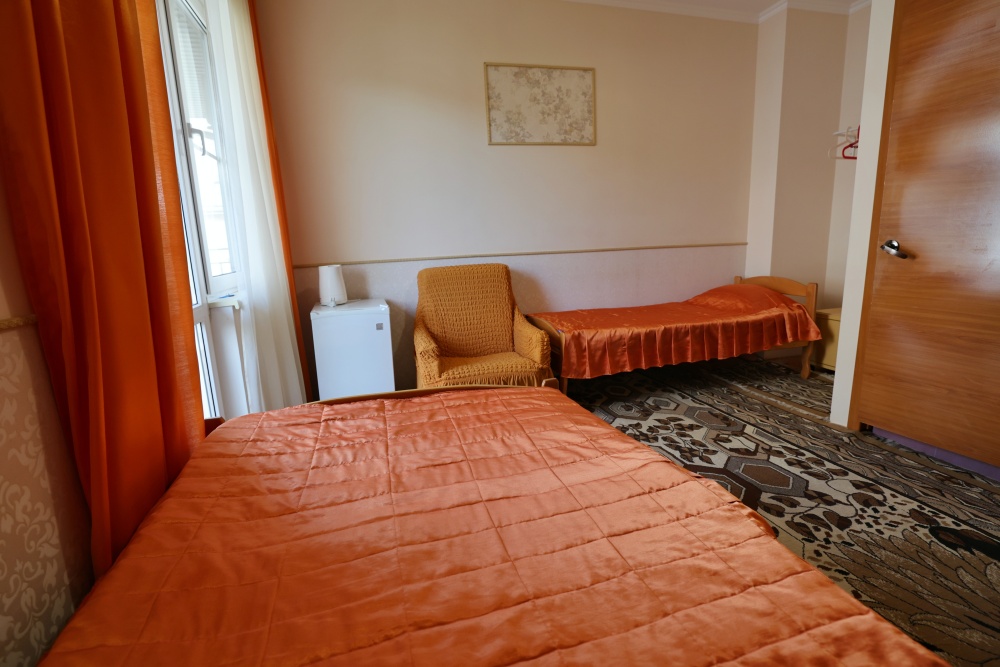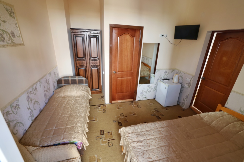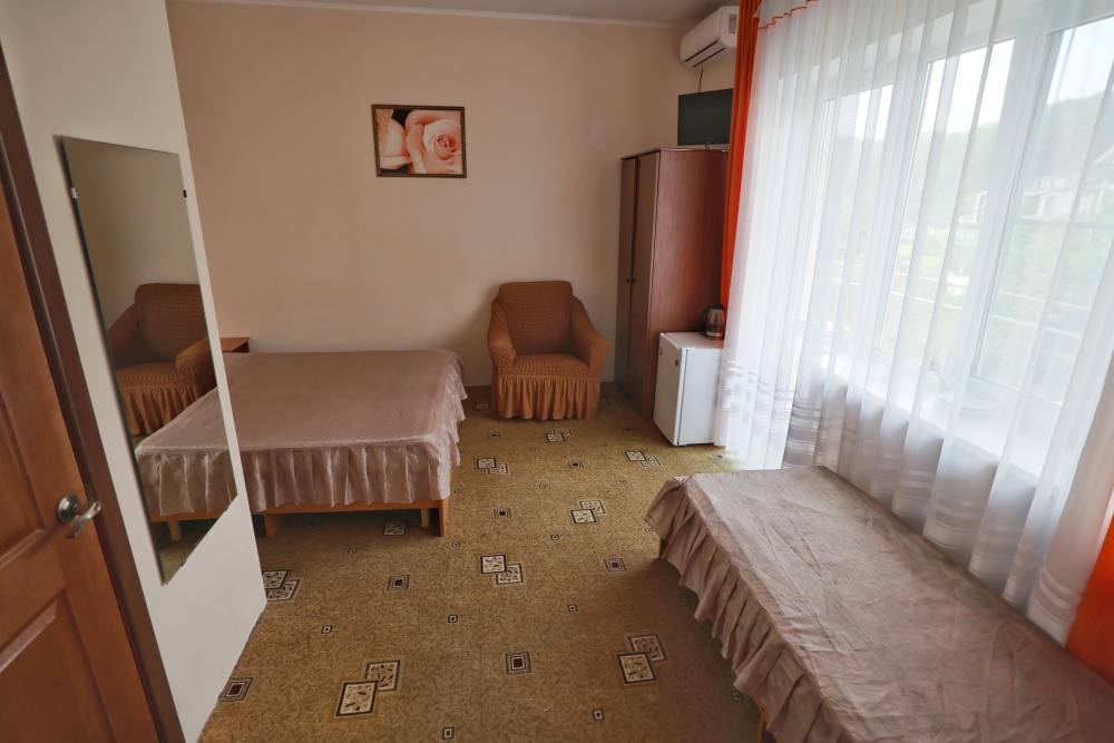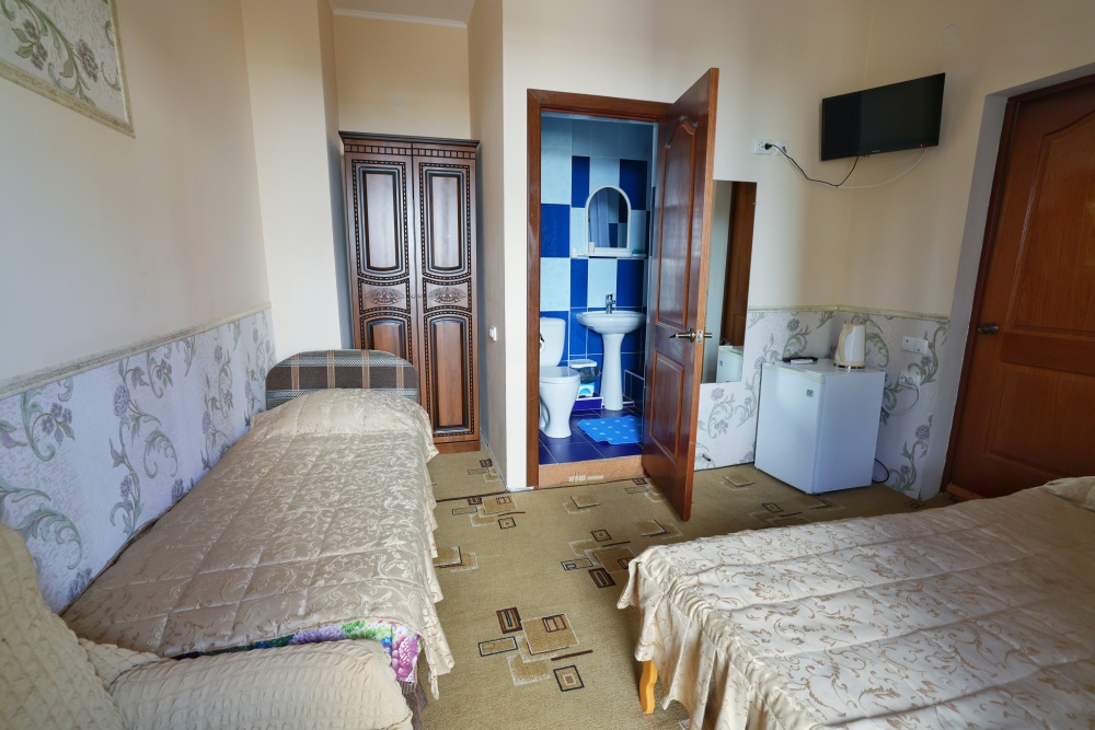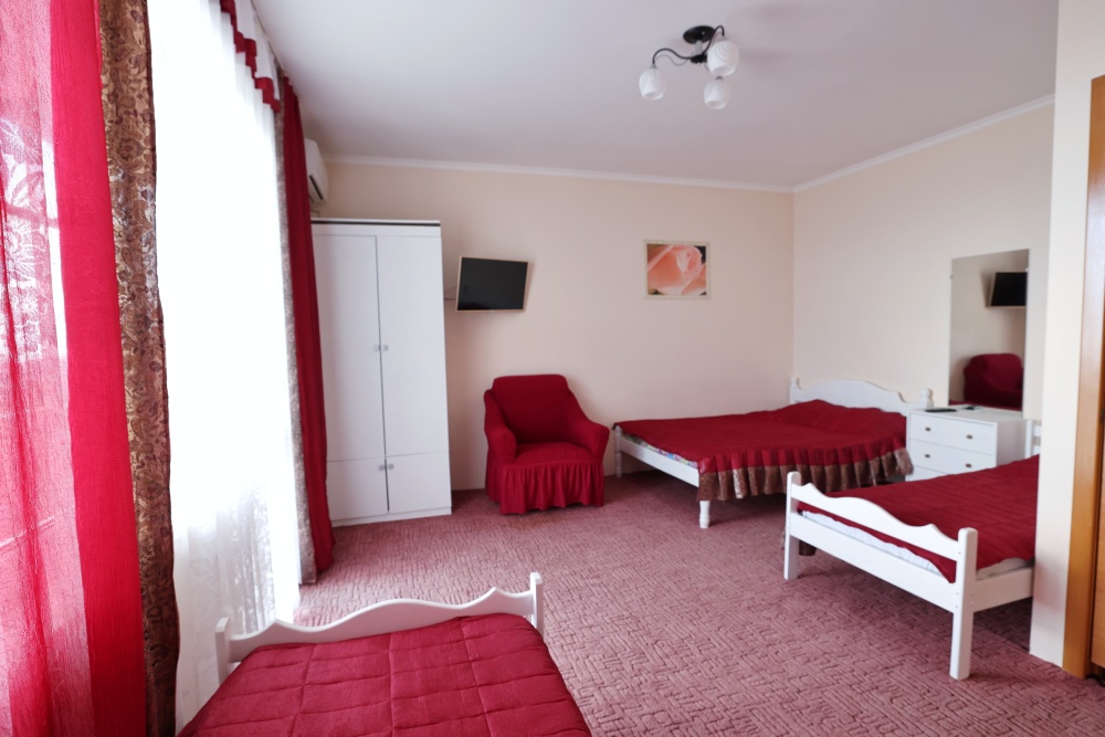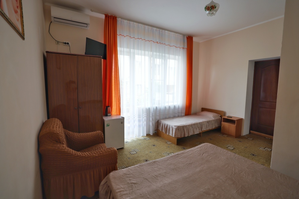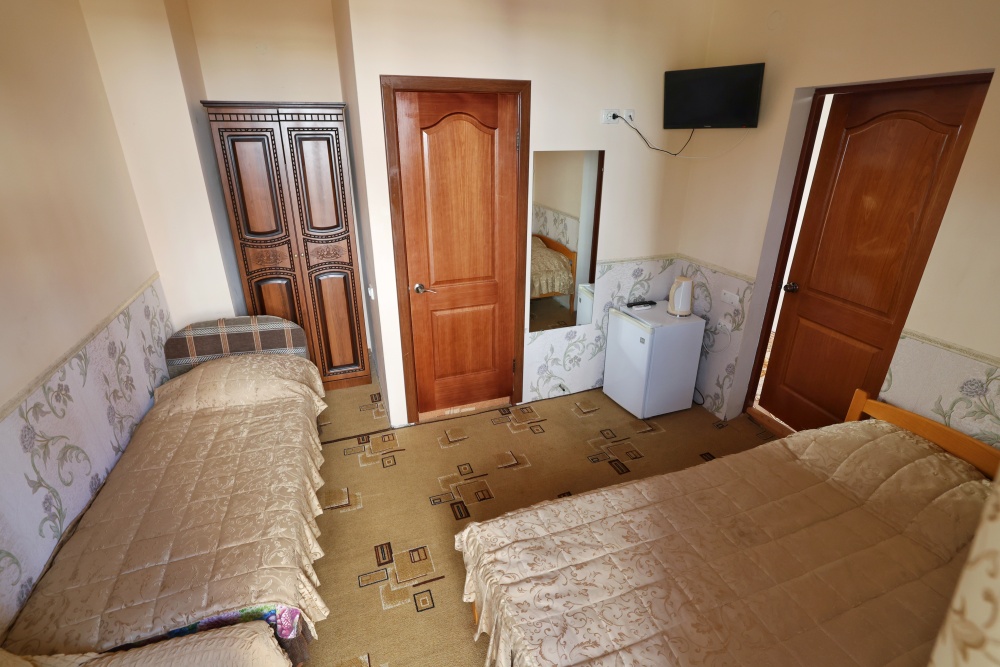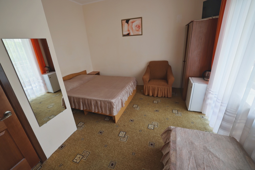 В номере бесплатный Wi-Fi, санузел с душевой кабиной, горячая вода и свежие полотенца. Двуспальная кровать 140 на 200, 2 односпальные кровати 80 на 200 и раскладное кресло. Телевизор, мощный кондиционер и холодильник для прохладительных напитков. Электрический чайник и всё то, что создает ощущение домашнего уюта.
