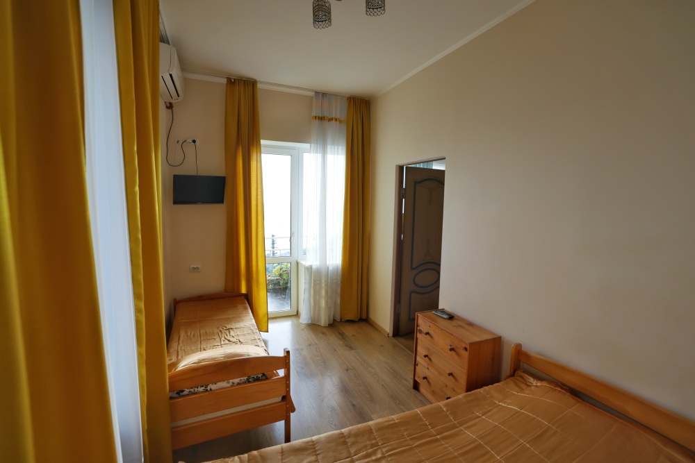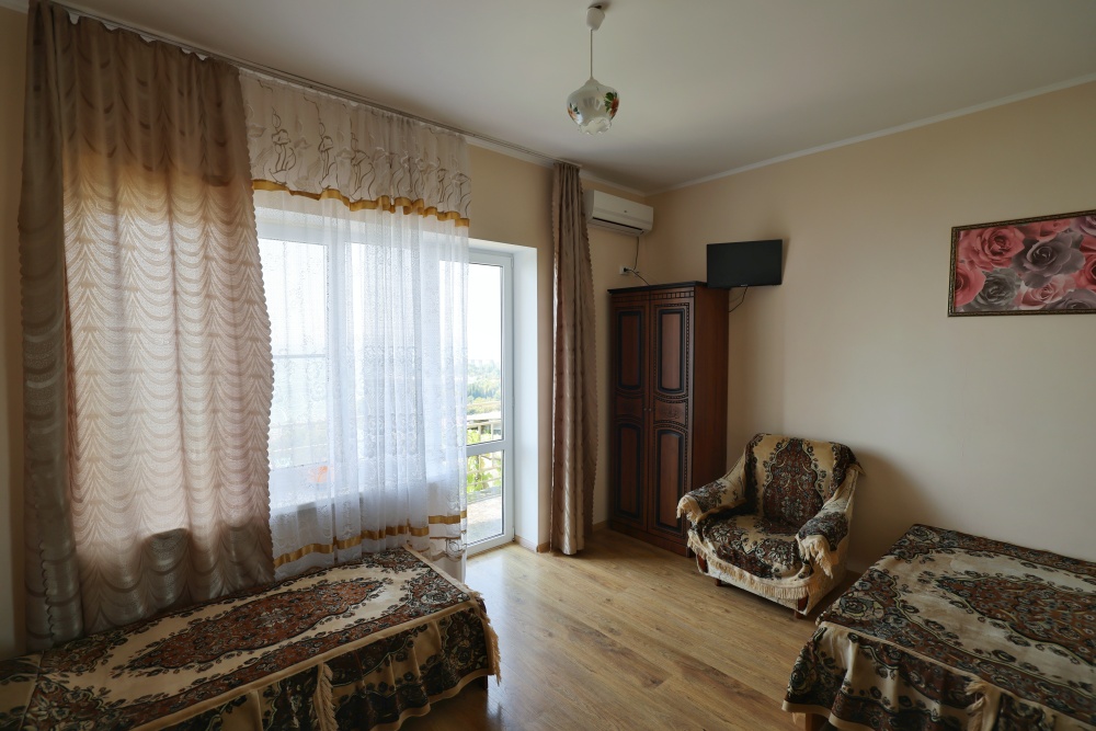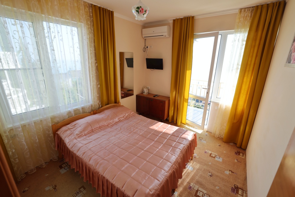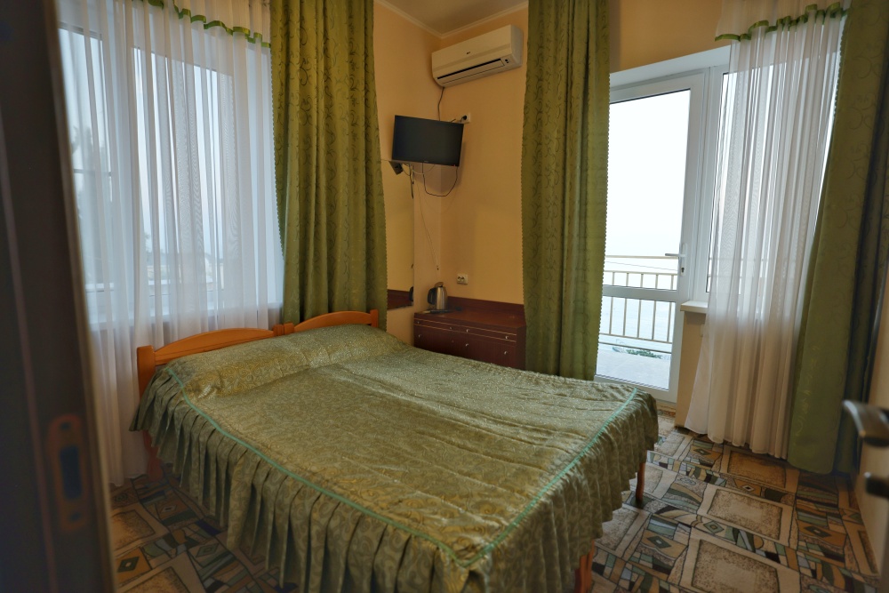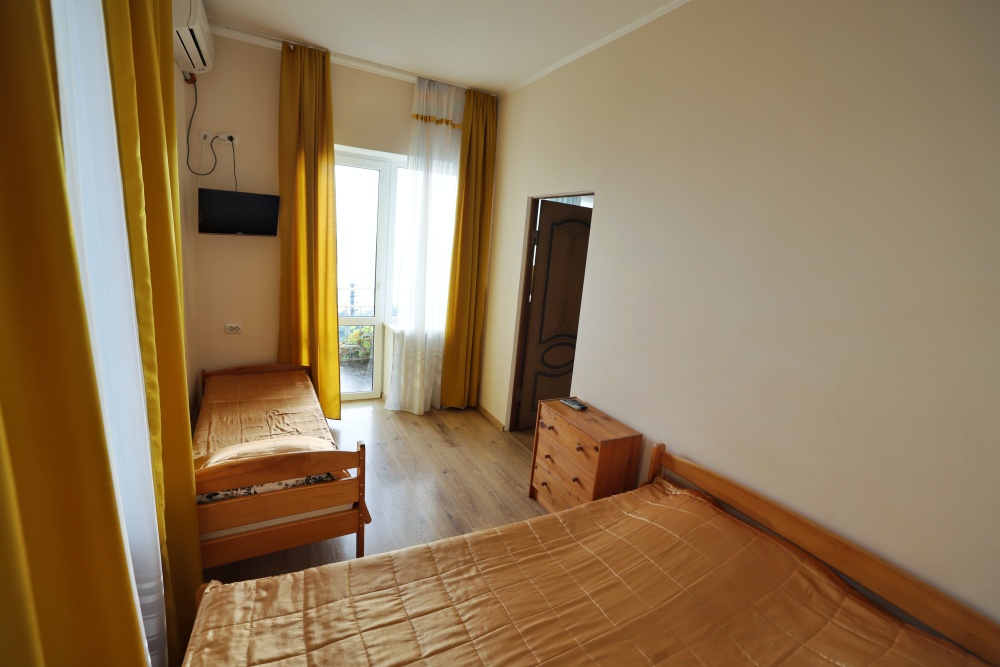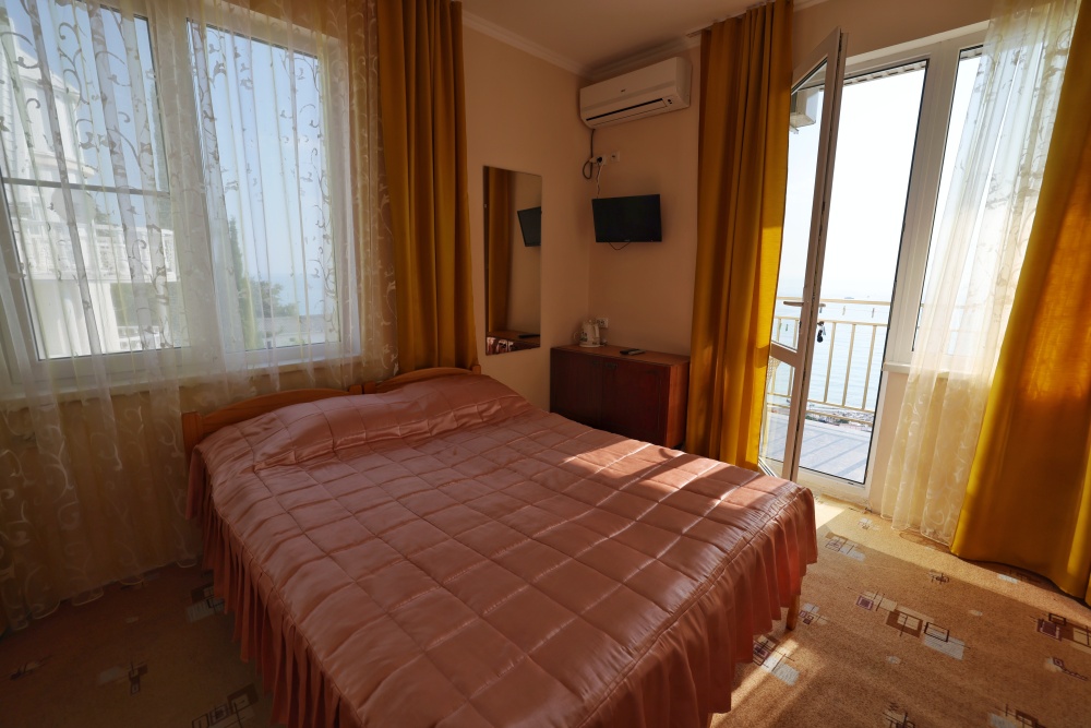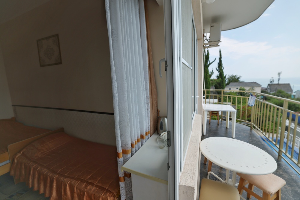 В номере две комнаты, каждая с выходом на собственный панорамный балкон, где можно наслаждаться вечерним закатом и звездным небом. Бесплатный Wi-Fi, санузел с душевой кабиной, горячая вода и свежие полотенца. Двуспальная кровать 140 на 200, во второй комнате кровать 160 на 200 и односпальная кровать 70 на 200. Телевизор в каждой комнате, мощный кондиционер и холодильник для прохладительных напитков. Электрический чайник для утреннего кофе и всё то, что создает ощущение домашнего уюта. Выходите на общую просторную веранду с бассейном, который уже с июня прогревается до комфортных +25°C.