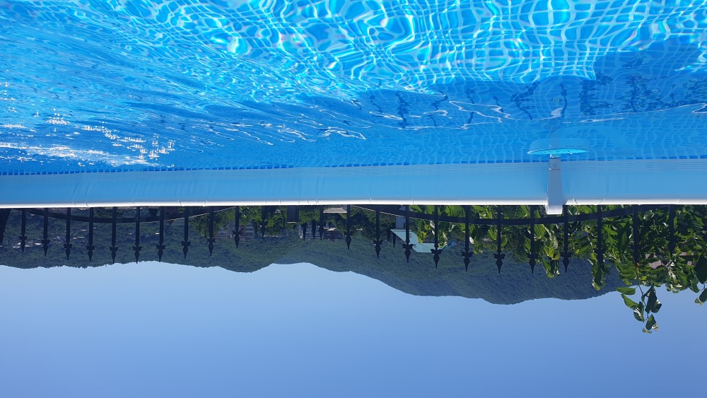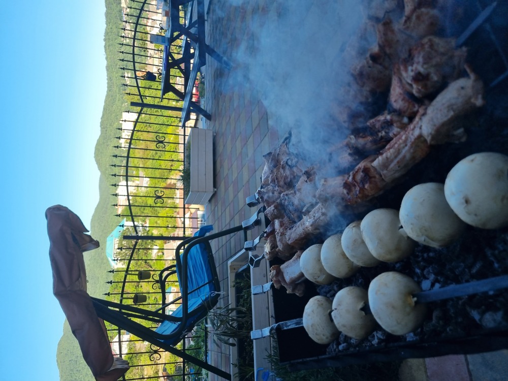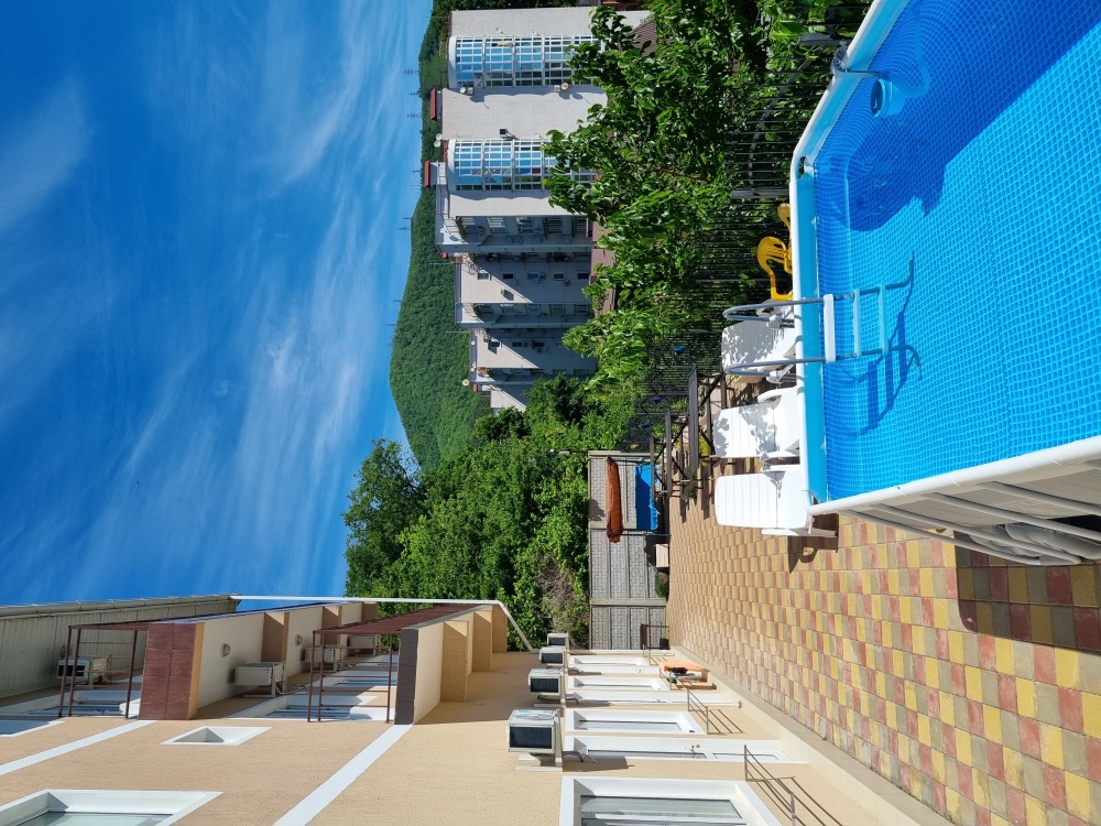 Общая просторная кухня со всей необходимой посудой, мангал. Двор нашего дома просторный, в клумбах растет киви, пальмы и множество цветов. С 2020 года на террасе мы поставили небольшой бассейн.