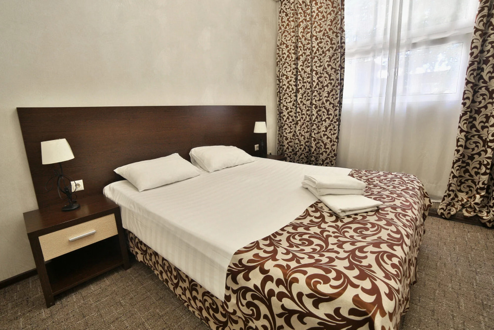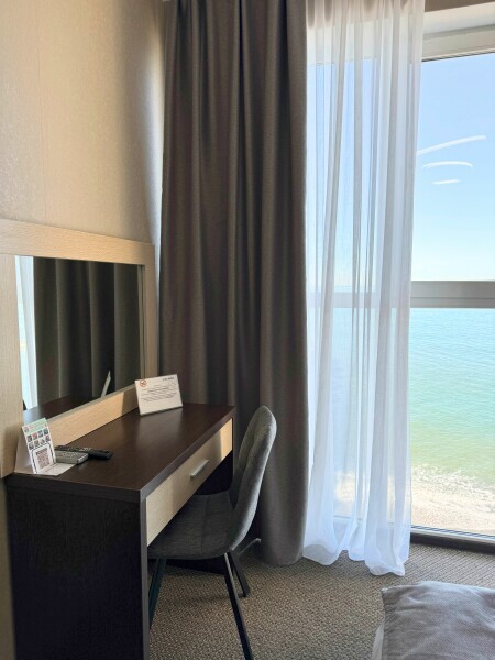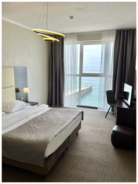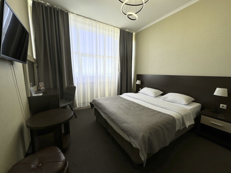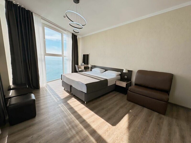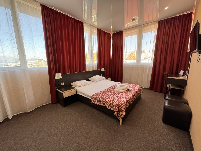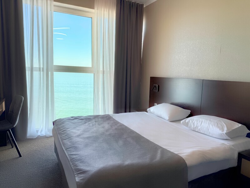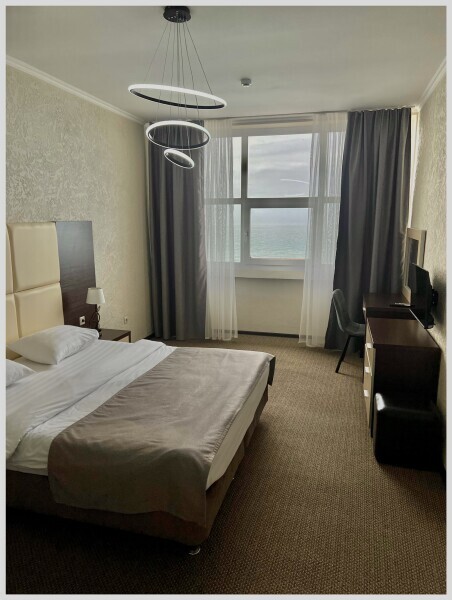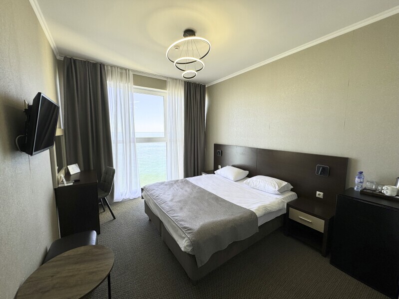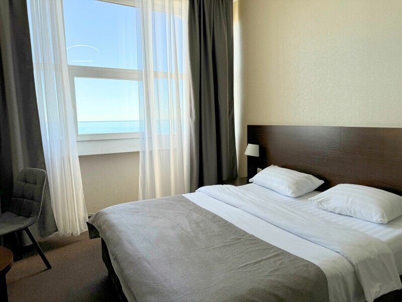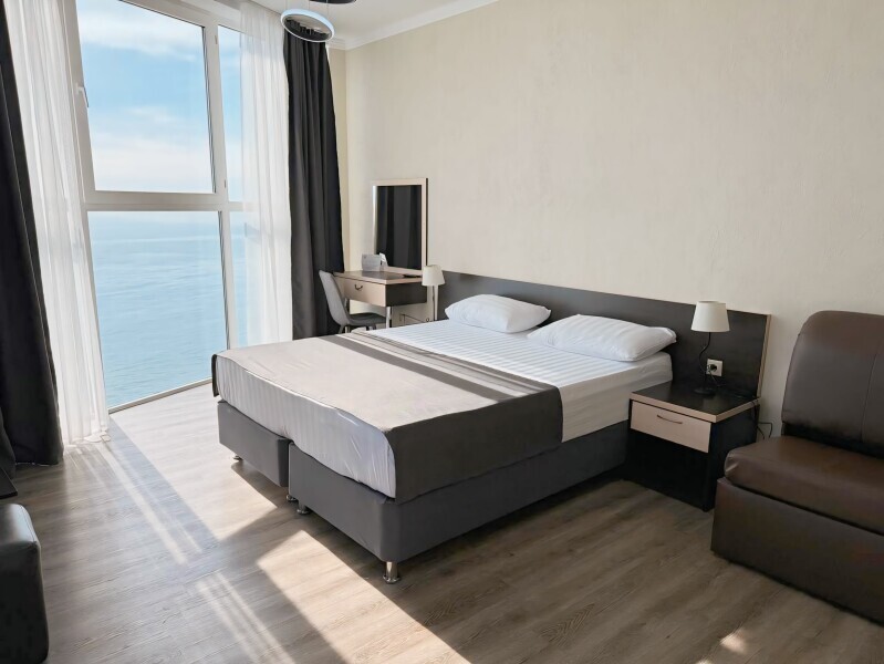Просторный номер с панорамным видом на море. Не выходя из номера Вы сможете встретить рассвет и закат, насладиться шумом моря. В номере большая двухспальная кровать, ванная комната, полностью укомплектован для комфортного проживания. Возможно размещение третьего гостя за дополнительную плату (кресло-кровать).