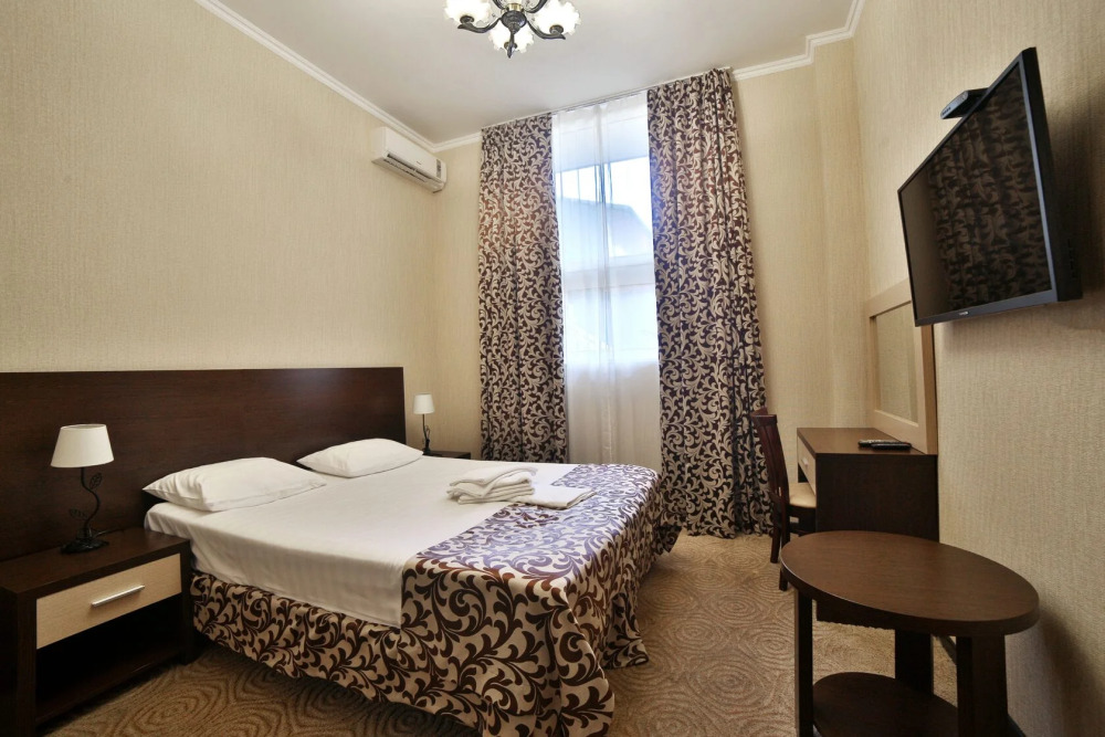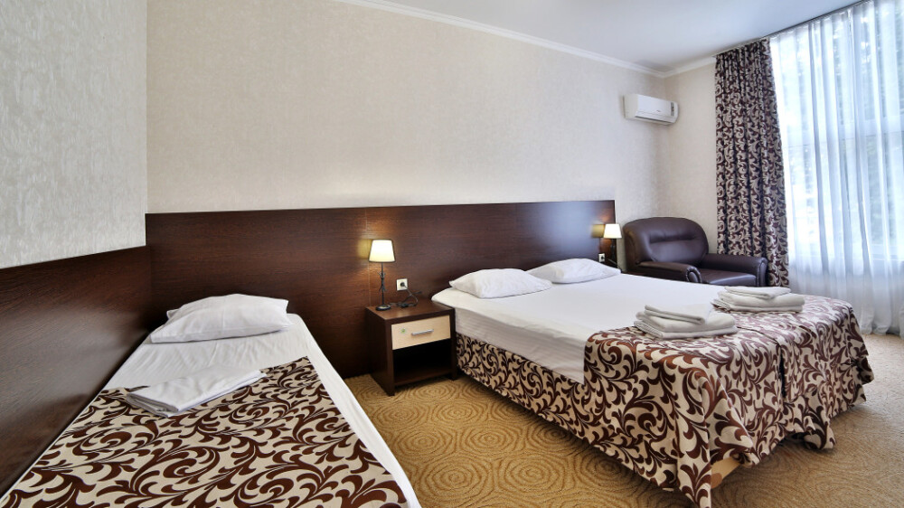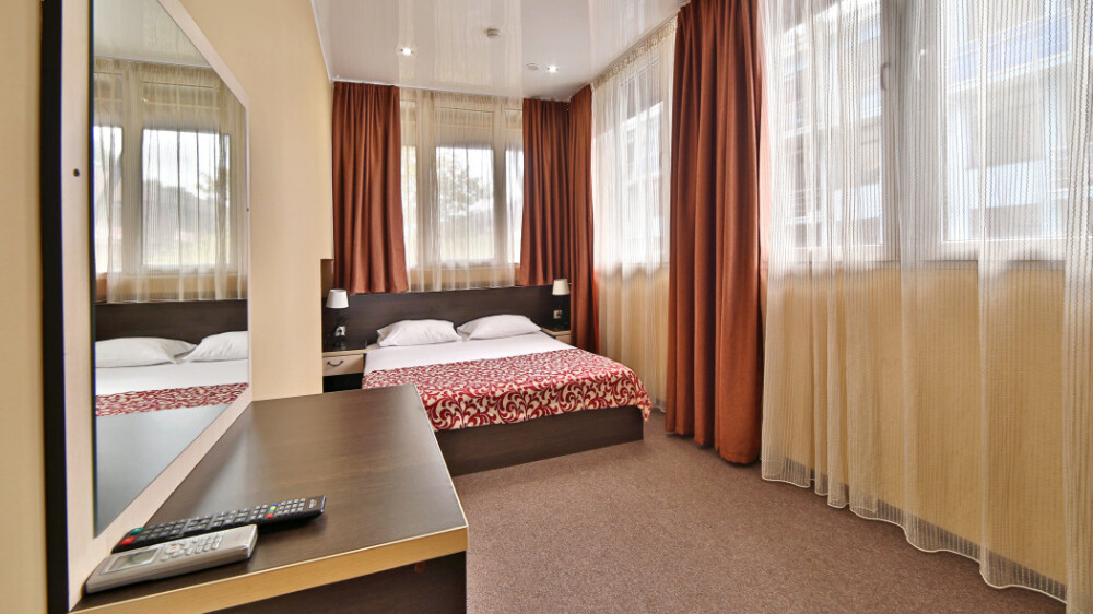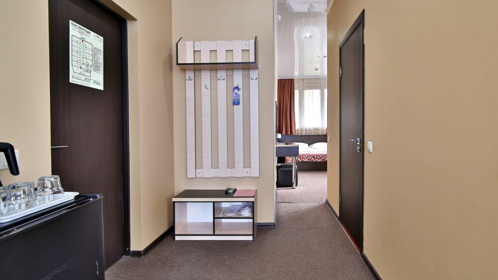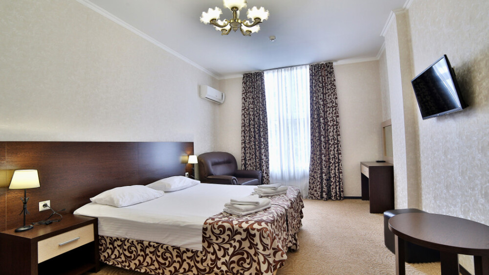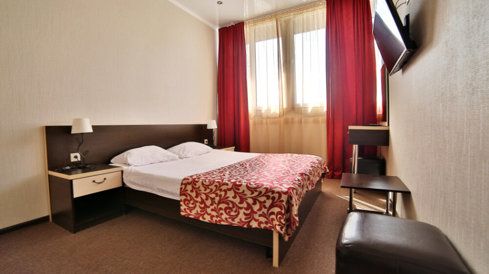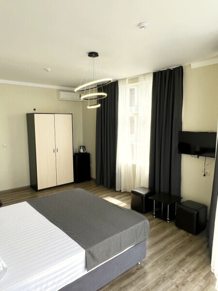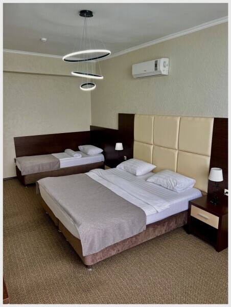 Большой просторный номер, есть возможность разместиться небольшой семьей. В номере большая двухспальная кровать, дополнительно односпальная кровать. Полностью укомплектован (сплит-система, телевизор, холодильник, шкаф.) В номере есть ванная и туалет.