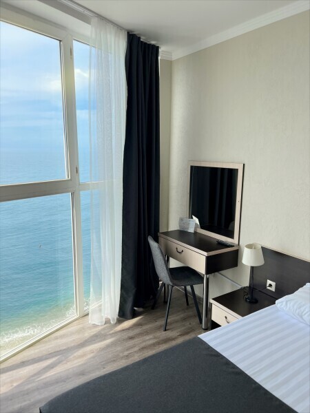 С высоты открывается завораживающий вид на морские просторы Черного моря. Номера данной категории расположены на верхнем 5 этаже с видом на море. Лифта в отеле нет, просим учесть при бронировании номера. Номер полностью укомплектован всем необходимым для комфортного проживания (сплит-система, холодильник, телевизор, ванная комната).