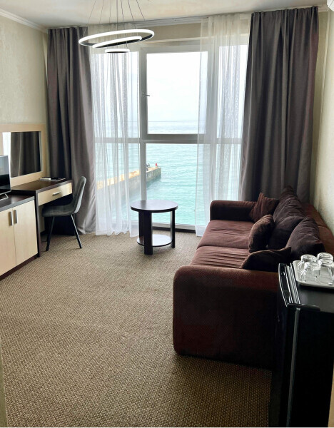 Двухкомнатный номер люкс с видом на море несомненно пользуется спросом у семейных пар. В номере могут разместится до 4 чел. Не выходя из номера Вы сможете насладиться встречей рассвета и заката. Вид на море зачаровывает и не оставляет никого равнодушным. Номер полностью укомплектован всем необходимым. Номер находится на 4 и 5 этажах. Лифта в отеле нет, пожалуйста учитывайте это при бронировании.