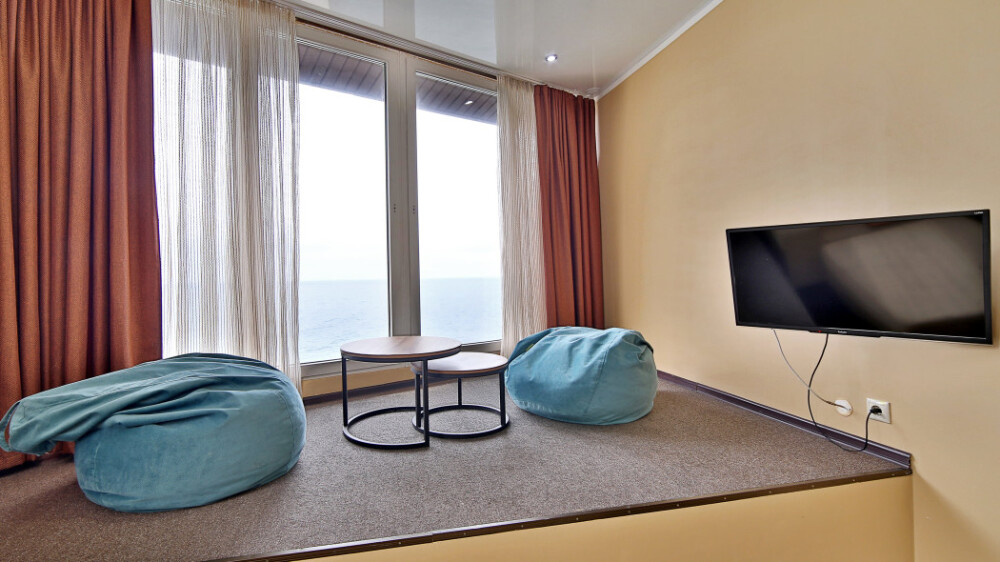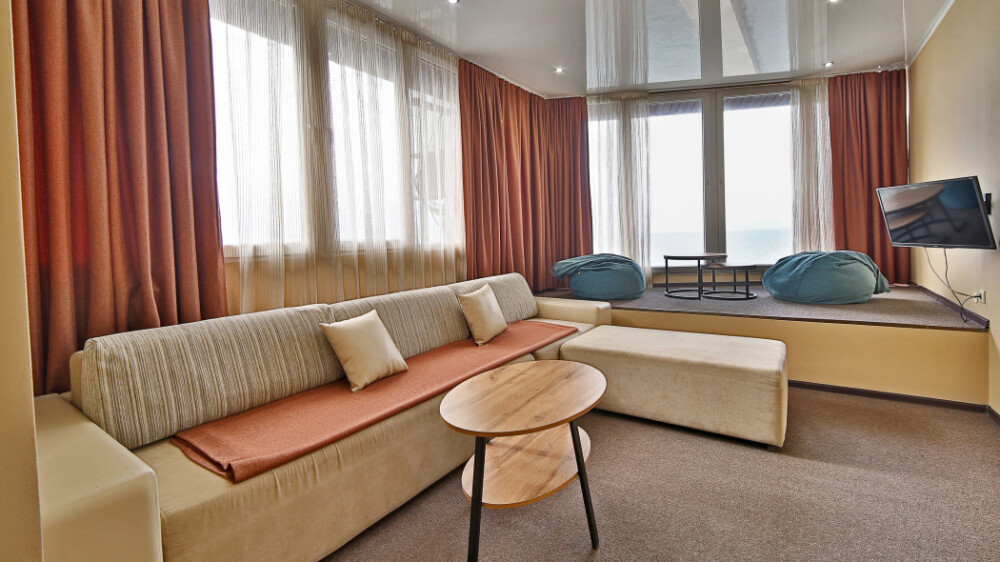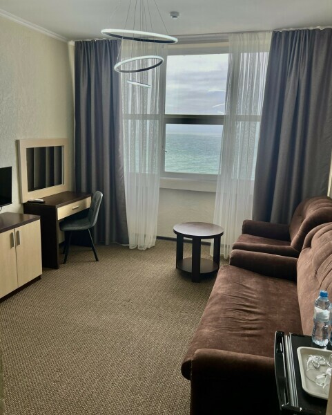 Панорамный вид зачаровывает и не оставляет никого равнодушным. Не выходя из номера Вы сможете насладиться встречей рассвета и заката. Номер полностью укомплектован всем необходимым (кондиционер, телевизор, холодильник, ванная комната, чайник и все необходимые принадлежности). Номер состоит из двух изолированных комнат, спальня и гостиная.