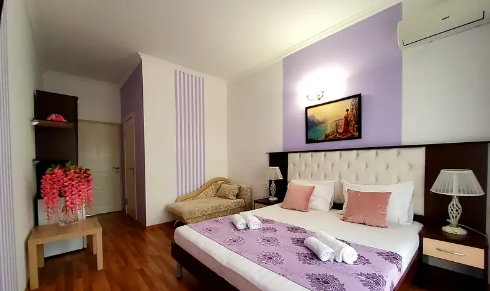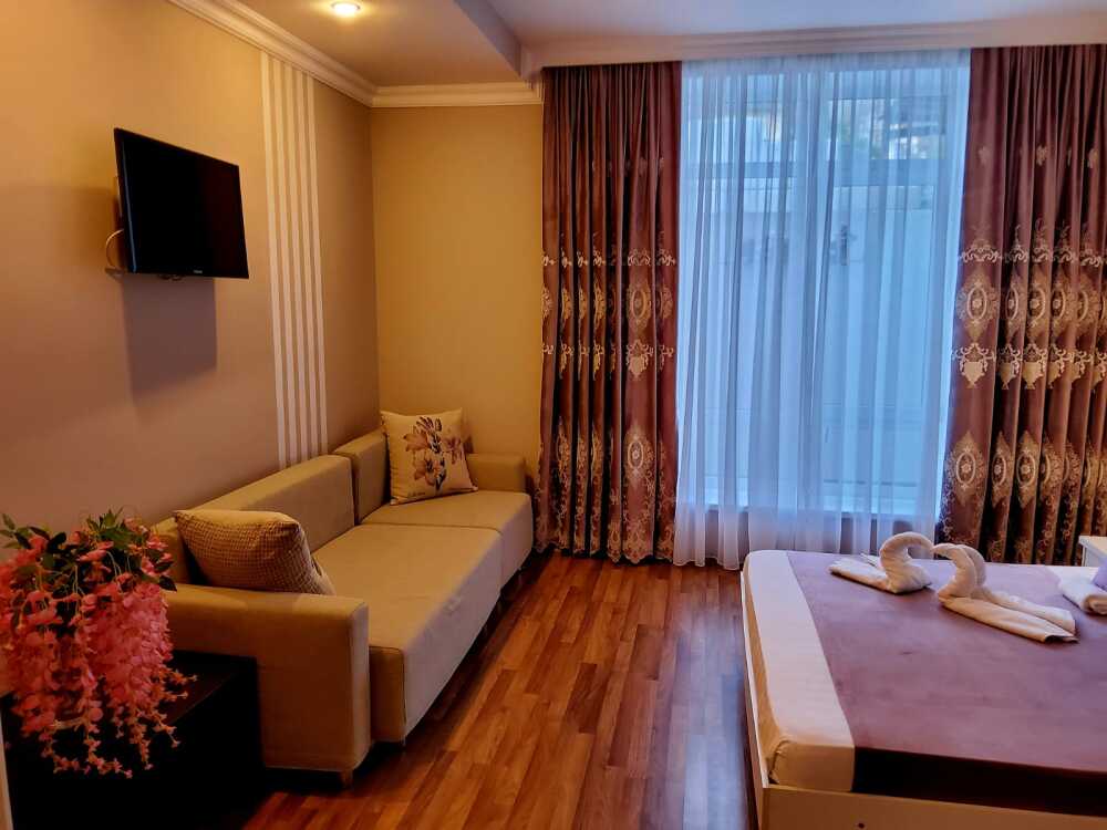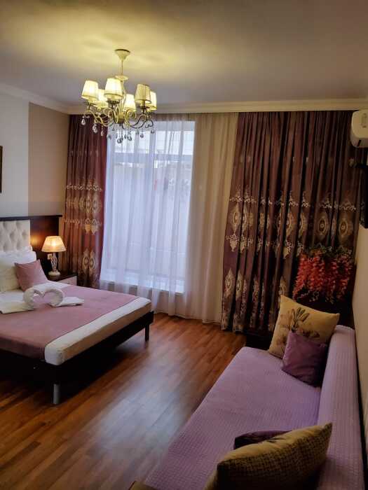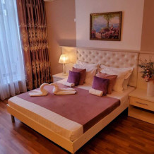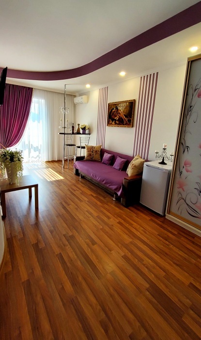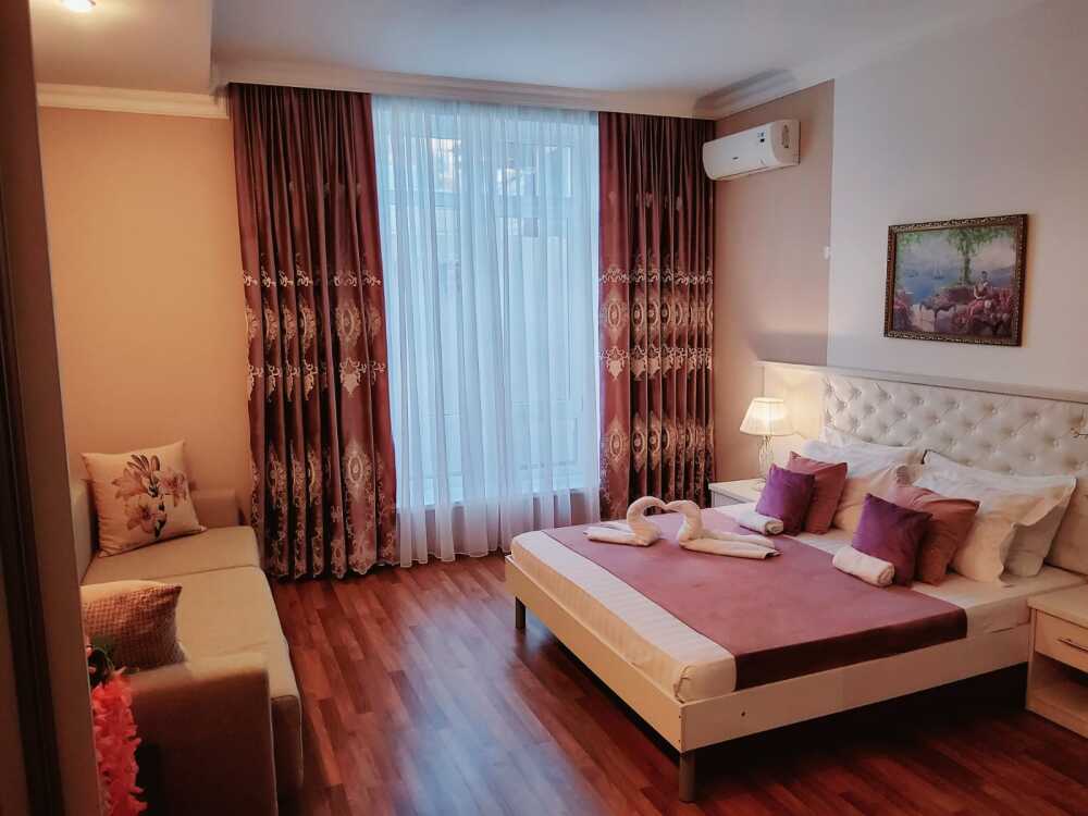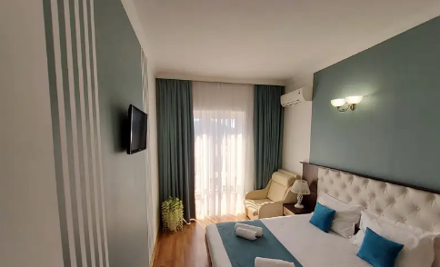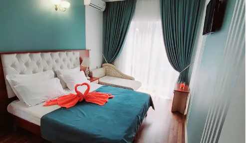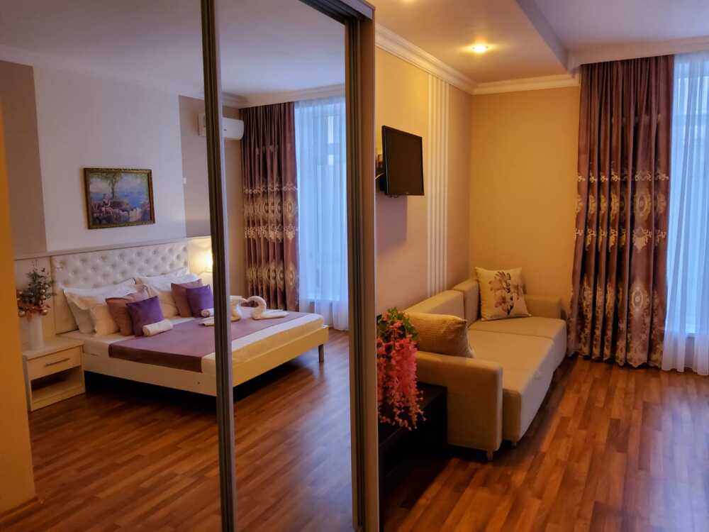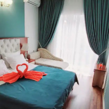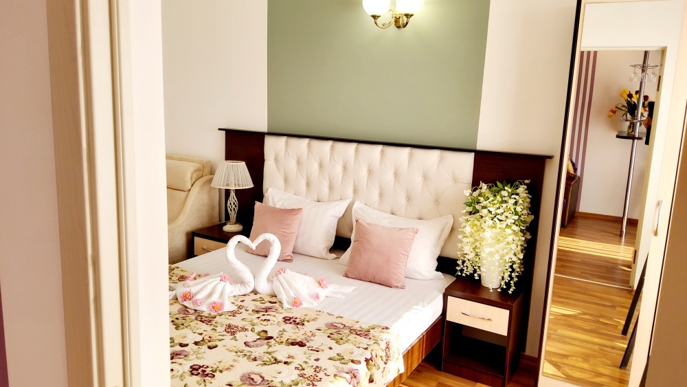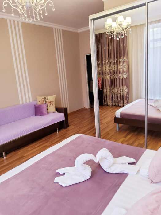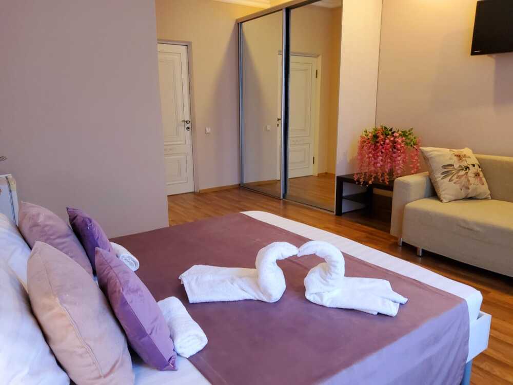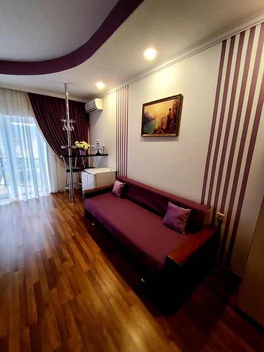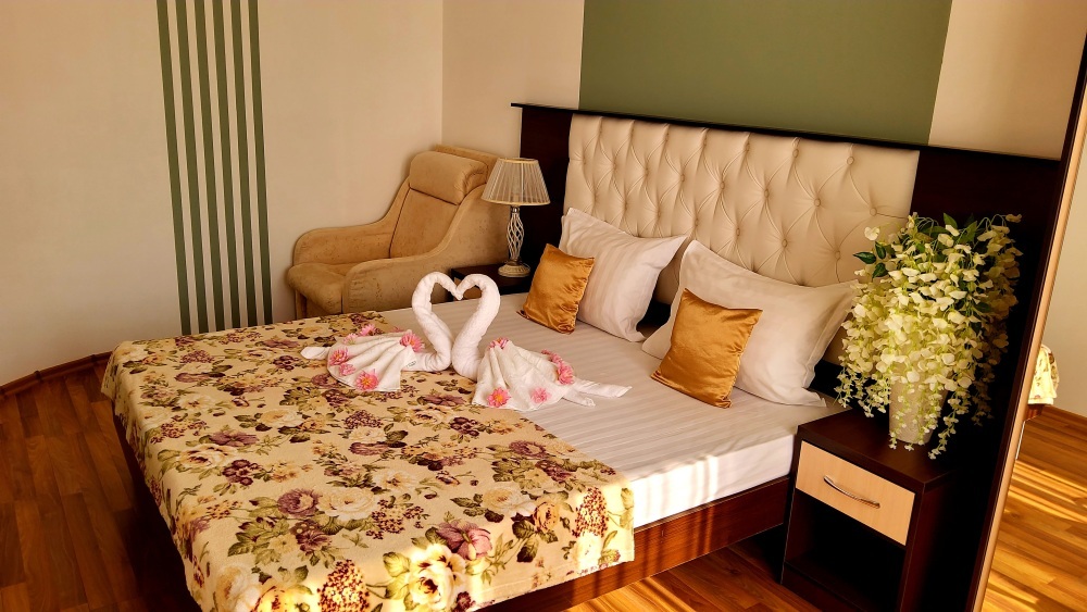 С панорамными окнами и собственной индивидуальной ванной комнатой рядом с комнатой (только для этой комнаты). В комнате так же имеется вместительный зеркальный шкаф плательный, 2 тумбочки, бра.