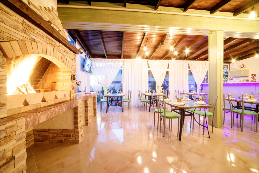 На территории дома работает столовая и вечернее кафе «Мангал-Хаус». Питание происходит на заказ, по меню. Работает в период с 01.06. по 30.09.
