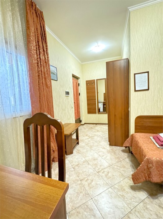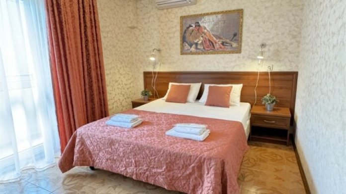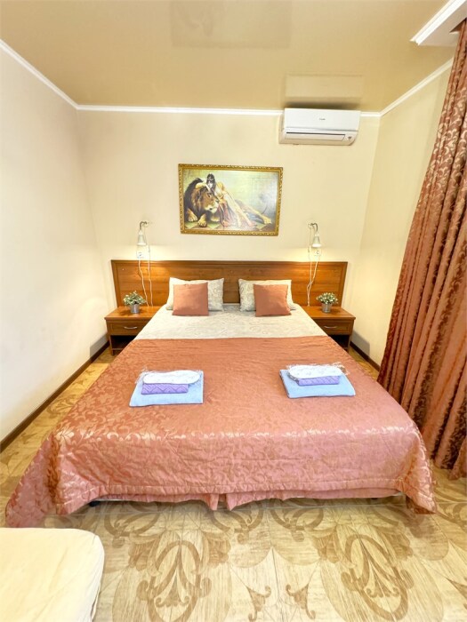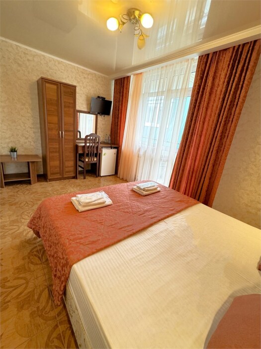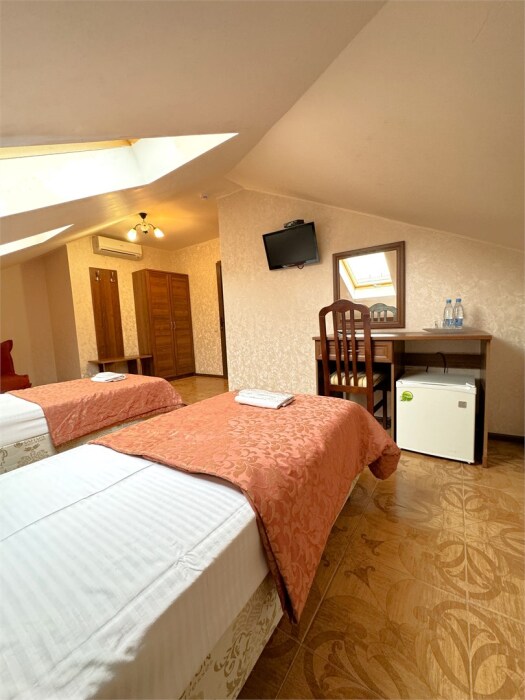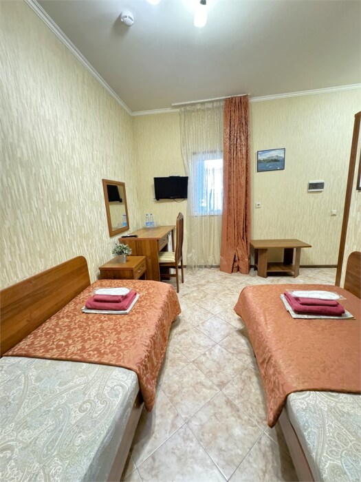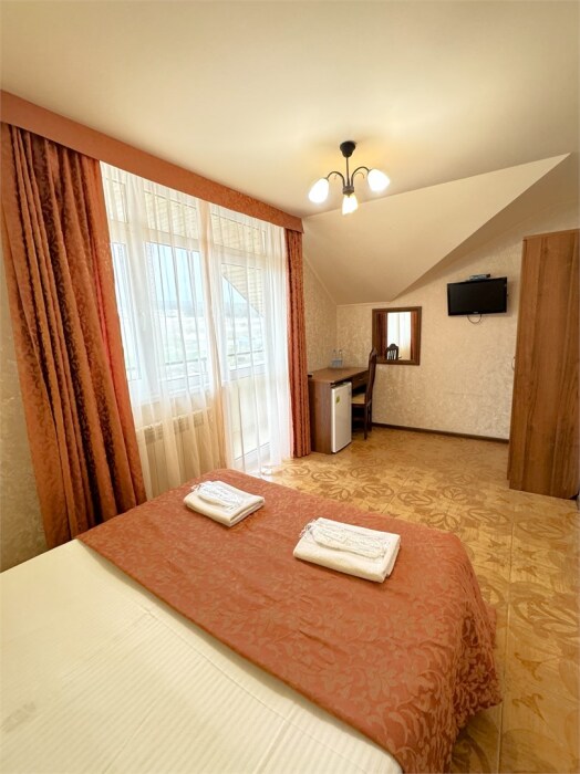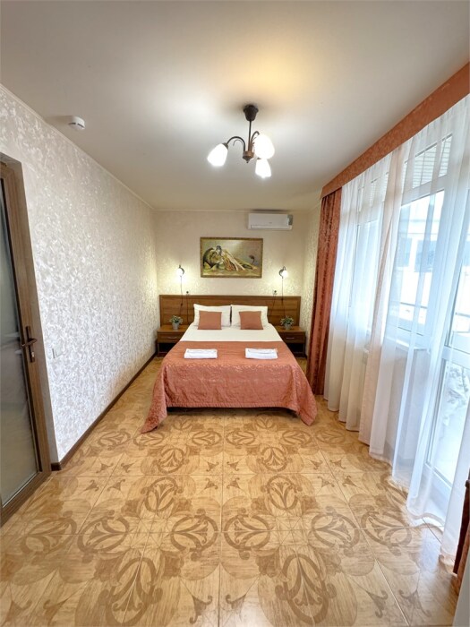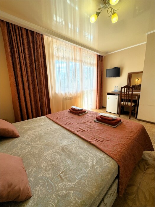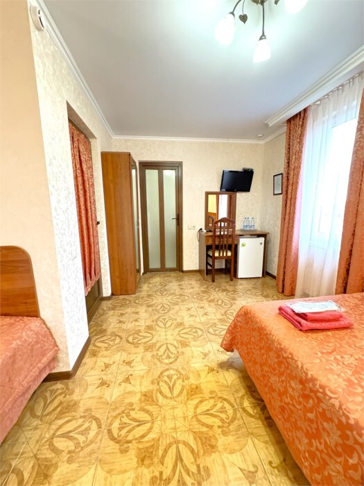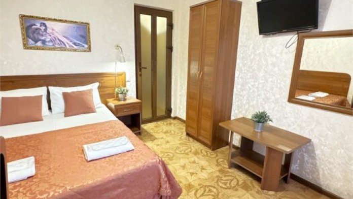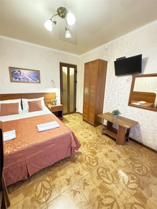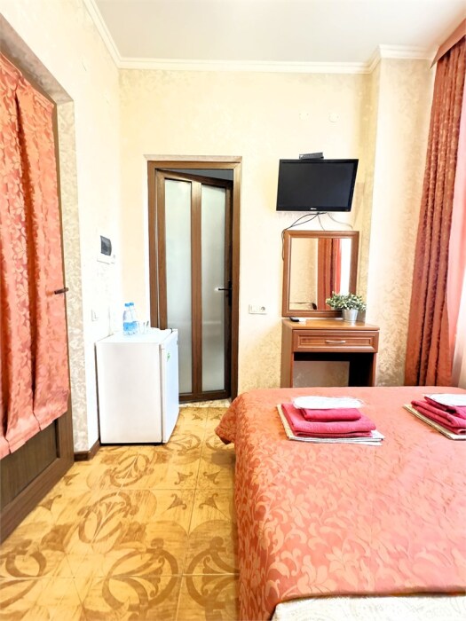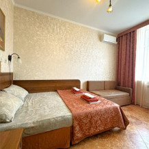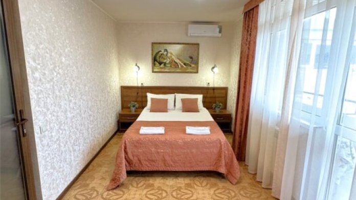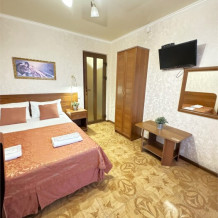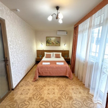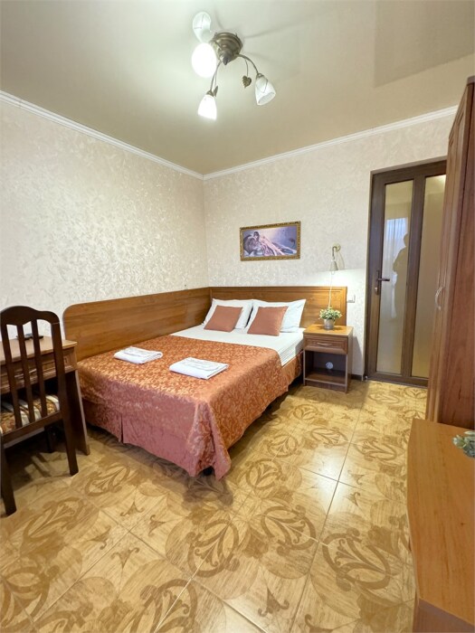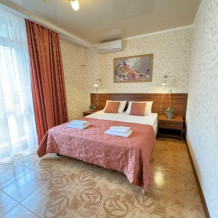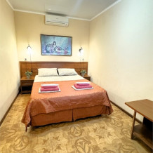 Уютный двухместный номер состоит из комнаты и санузла (общая площадь 12-14 м2). Номера данной категории расположены на 2 этаже. Номер оснащен двуспальной кроватью с ортопедическим матрасом, раскладным креслом, тумбочками, шкафом для одежды, туалетным столиком с зеркалом, журнальным столиком, мини-холодильником, кондиционером, телевизором с плоским экраном. Номер укомплектован постельным бельем, полотенцами. В ванной комнате, укомплектованной феном и набором туалетно-косметических принадлежностей, установлен душ.