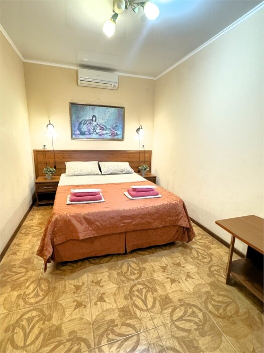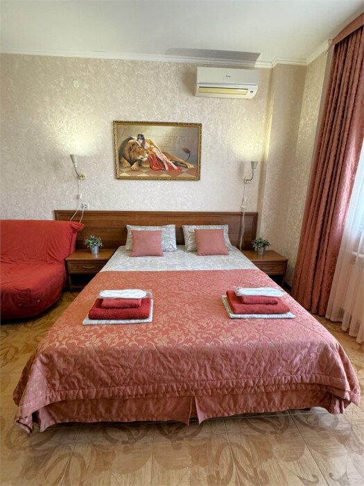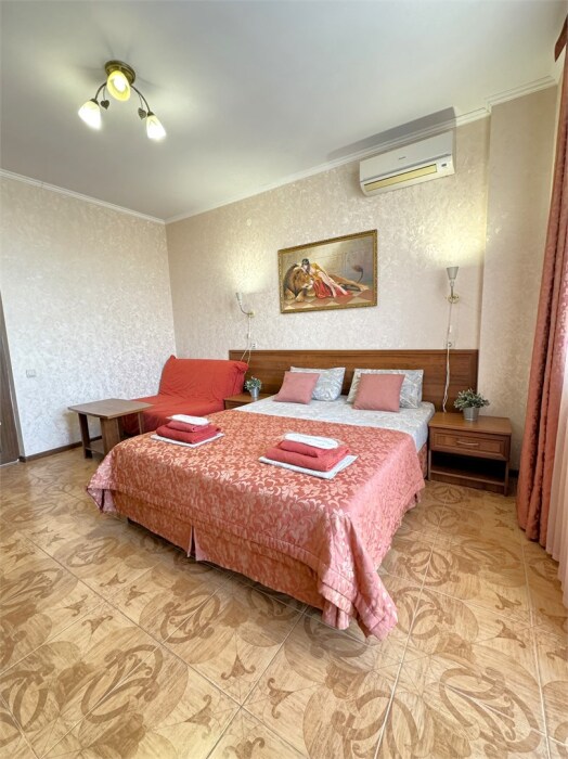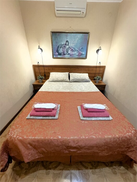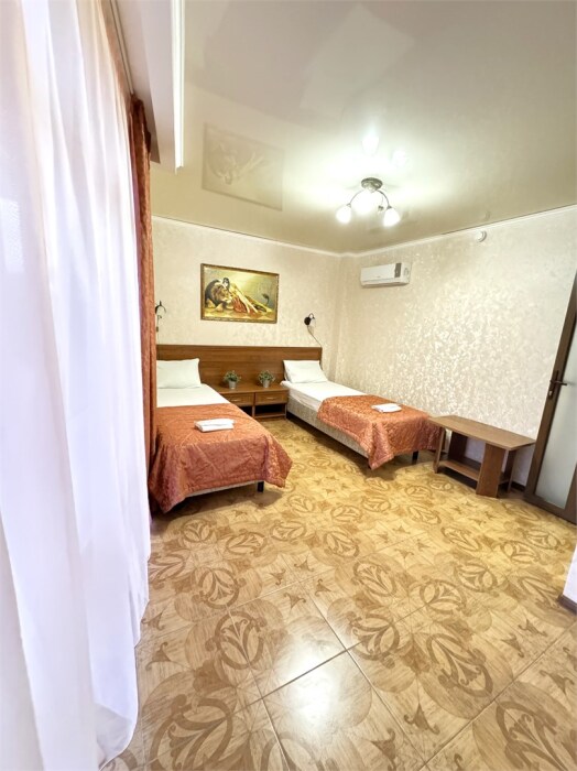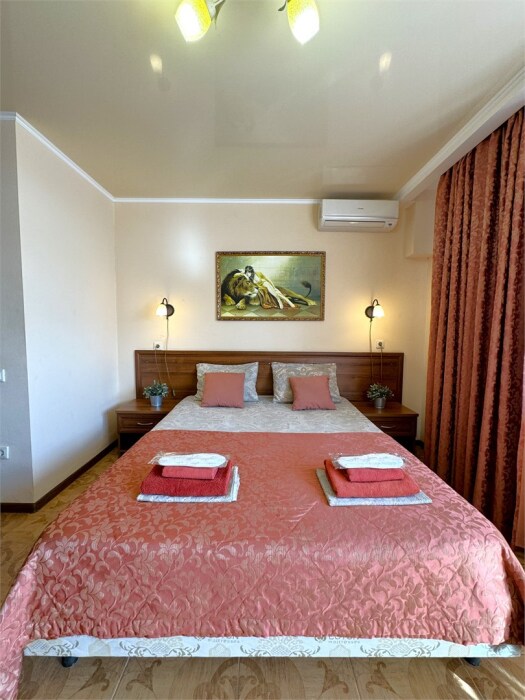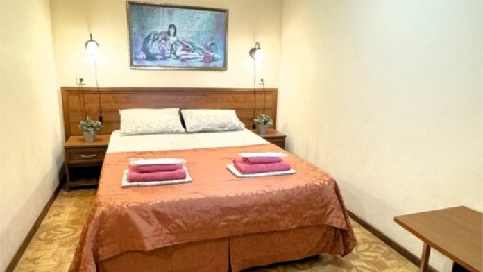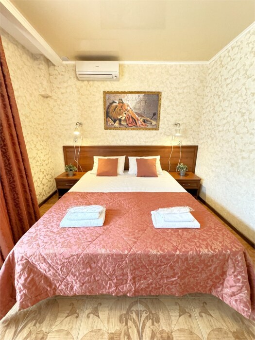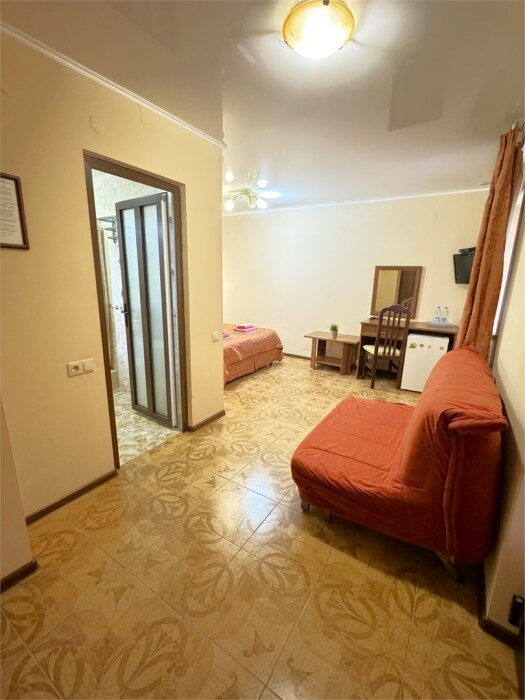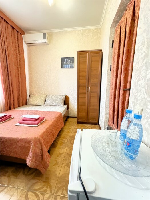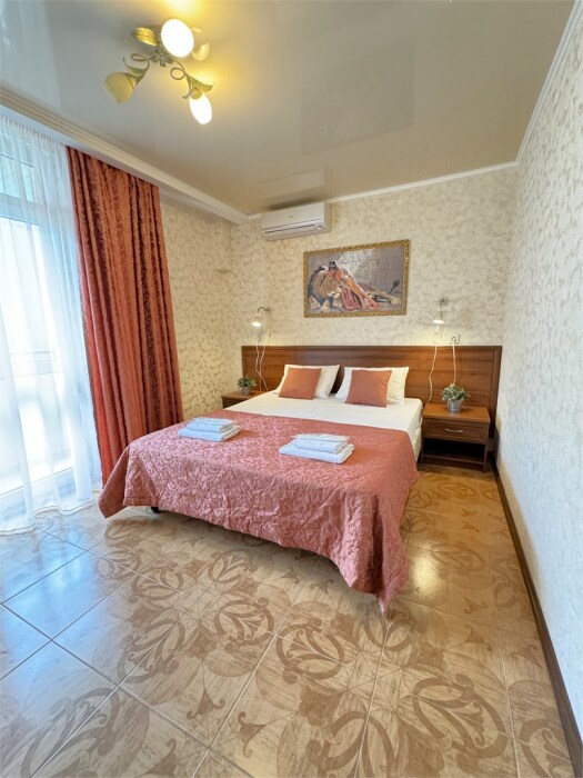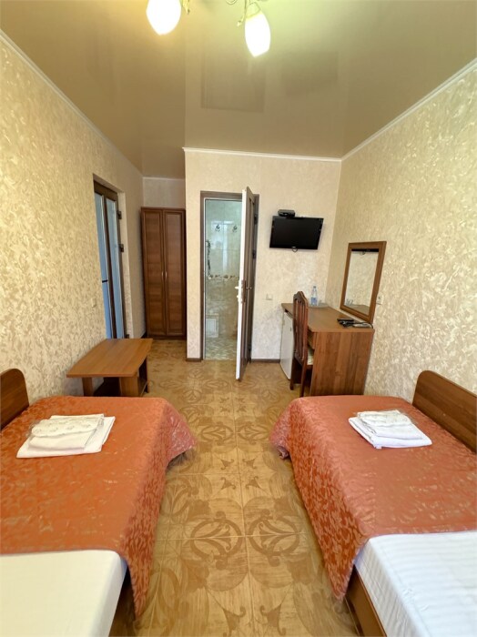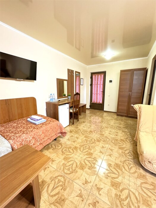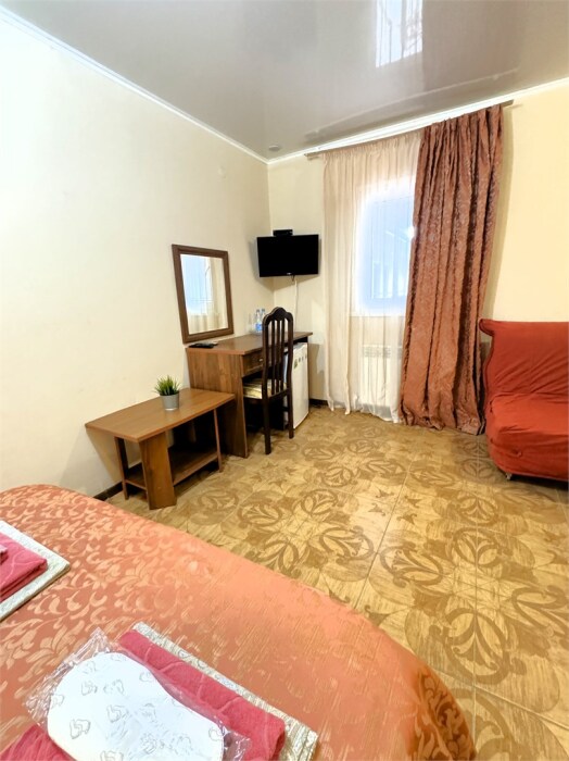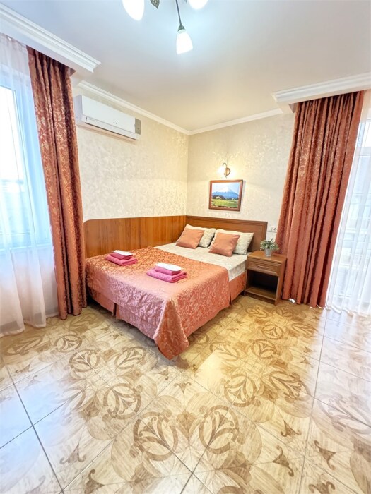 Уютный двухместный номер состоит из комнаты и санузла (общая площадь 12-14 м2). Номера данной категории расположены на 2 этаже. Номер оснащен двуспальной кроватью с ортопедическим матрасом, раскладным креслом, тумбочками, шкафом для одежды, туалетным столиком с зеркалом, журнальным столиком, мини-холодильником, кондиционером, телевизором с плоским экраном. Номер укомплектован постельным бельем, полотенцами. В ванной комнате, укомплектованной феном и набором туалетно-косметических принадлежностей, установлен душ.