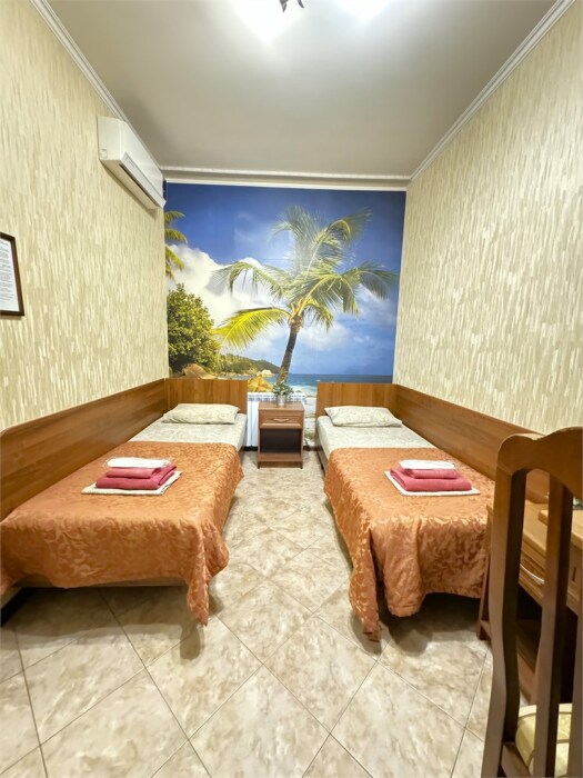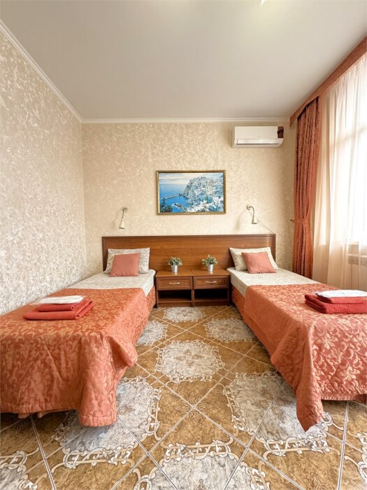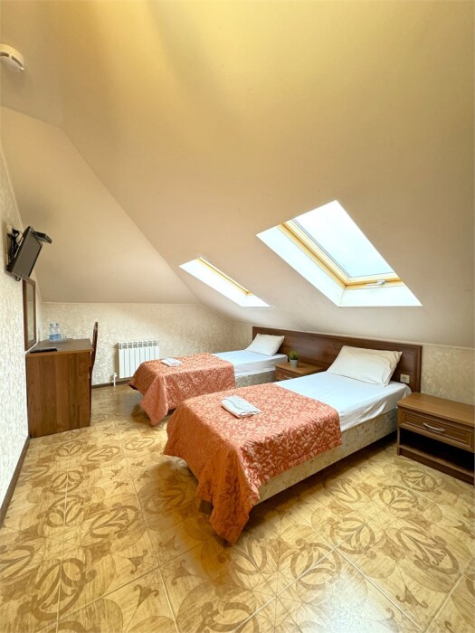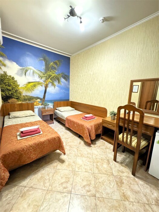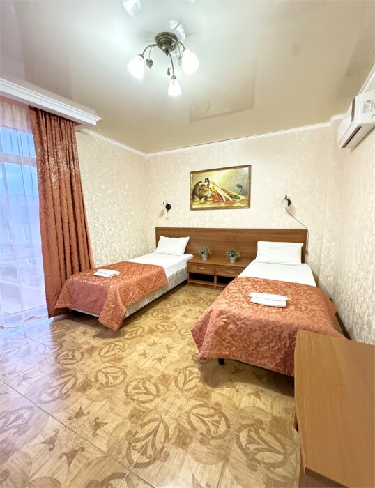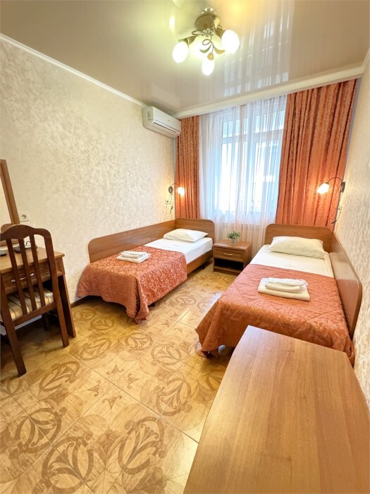 Уютный двухместный номер состоит из комнаты и санузла (общая площадь 12-14 м2). Номера данной категории расположены на 2 и 3 этажах. Окно выходит в атриум отеля. Номер оснащен двумя раздельными кроватями с ортопедическими матрасами, тумбочками, шкафом для одежды, туалетным столиком с зеркалом, журнальным столиком, мини-холодильником, кондиционером, телевизором с плоским экраном. Номер укомплектован постельным бельем, полотенцами. В ванной комнате, укомплектованной феном и набором туалетно-косметических принадлежностей, установлен душ.