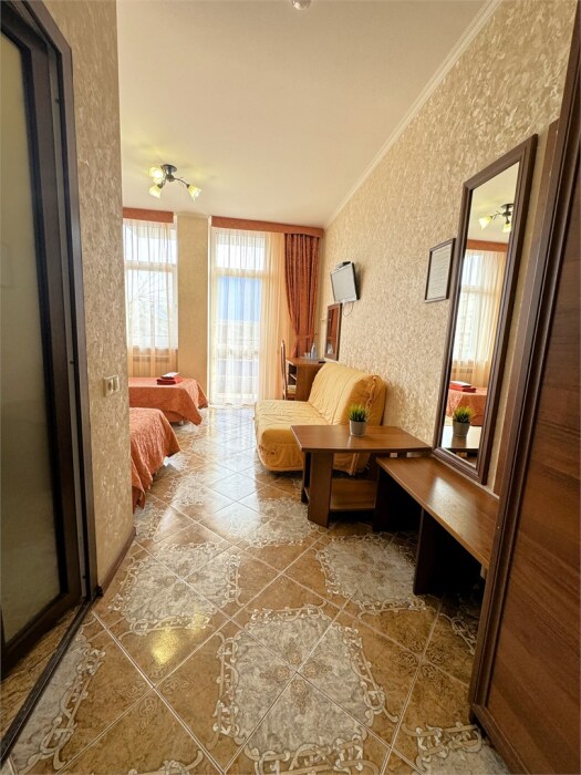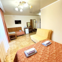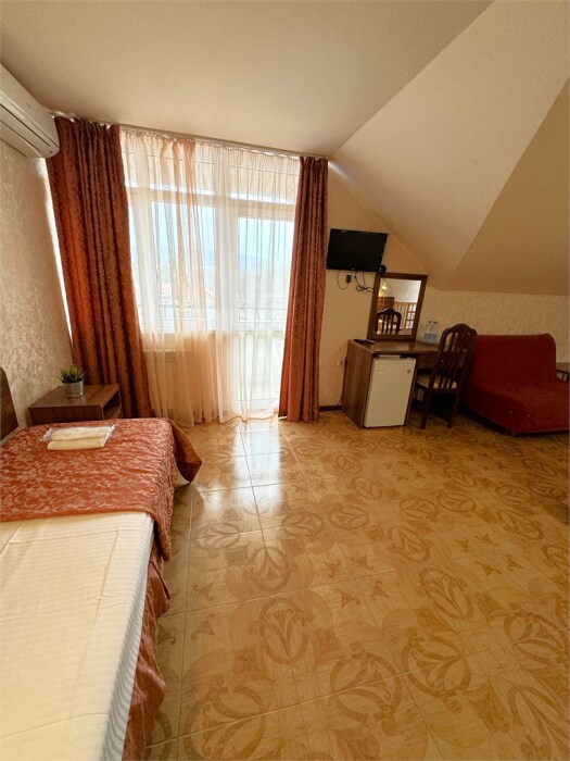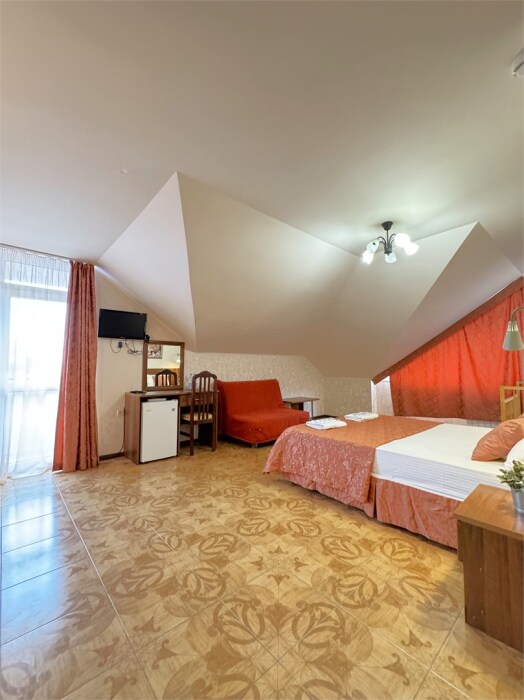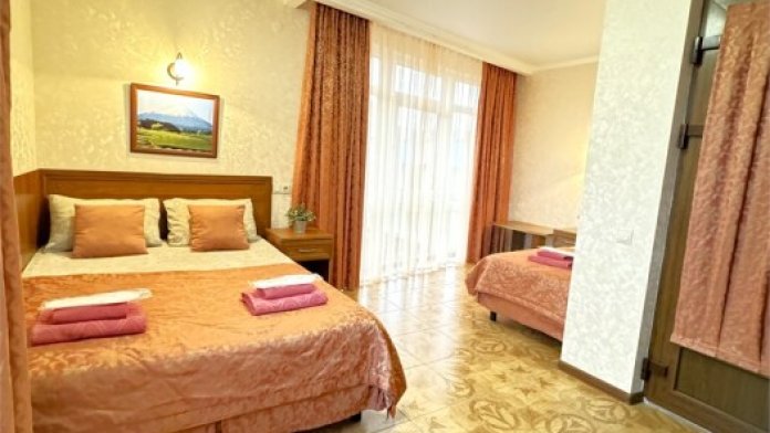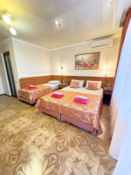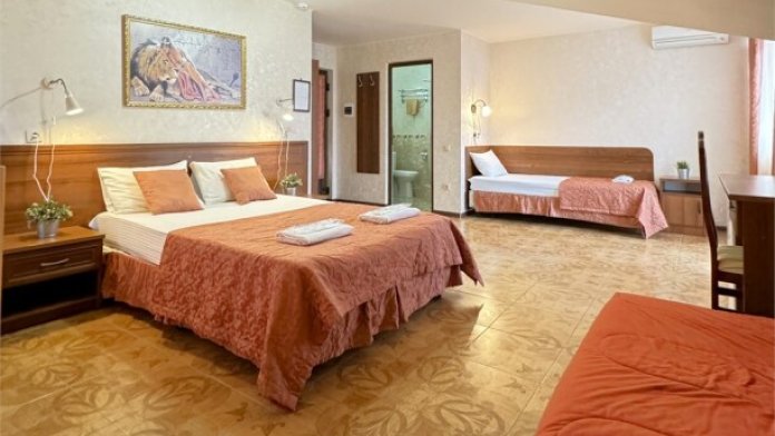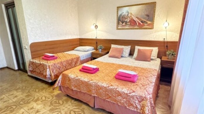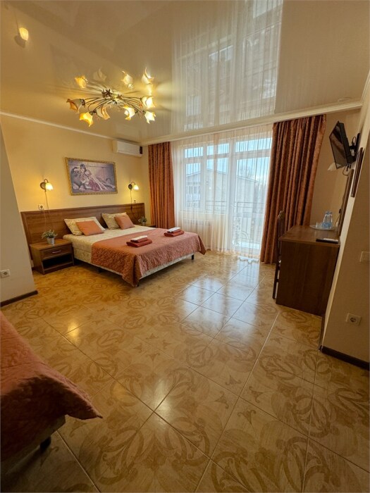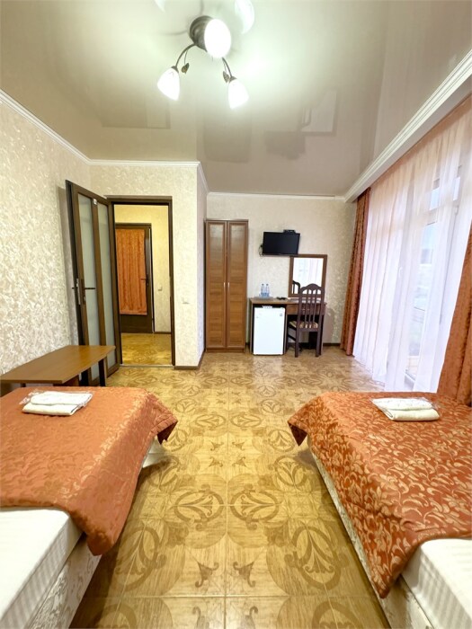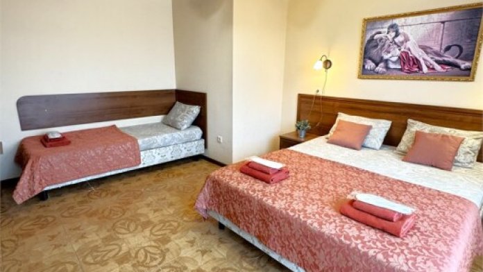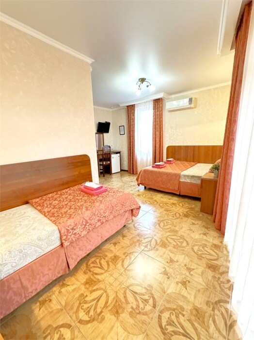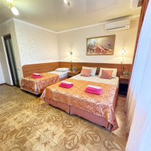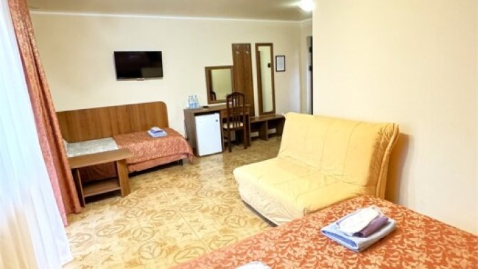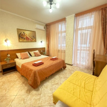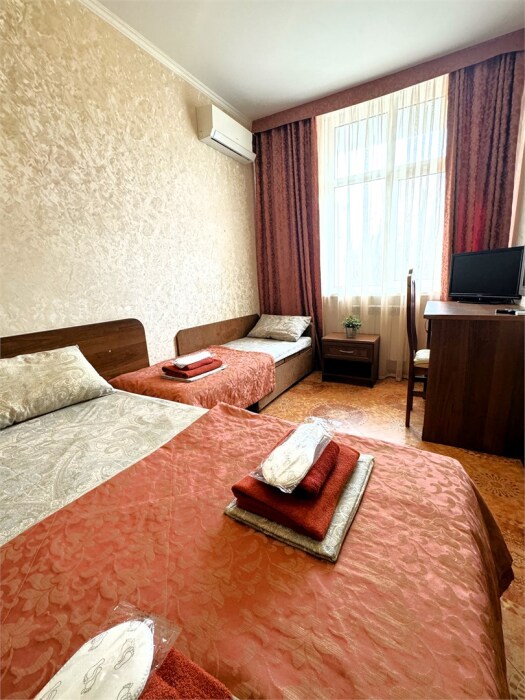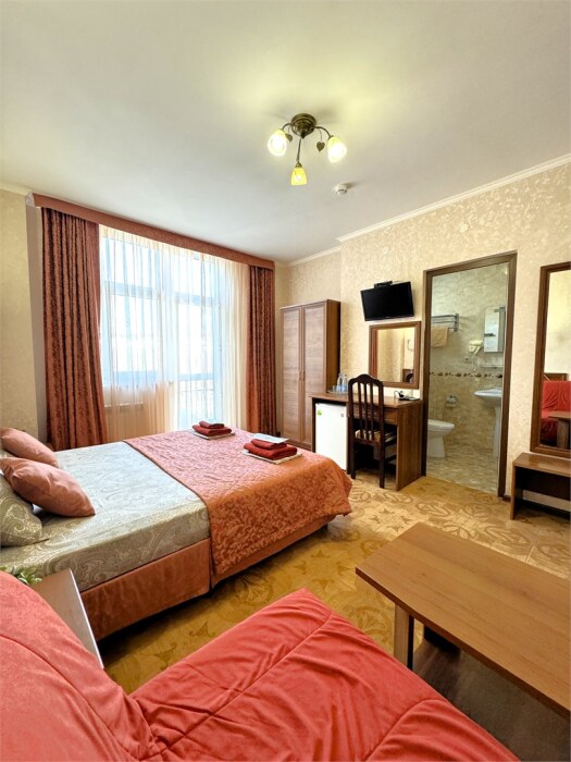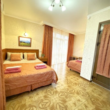 Комфортный трехместный номер с балконом состоит из комнаты и санузла (общая площадь 16м2). Номера данной категории расположены на 4 этаже. Номер оснащен двуспальной и односпальной кроватями с ортопедическими матрасами, тумбочками, шкафом для одежды, туалетным столиком с зеркалом, журнальным столиком, мини-холодильником, кондиционером, телевизором с плоским экраном. Номер укомплектован постельным бельем, полотенцами. В ванной комнате, укомплектованной феном и набором туалетно-косметических принадлежностей, установлен душ.