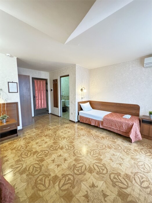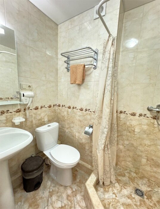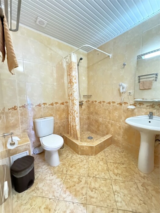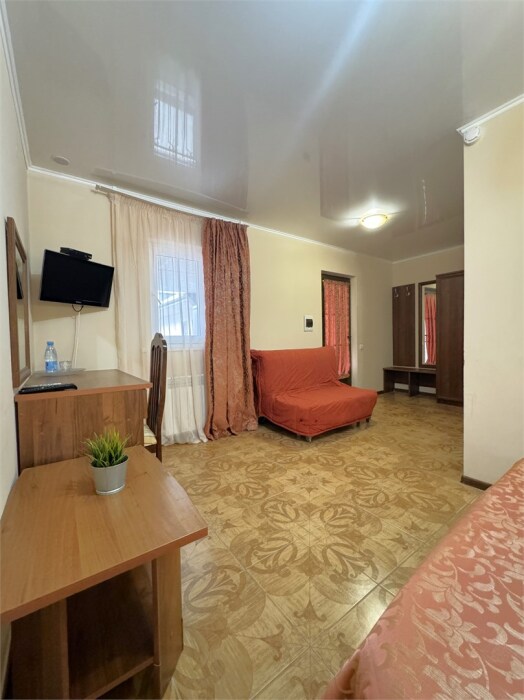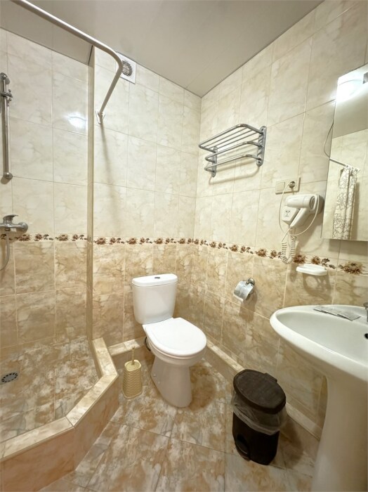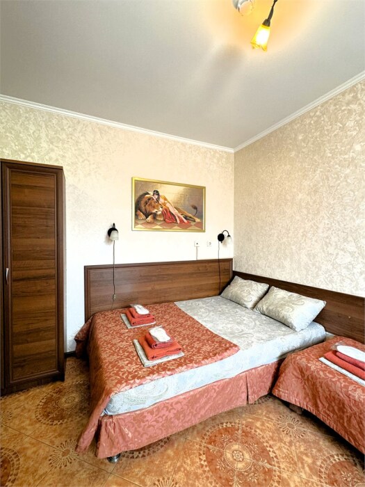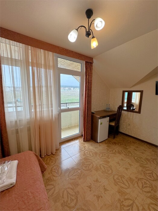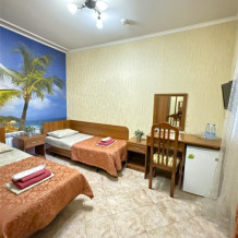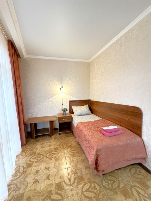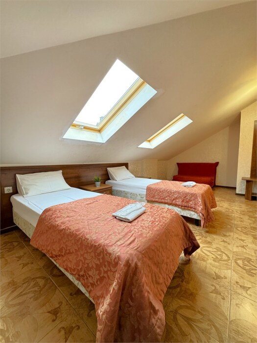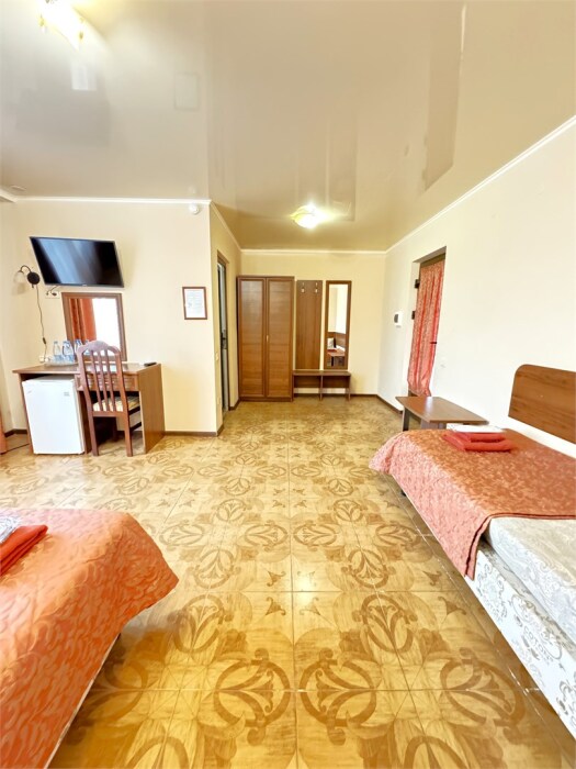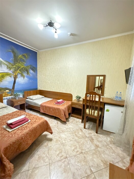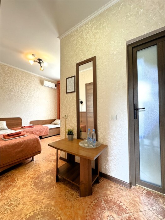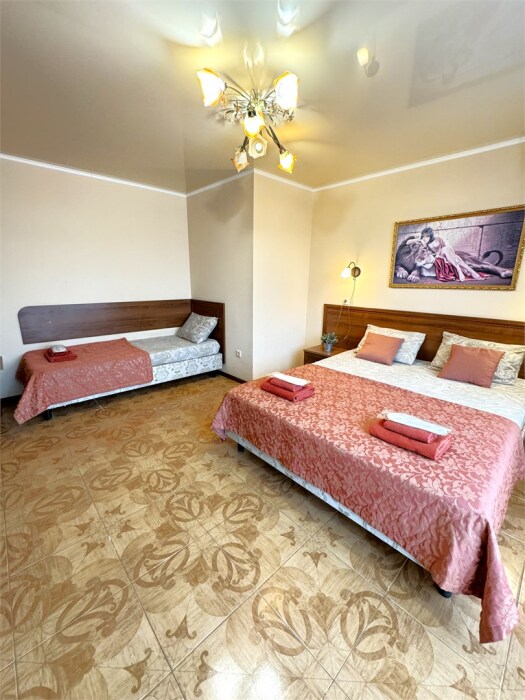 Комфортный трехместный номер с балконом состоит из комнаты и санузла (общая площадь 16м2). Номера данной категории расположены на 4 этаже. Номер оснащен двуспальной и односпальной кроватями с ортопедическими матрасами, тумбочками, шкафом для одежды, туалетным столиком с зеркалом, журнальным столиком, мини-холодильником, кондиционером, телевизором с плоским экраном. Номер укомплектован постельным бельем, полотенцами. В ванной комнате, укомплектованной феном и набором туалетно-косметических принадлежностей, установлен душ.