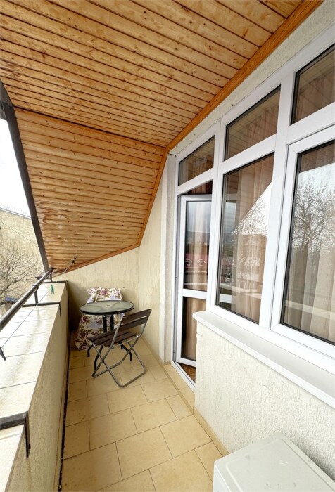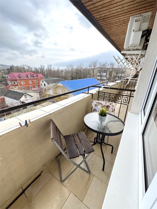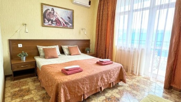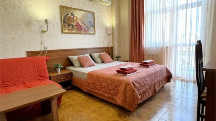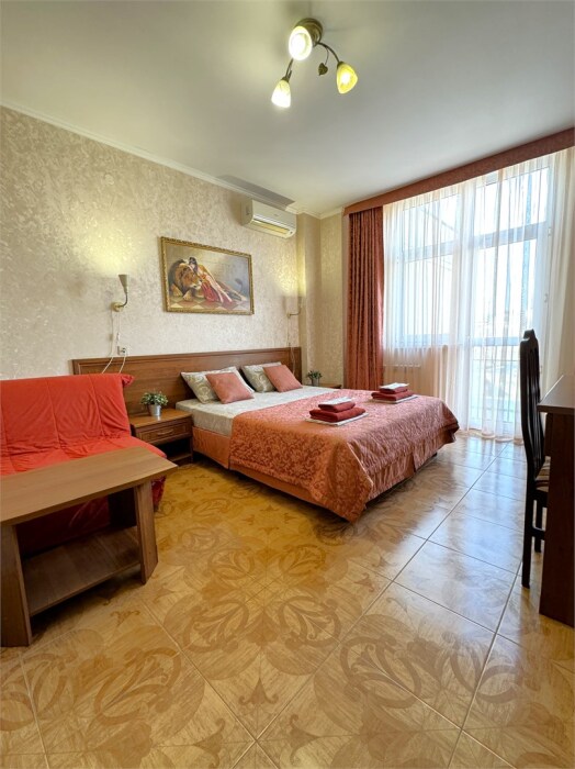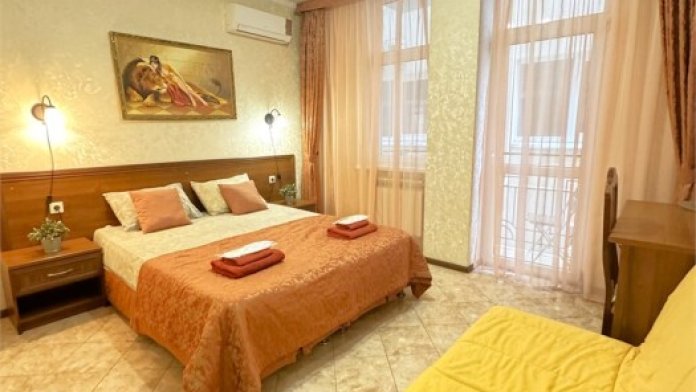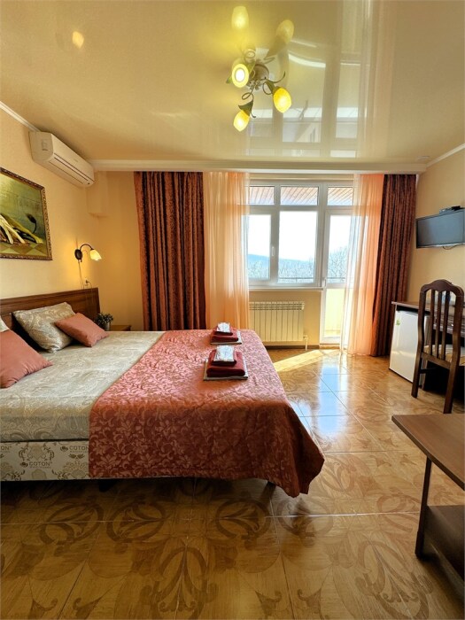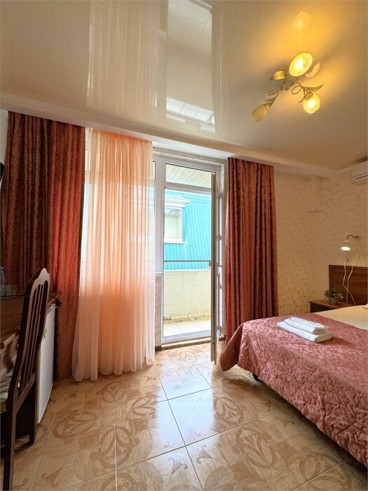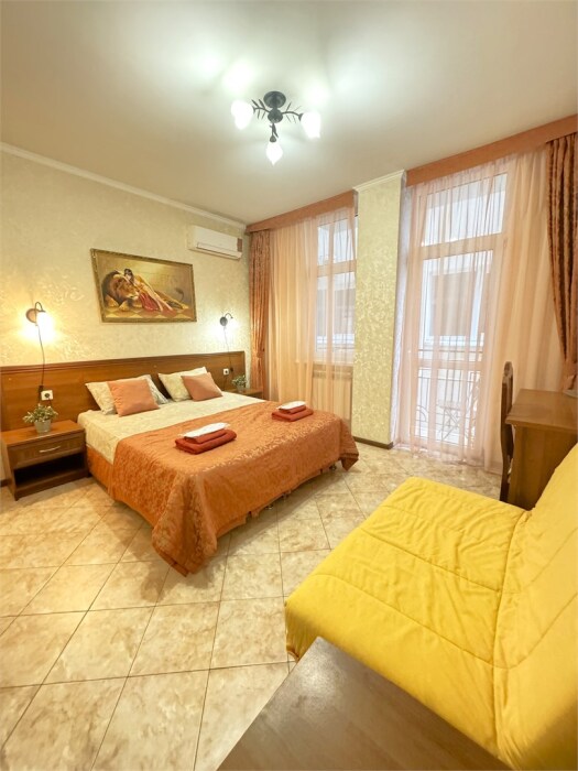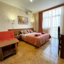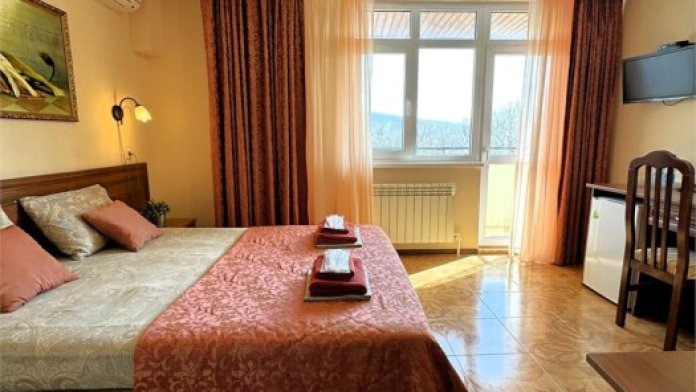 Комфортный двухместный номер с балконом состоит из комнаты и санузла (общая площадь 16-18 м2). Номера данной категории расположены на 2, 3 и 4 этажах. Номер оснащен двуспальной кроватью (или двумя односпальными) с ортопедическими матрасами и раскладным диваном (ширина 1,2 м), тумбочками, шкафом для одежды, туалетным столиком с зеркалом, журнальным столиком, мини-холодильником, кондиционером, телевизором с плоским экраном. Номер укомплектован постельным бельем, полотенцами. В ванной комнате, укомплектованной феном и набором туалетно-косметических принадлежностей, установлен душ.