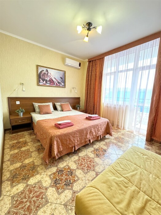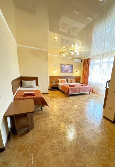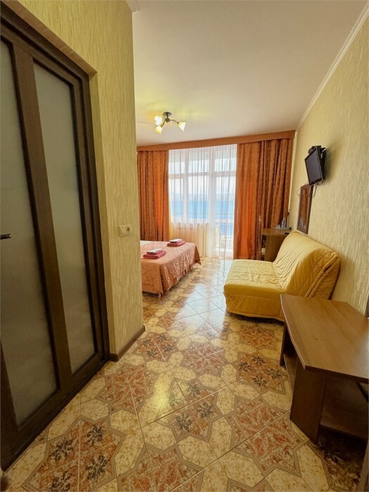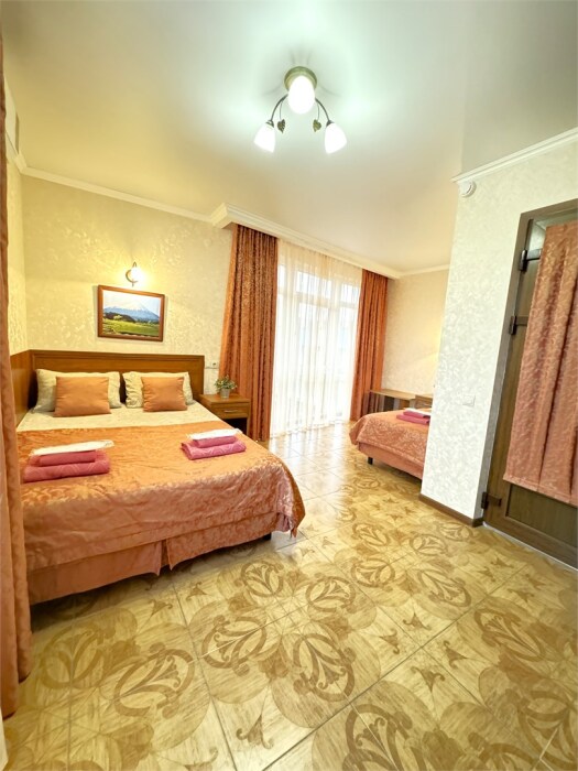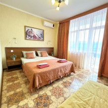 Комфортный трехместный номер с панорамными окнами состоит из комнаты и санузла (общая площадь 16-18 м2). Номера данной категории расположены на 4 этаже. Номер оснащен двуспальной и односпальной кроватями с ортопедическими матрасами, тумбочками, шкафом для одежды, туалетным столиком с зеркалом, журнальным столиком, мини-холодильником, кондиционером, телевизором с плоским экраном. Номер укомплектован постельным бельем, полотенцами. В ванной комнате, укомплектованной феном и набором туалетно-косметических принадлежностей, установлен душ.