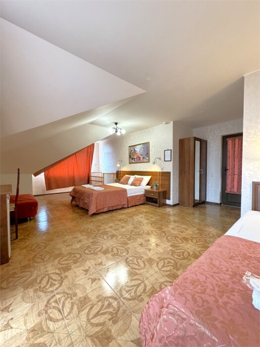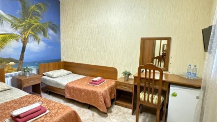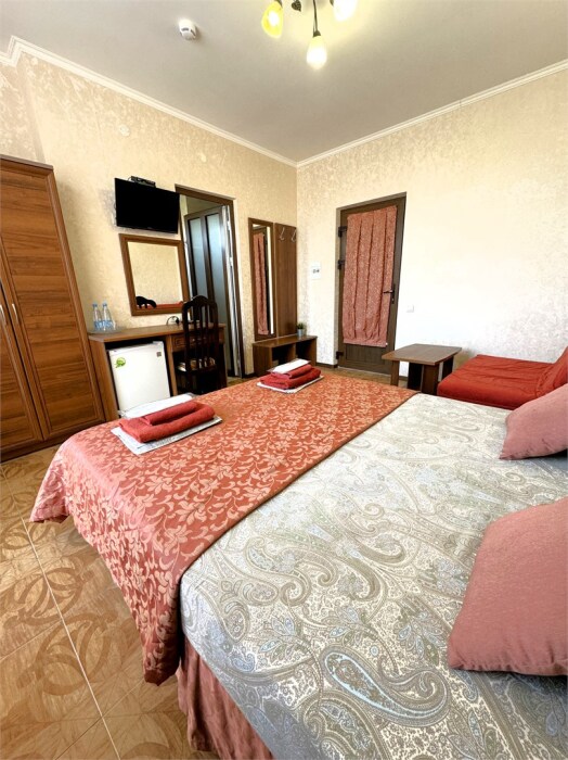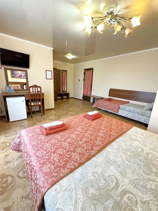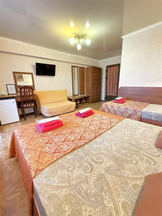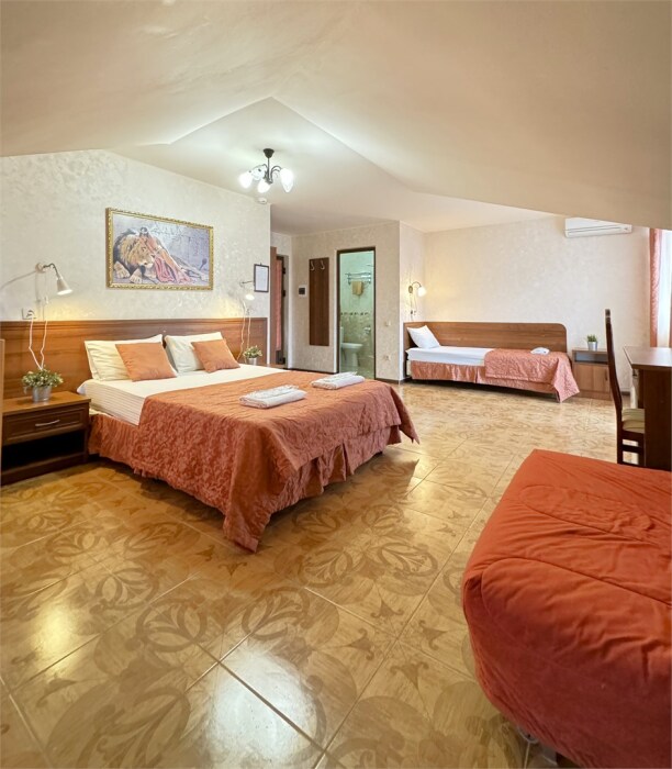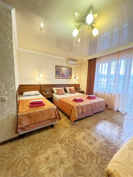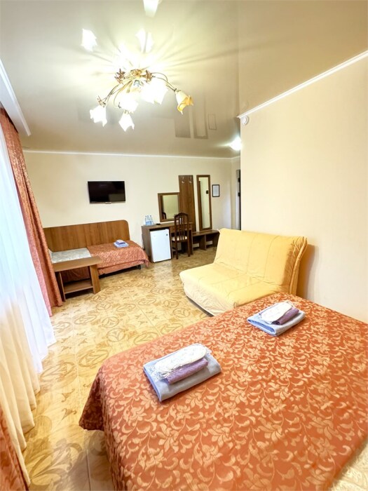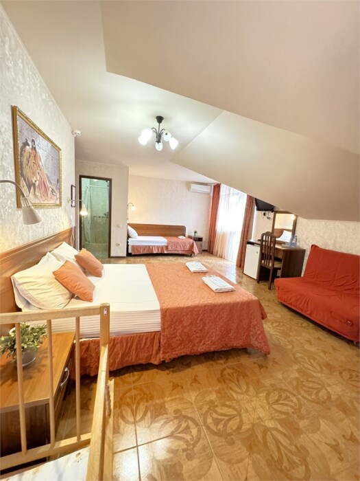 Номер оснащен двуспальной кроватью, двумя односпальными кроватями с ортопедическими матрасами и раскладным диваном (ширина 1,2 м), тумбочками, шкафом для одежды, туалетным столиком с зеркалом, журнальным столиком, мини-холодильником, кондиционером, телевизором с плоским экраном. Номер укомплектован постельным бельем, полотенцами. В ванной комнате, укомплектованной феном и набором туалетно-косметических принадлежностей, установлен душ.