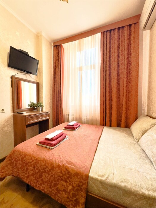 Уютный двухместный номер состоит из комнаты и санузла (общая площадь 14 м2). Номера данной категории расположены на 4 этаже. Окно выходит в атриум отеля. Номер оснащен двуспальной кроватью с ортопедическим матрасом, раскладным диваном (ширина 1,2м) , тумбочками, шкафом для одежды, туалетным столиком с зеркалом, журнальным столиком, мини-холодильником, кондиционером, телевизором с плоским экраном. Номер укомплектован постельным бельем, полотенцами. В ванной комнате, укомплектованной феном и набором туалетно-косметических принадлежностей, установлен душ.
