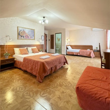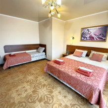 Состоит из коридора, двух комнат (общая площадь 30 м2) и двух санузлов (один санузел совмещенный, второй только душ). Номера данной категории расположены на 4 этаже. Номер оснащен двуспальной кроватью и двумя односпальными кроватями с ортопедическими матрасами. В каждой комнате: шкаф для одежды, тумбочки, туалетный столик с зеркалом, журнальный столик, мини-холодильник, кондиционер, телевизор с плоским экраном. Номер укомплектован постельным бельем, полотенцами. В ванной комнате, укомплектованной феном и набором туалетно-косметических принадлежностей, установлен душ.