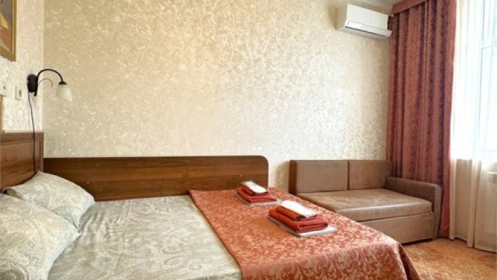Комфортный двухместный номер состоит из комнаты и санузла (общая площадь 16 м2). Номера данной категории расположены на 2, 3, 4 этажах. Номер оснащен двуспальной кроватью с ортопедическим матрасом и раскладным диваном (ширина 1,2 м), тумбочками, шкафом для одежды, туалетным столиком с зеркалом, журнальным столиком, мини-холодильником, кондиционером, телевизором с плоским экраном. Номер укомплектован постельным бельем, полотенцами. В ванной комнате, укомплектованной феном и набором туалетно-косметических принадлежностей, установлен душ.