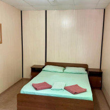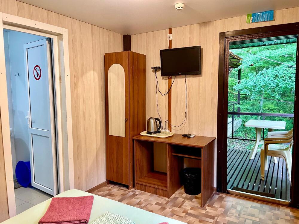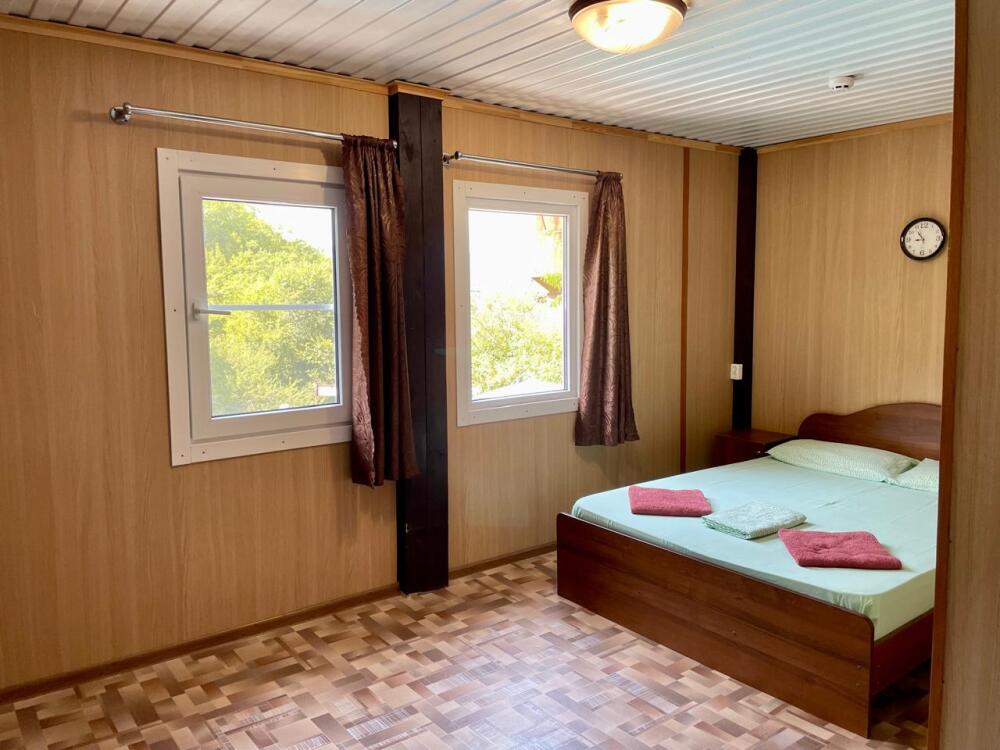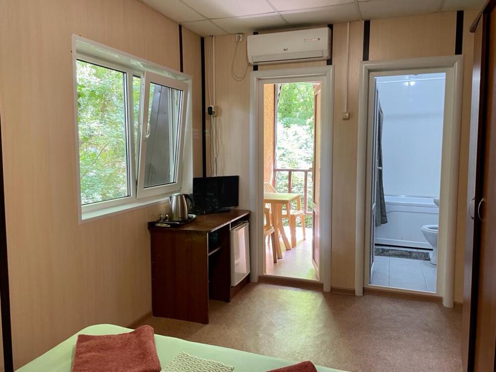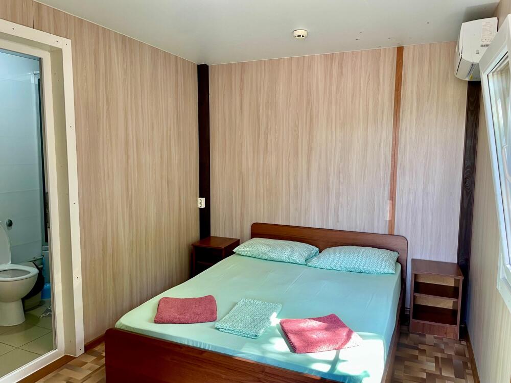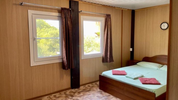 Двухместный номер с двуспальной кроватью и кондиционером, общая веранда на 2 номера. В номере: двуспальная кровать, душ, туалет, чайник, телевизор, кондиционер, холодильник на веранде (на 2 номера).