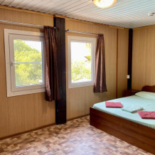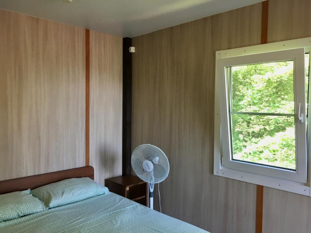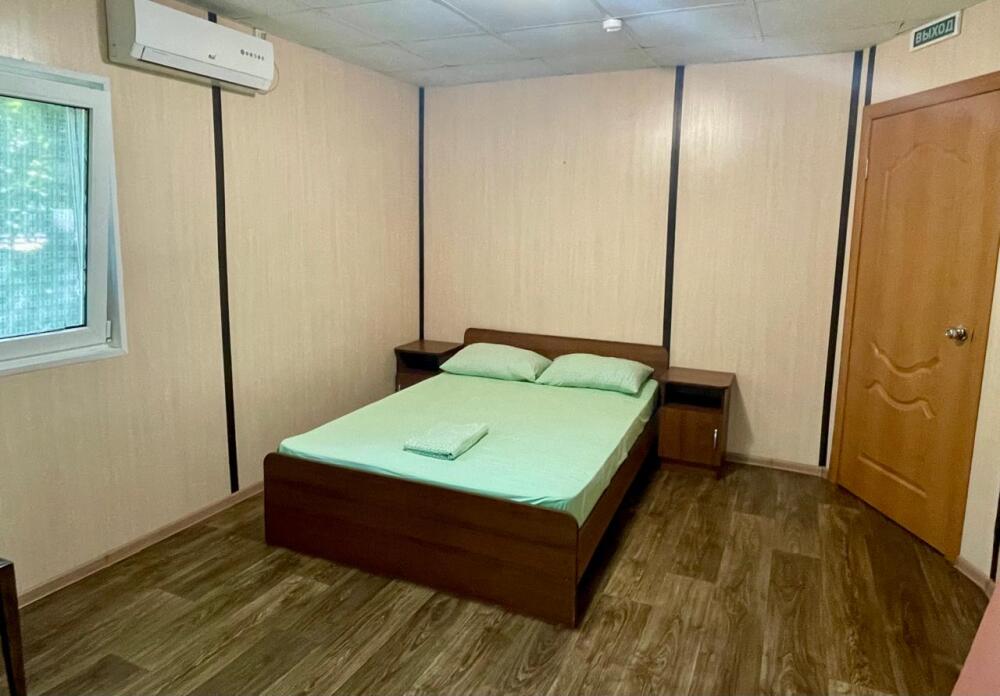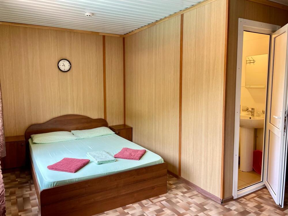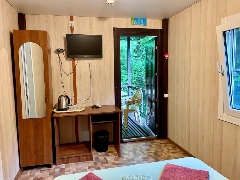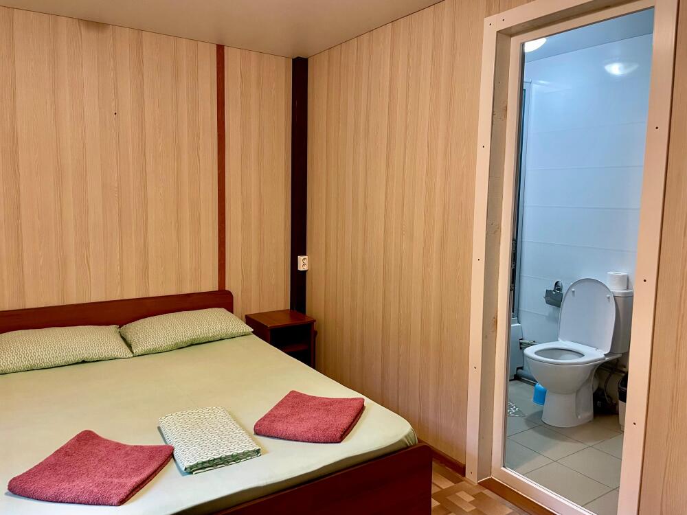 Двухместный номер с двуспальной кроватью и кондиционером, общая веранда на 2 номера. В номере: двуспальная кровать, душ, туалет, чайник, телевизор, кондиционер, холодильник на веранде (на 2 номера).