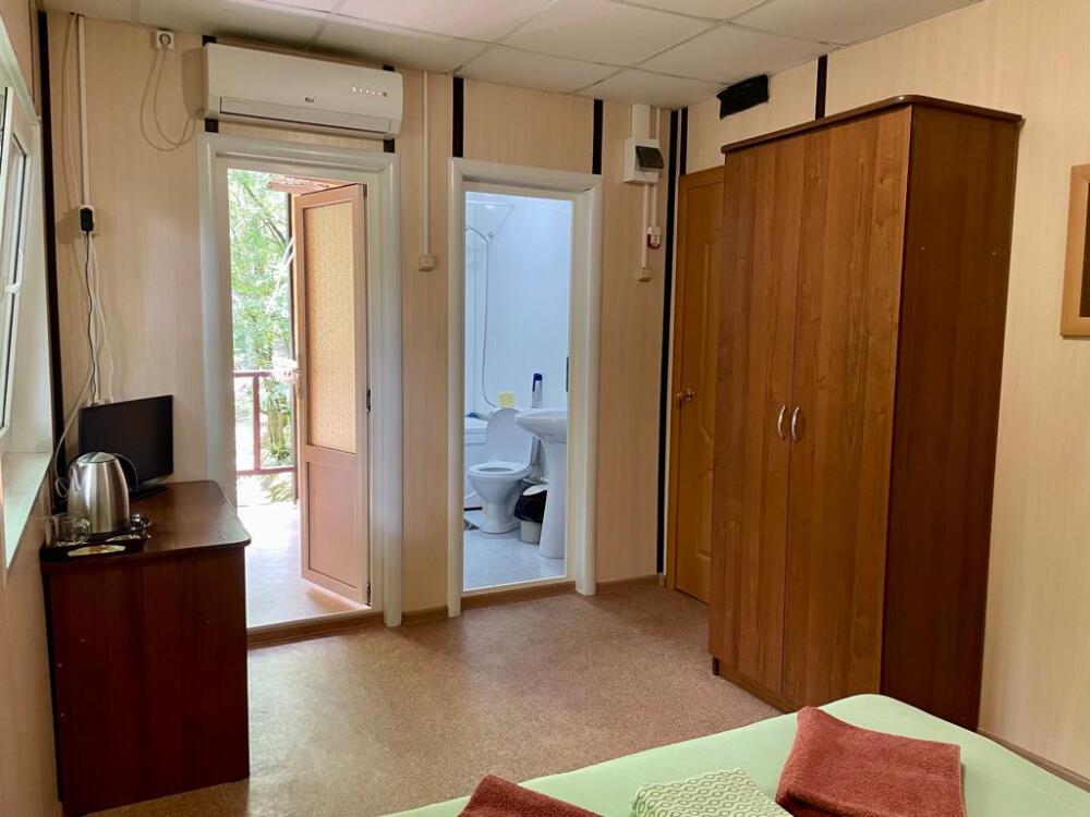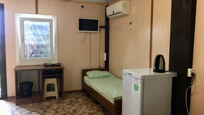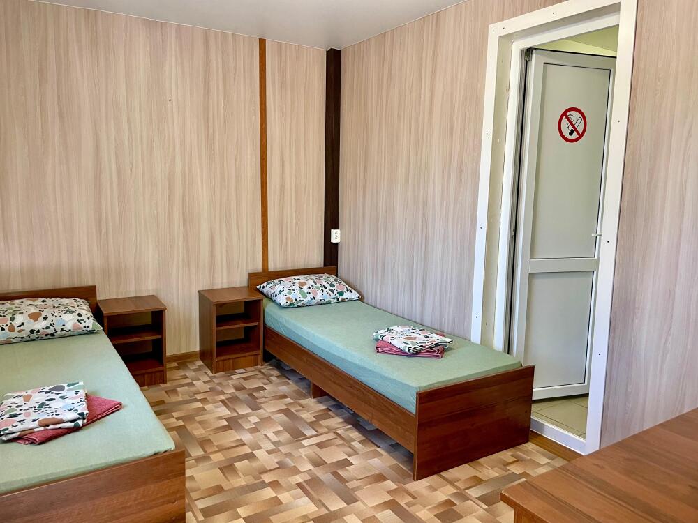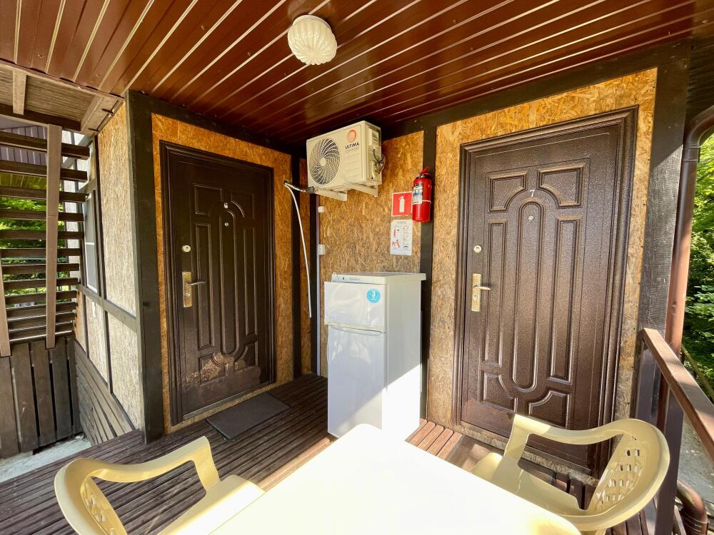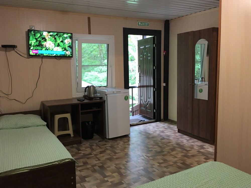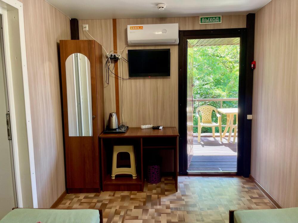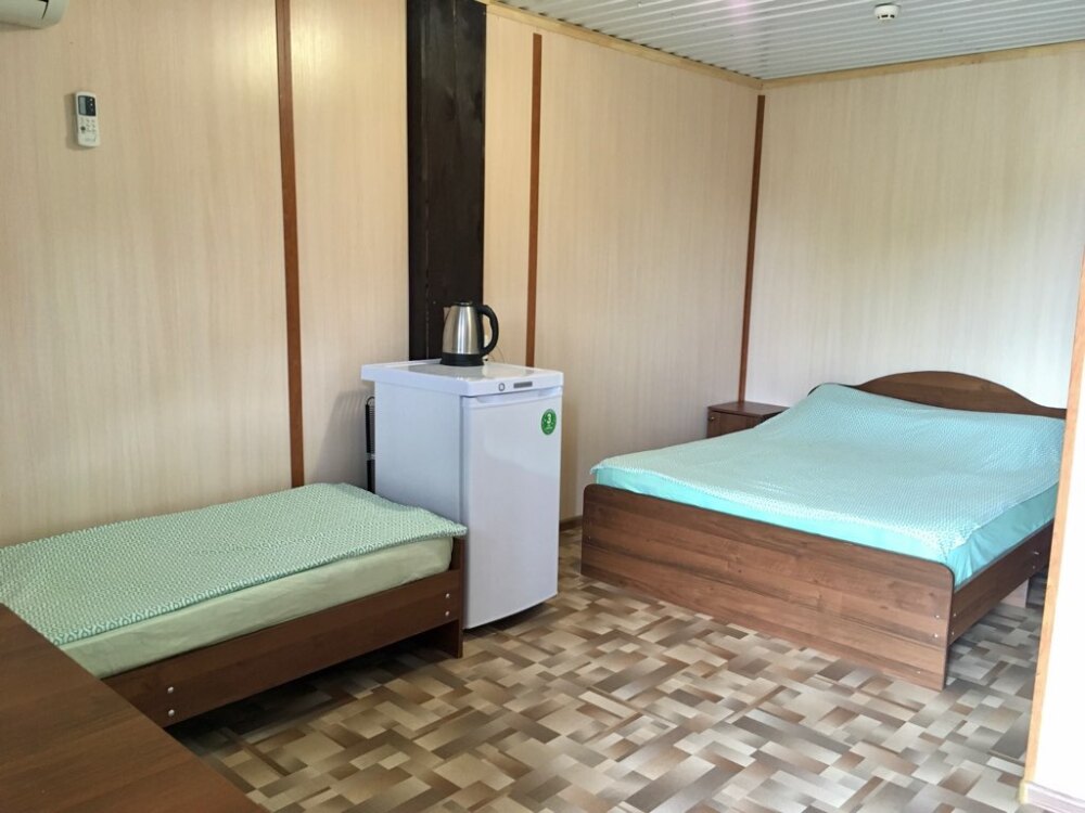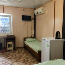 Двухместный номер с 2 односпальными кроватями и кондиционером, общая веранда на 2 номера. В номере: 2 односпальные кровати, душ, туалет, чайник, телевизор, кондиционер, холодильник на веранде (на 2 номера).