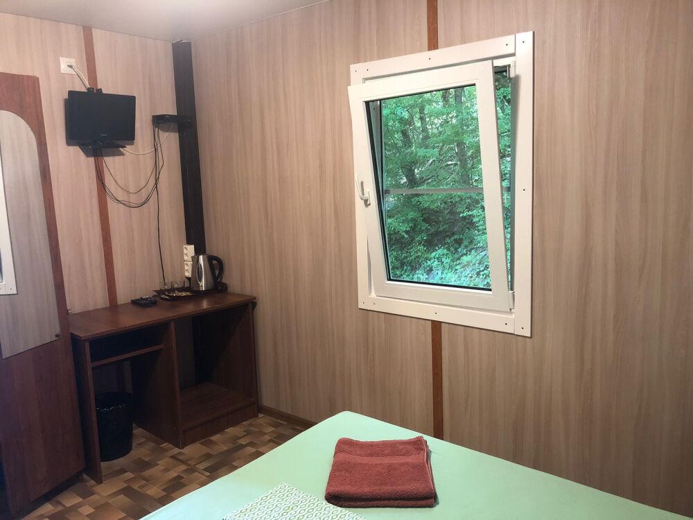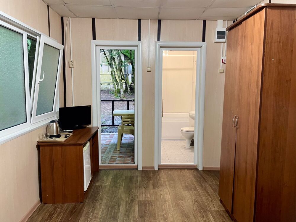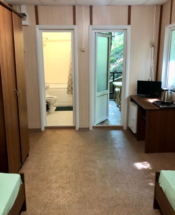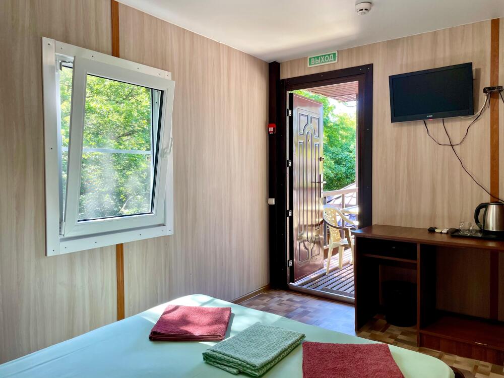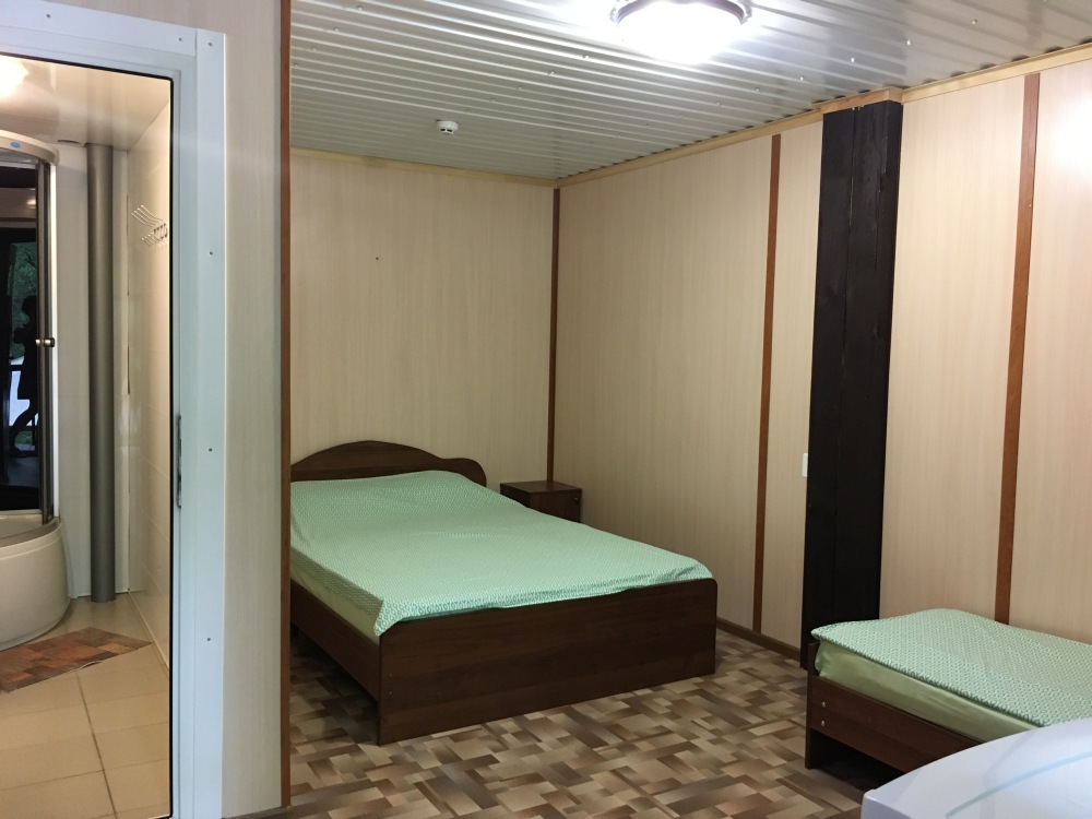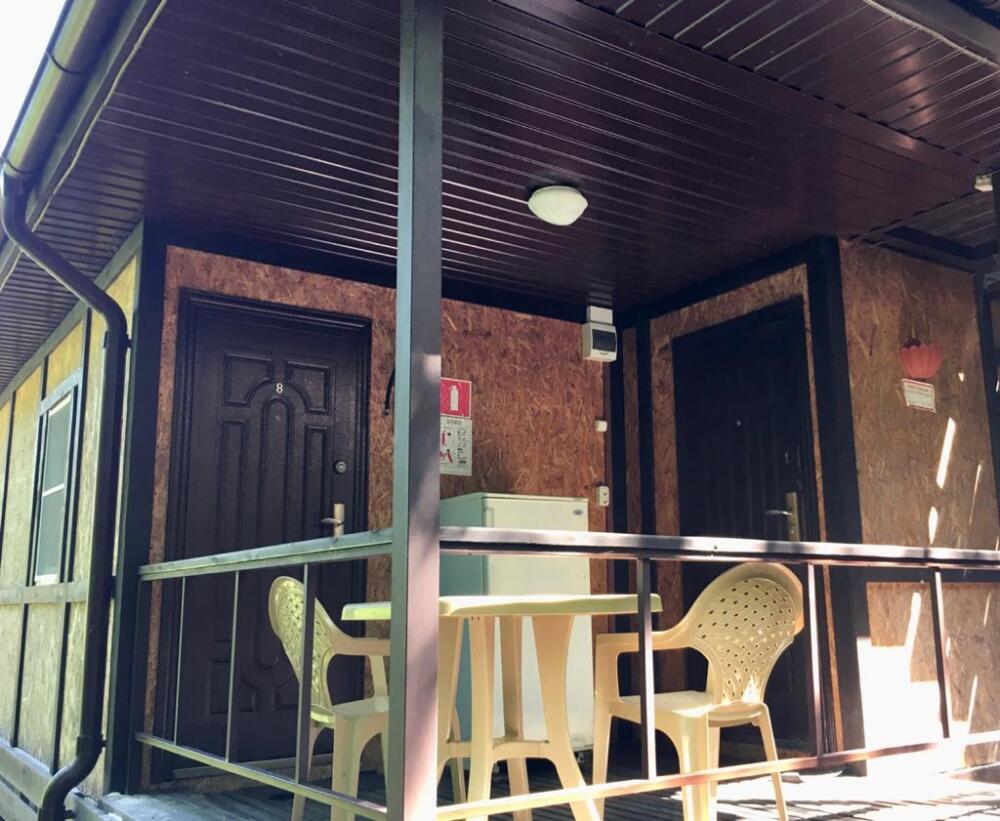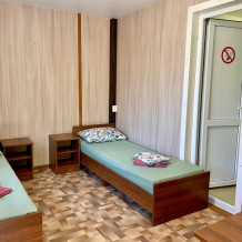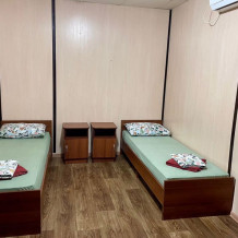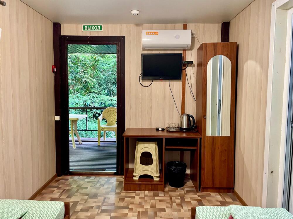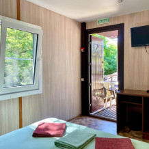 Двухместный номер с 2 односпальными кроватями и кондиционером, общая веранда на 2 номера. В номере: 2 односпальные кровати, душ, туалет, чайник, телевизор, кондиционер, холодильник на веранде (на 2 номера).